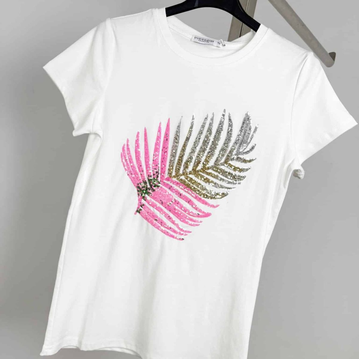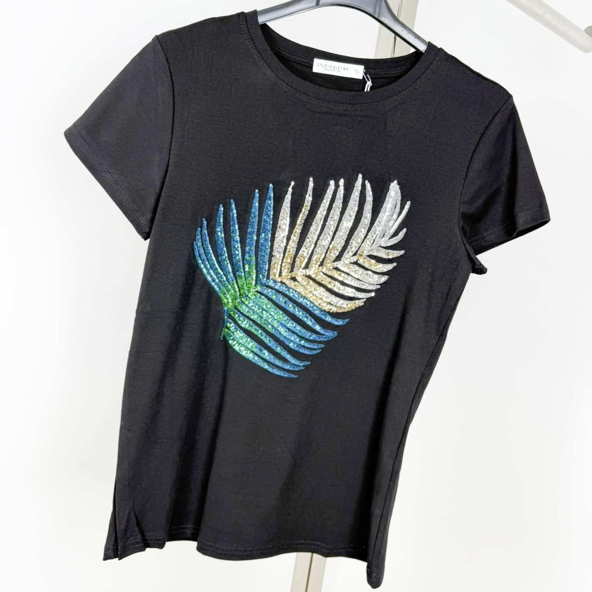 Add a touch of tropical elegance to your wardrobe with the Tropical Glam Sequin Palm T-Shirt. Featuring a stunning palm leaf design adorned with shimmering sequins in vibrant gradient colors, this t-shirt offers a chic and sophisticated look. Made from soft, breathable fabric, it ensures comfort while keeping you stylish. Available in classic black and white, with options in blue-green and pink-gold variations, this versatile tee pairs effortlessly with jeans, skirts, or shorts for a fresh and fashionable outfit. Perfect for adding a tropical vibe to your everyday style!