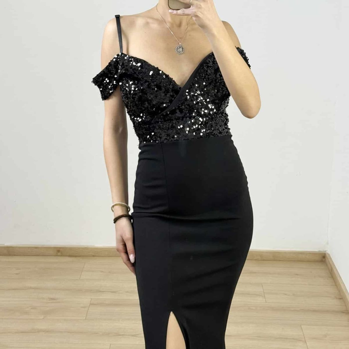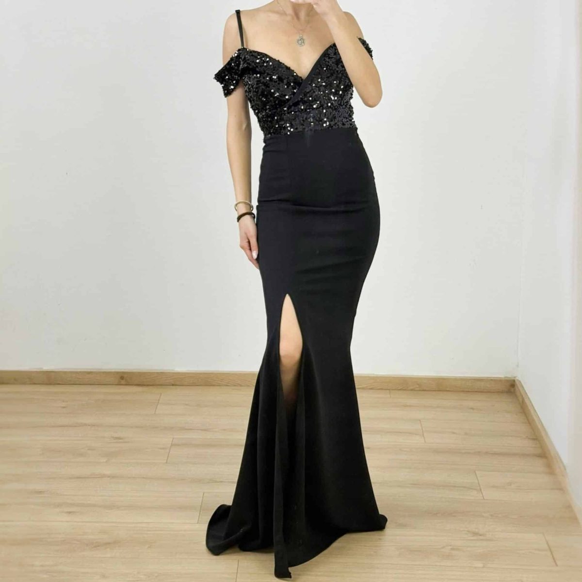 Make an unforgettable entrance in our Midnight Sparkle Off-Shoulder Gown. This stunning evening dress features a shimmering sequin bodice with a flattering sweetheart neckline and delicate off-the-shoulder straps. The figure-hugging silhouette cascades into a dramatic floor-length hem with a high side slit, perfect for showcasing your favorite heels. Designed for gala nights, formal occasions, and black-tie events, this dress blends timeless glamour with modern elegance.