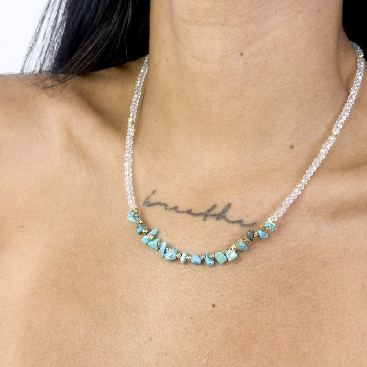 Elevate your summer style with this delicate beaded necklace featuring natural turquoise stones paired with clear crystal beads and subtle golden accents. Its lightweight design makes it perfect for everyday wear while adding a touch of elegance and boho charm to any outfit.