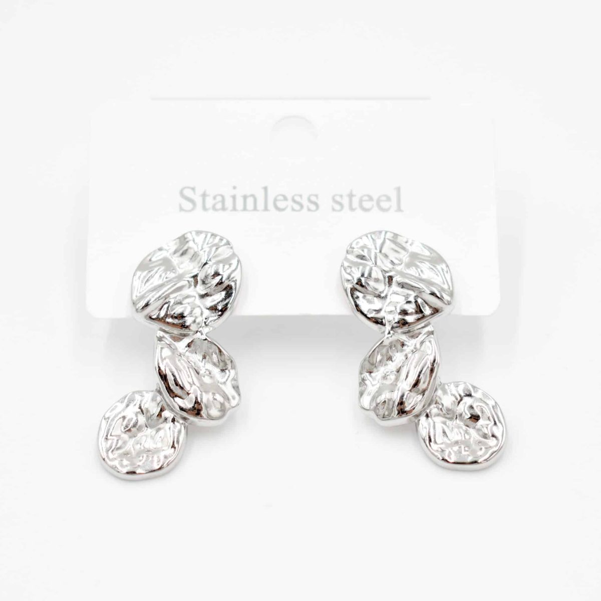 Elevate your style with these modern Abstract Textured Triple Disc Earrings in high-polish silver stainless steel. Featuring a unique, organic hammered design, each earring showcases three interlinked discs that catch the light from every angle. Lightweight yet bold, they add a statement touch to both casual and formal looks. Crafted from hypoallergenic stainless steel for durability and comfort, these earrings are perfect for everyday wear or special occasions.