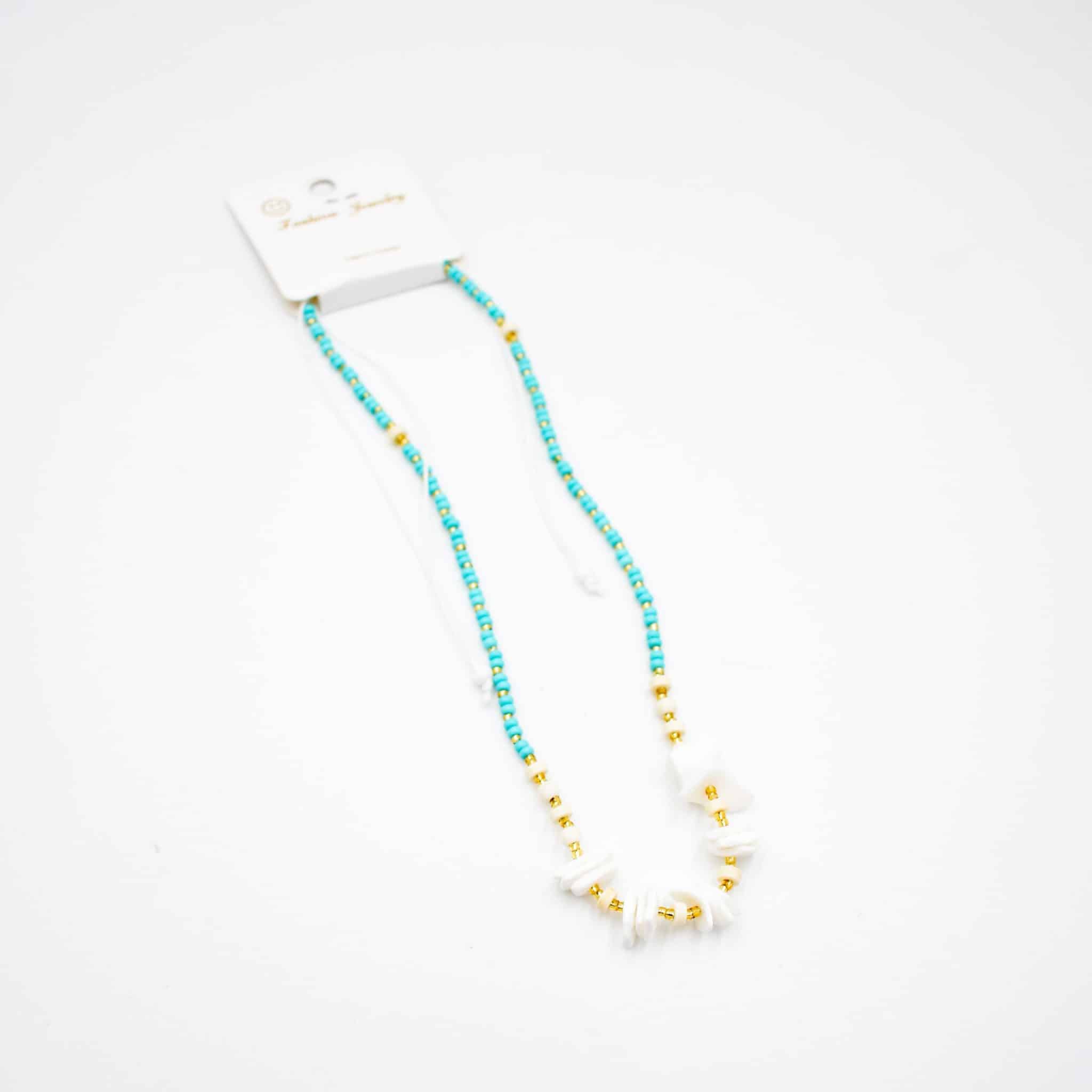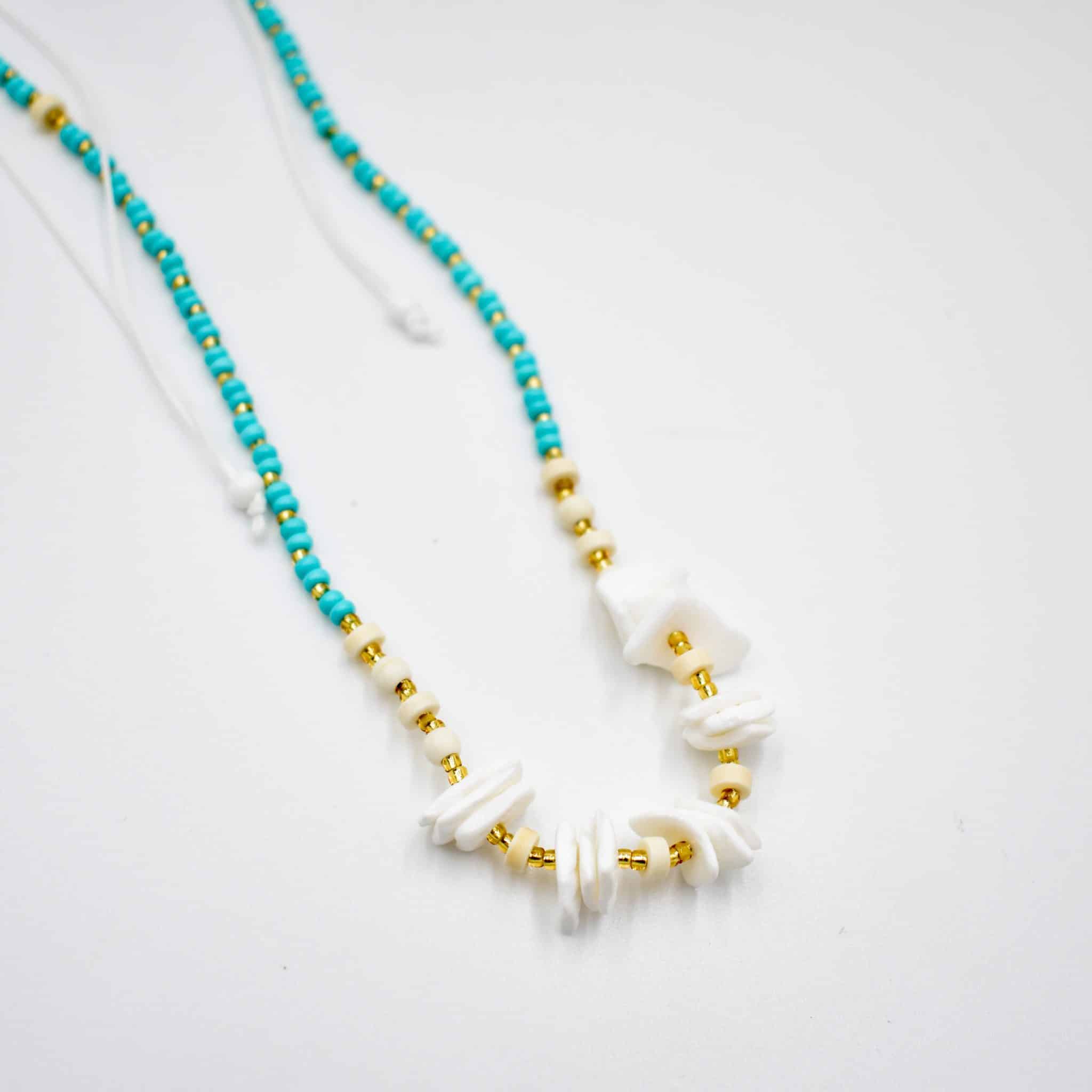 Channel Mediterranean vibes with this turquoise and gold beaded necklace, finished with natural white shell accents.