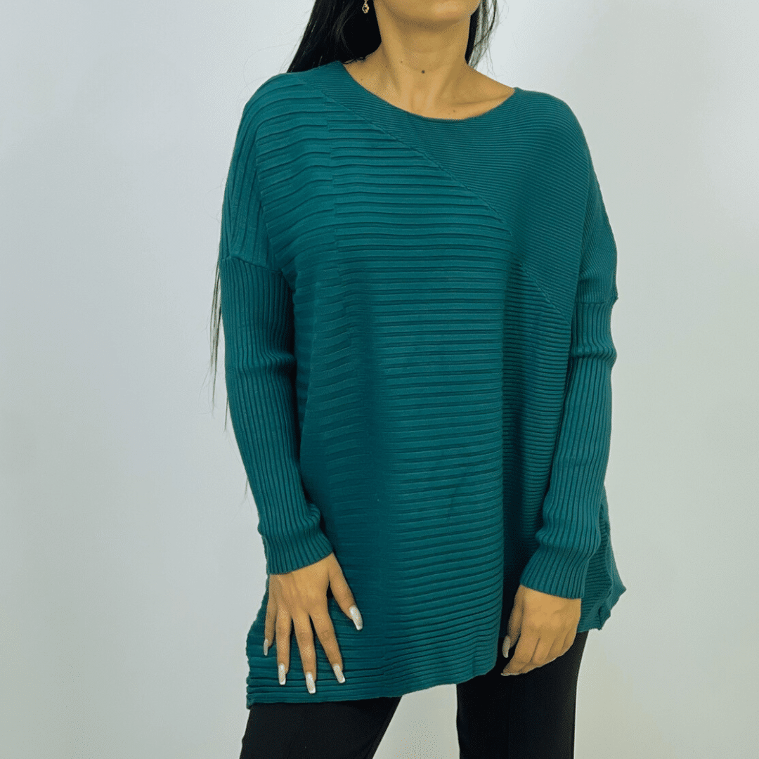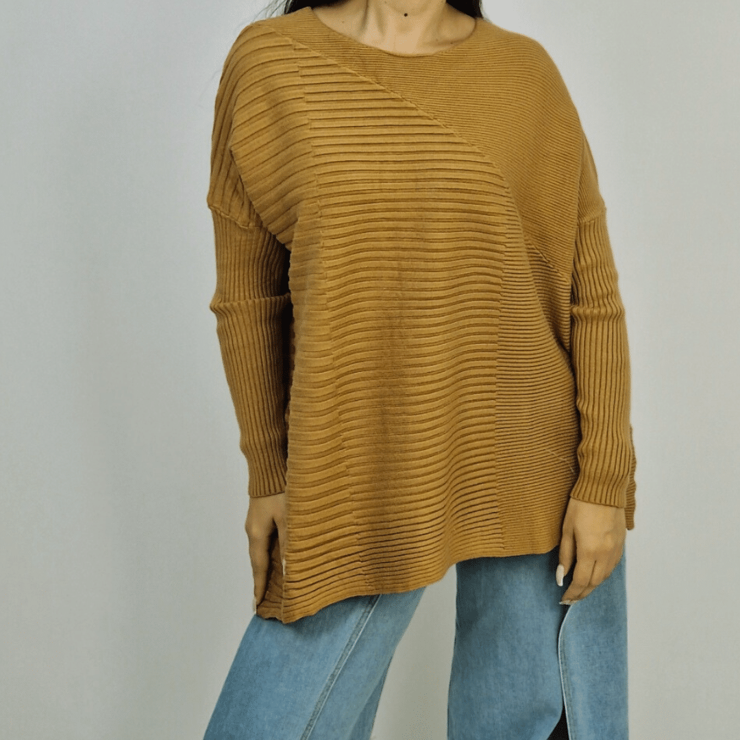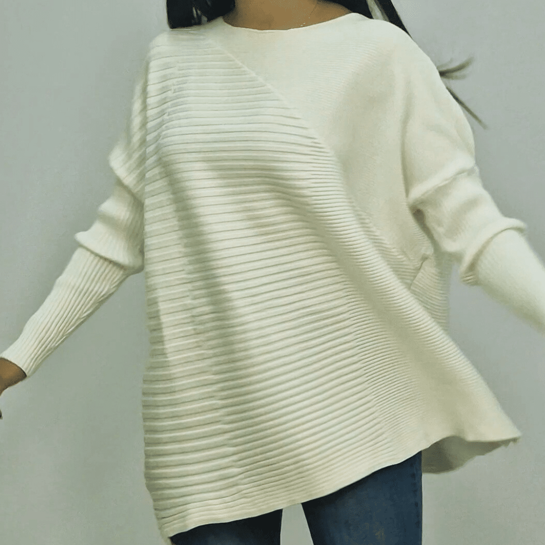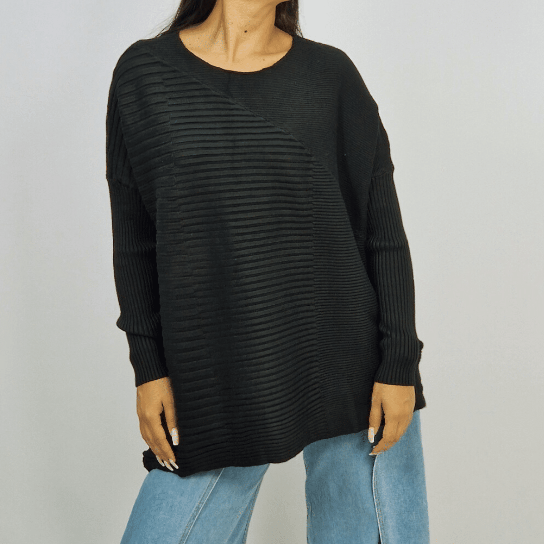 This oversized sweater features a striking asymmetrical ribbed design that adds a modern twist to a classic silhouette. With its relaxed fit, it offers maximum comfort while maintaining a stylish, on-trend look. The textured ribbing creates visual interest, and the drop shoulders enhance the casual, laid-back feel. Perfect for layering during cooler weather, this sweater pairs effortlessly with jeans or leggings for a cozy yet fashionable outfit. Whether you’re dressing for a casual day out or a cozy night in, this sweater is a versatile wardrobe staple.