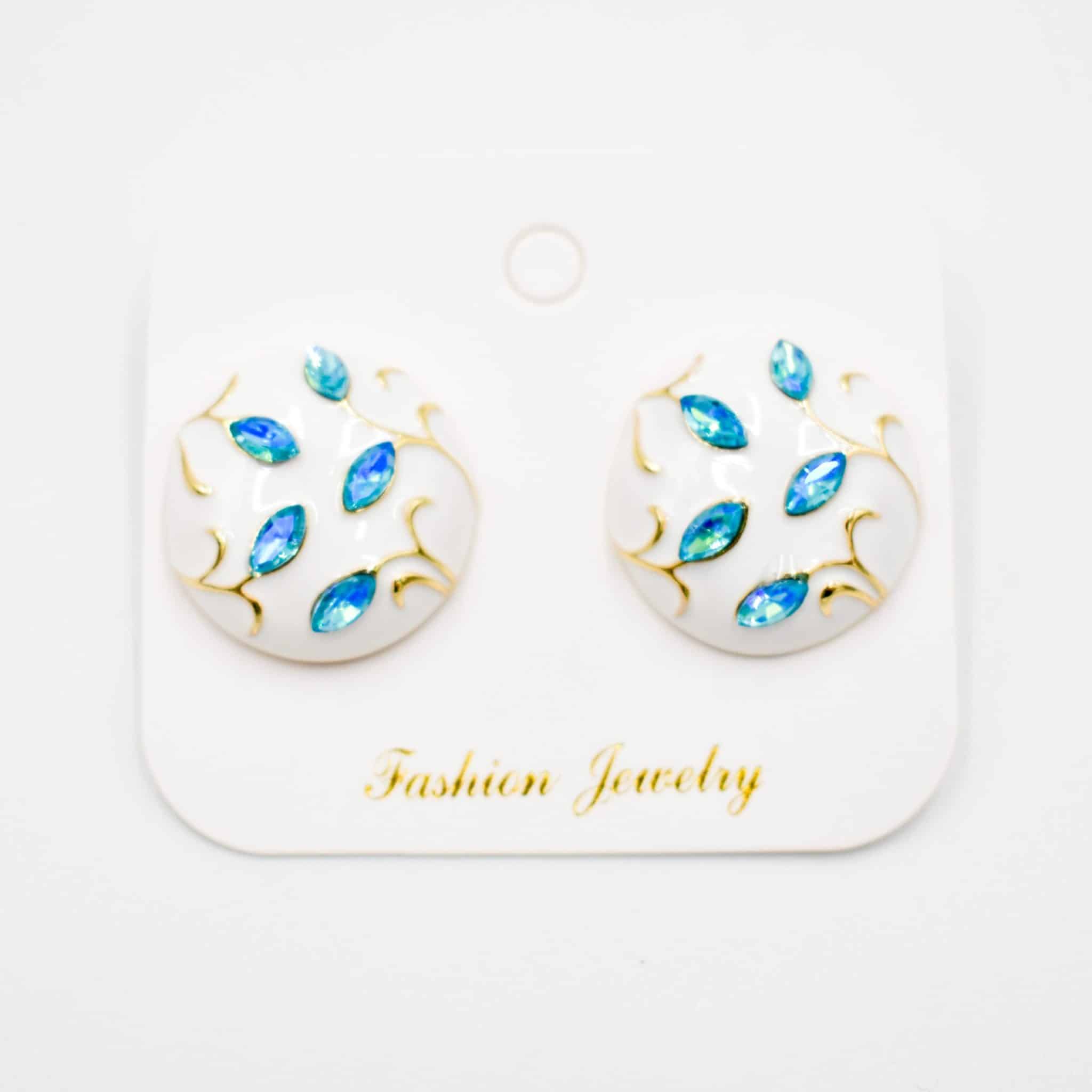 Add a refreshing touch of color and elegance to your summer look with the Azure Bloom Studs. These glossy white domed earrings are beautifully embellished with leaf-shaped blue and green crystals and delicate gold vine details, creating a light-catching and botanical-inspired design. Perfect for both casual days and chic summer nights.