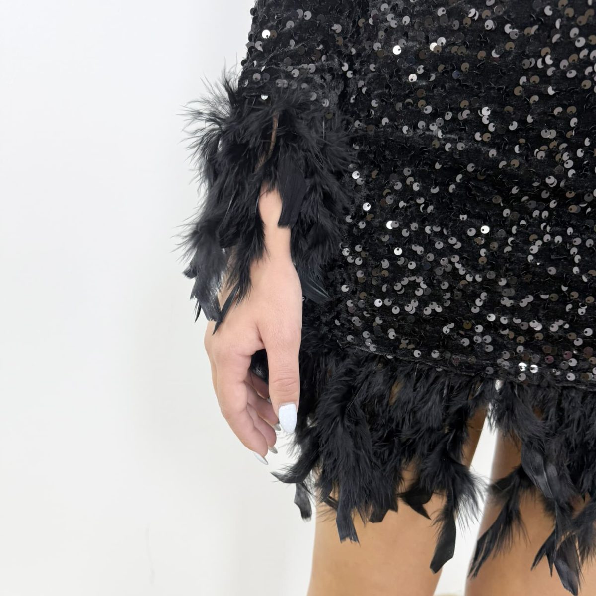 The Black Feather Sequin Mini Dress is your go-to piece when you want to stand out and feel unforgettable. Pair it with sleek heels and minimal jewelry to let the dress do all the talking.
