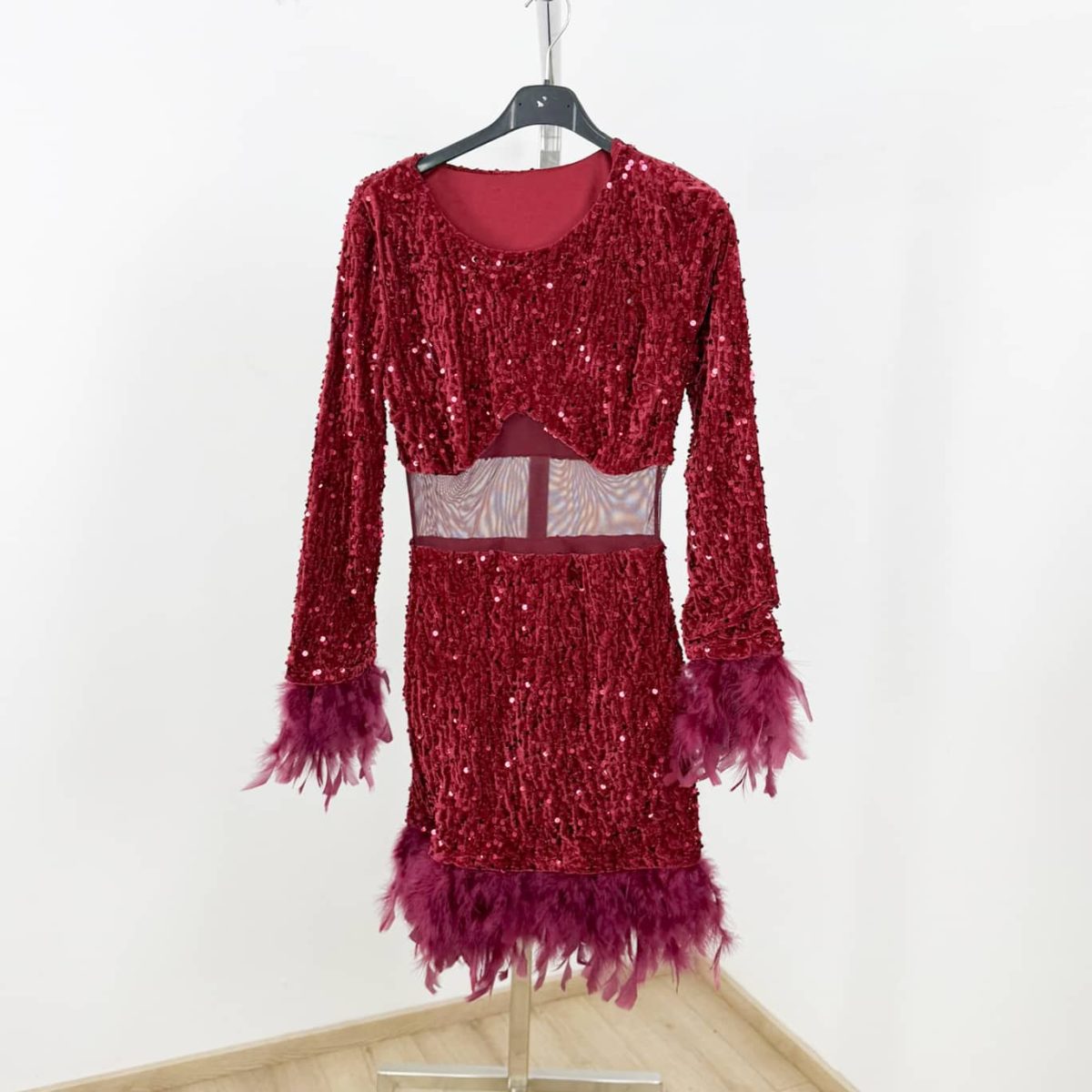 Crafted with precision, this mini dress features long sleeves adorned with feather cuffs, a mesh waist cutout that highlights your silhouette, and a sequin-embellished finish that captures every spotlight. Perfect for evening parties, celebrations, and special nights out, it offers the ideal balance of chic and bold fashion.