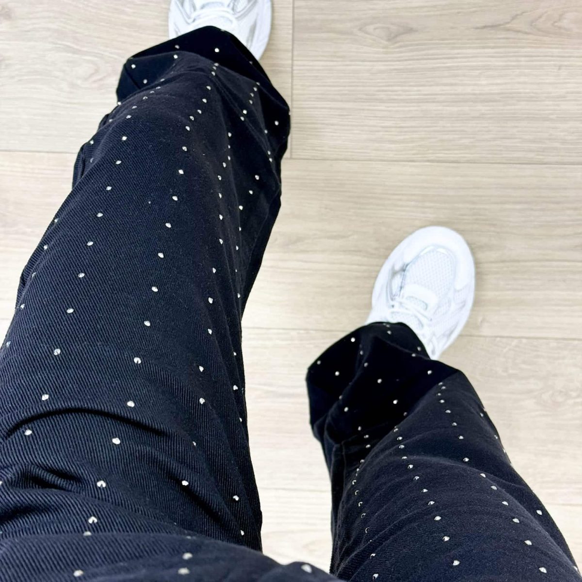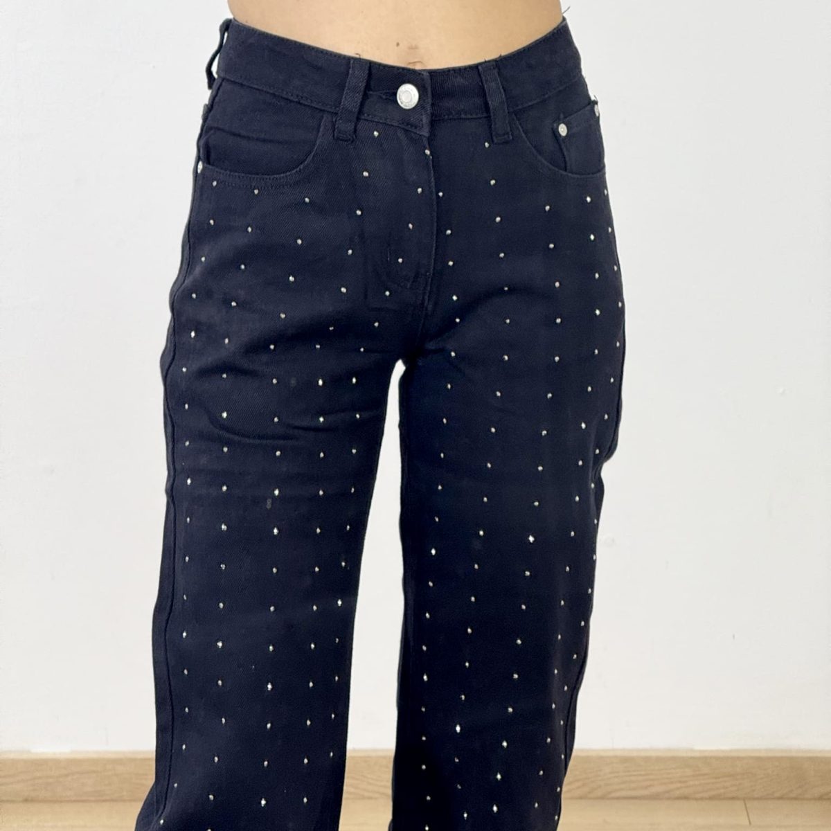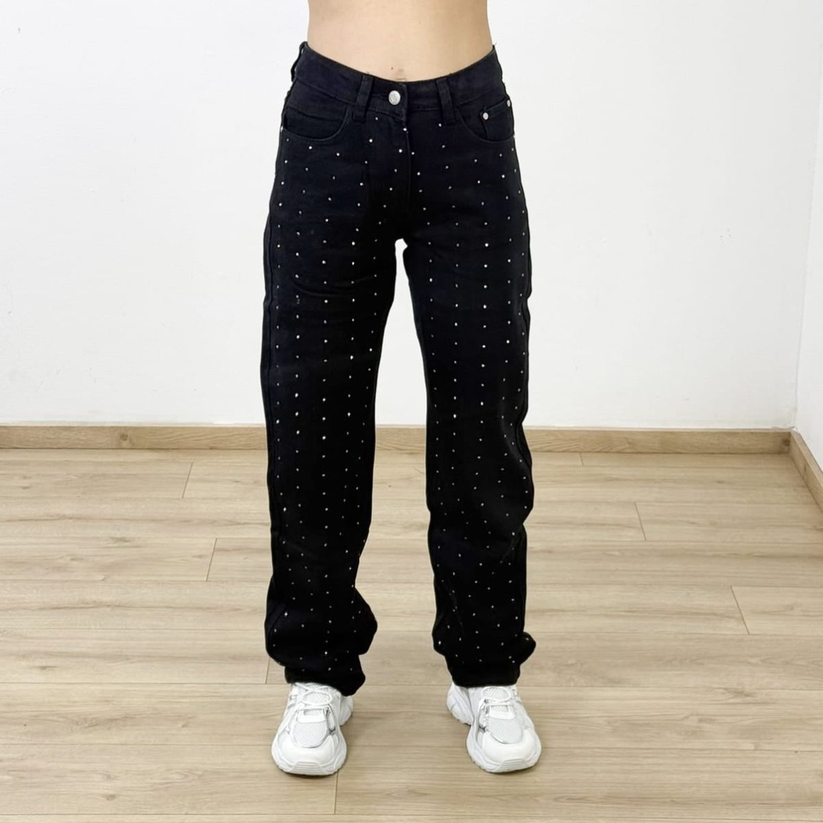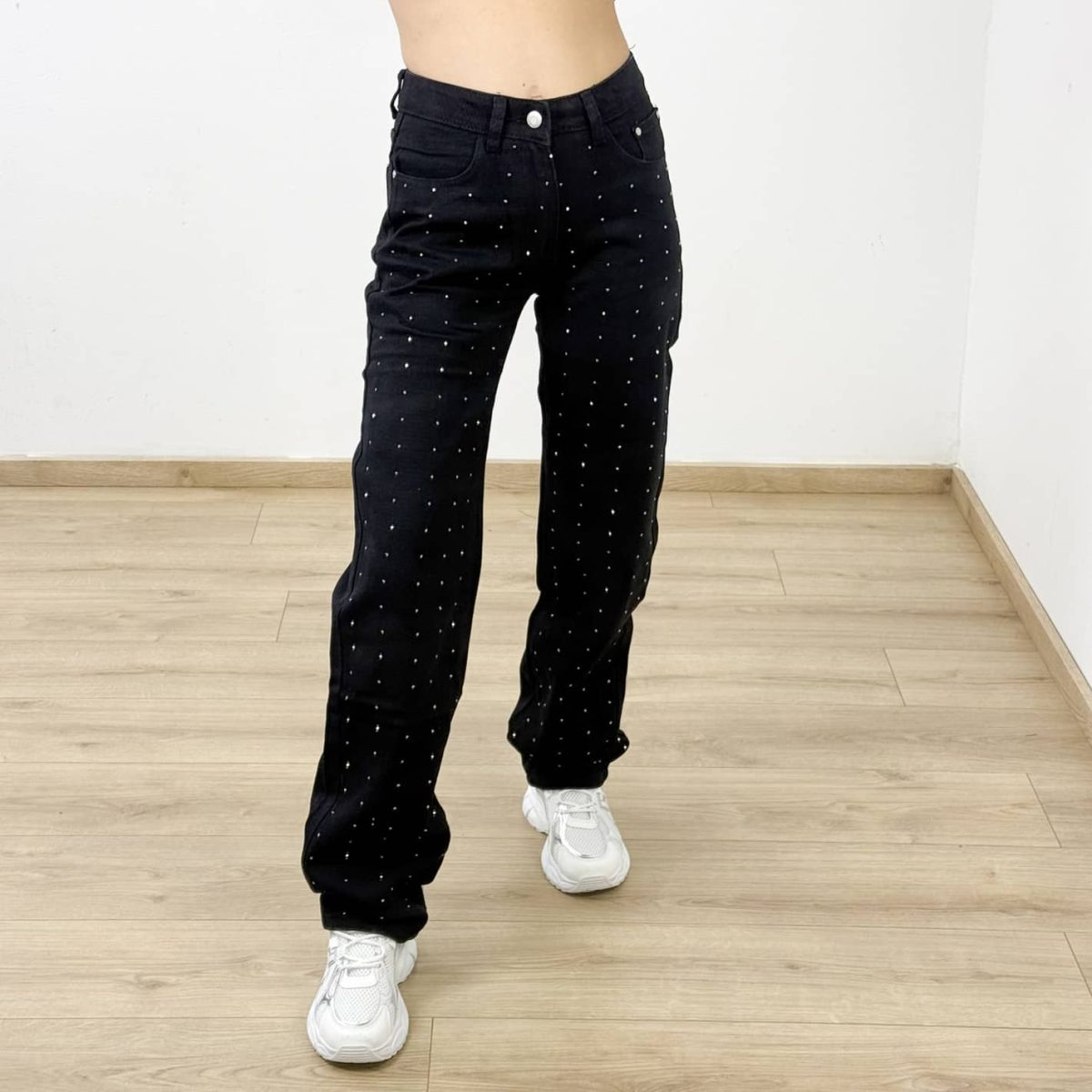 Elevate your casual looks with these black straight-leg jeans, featuring subtle all-over rhinestone detailing for a modern twist on a classic fit. Designed to offer comfort and a flattering silhouette, these jeans pair perfectly with both sneakers and heels. A stylish must-have that brings effortless edge and sparkle to your everyday wardrobe.