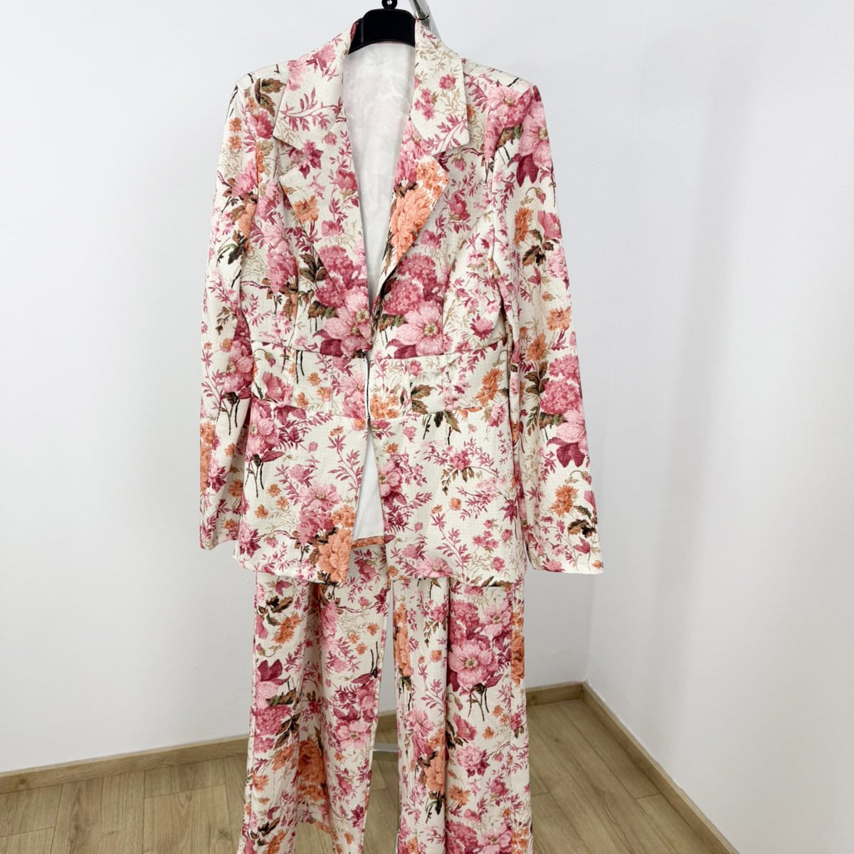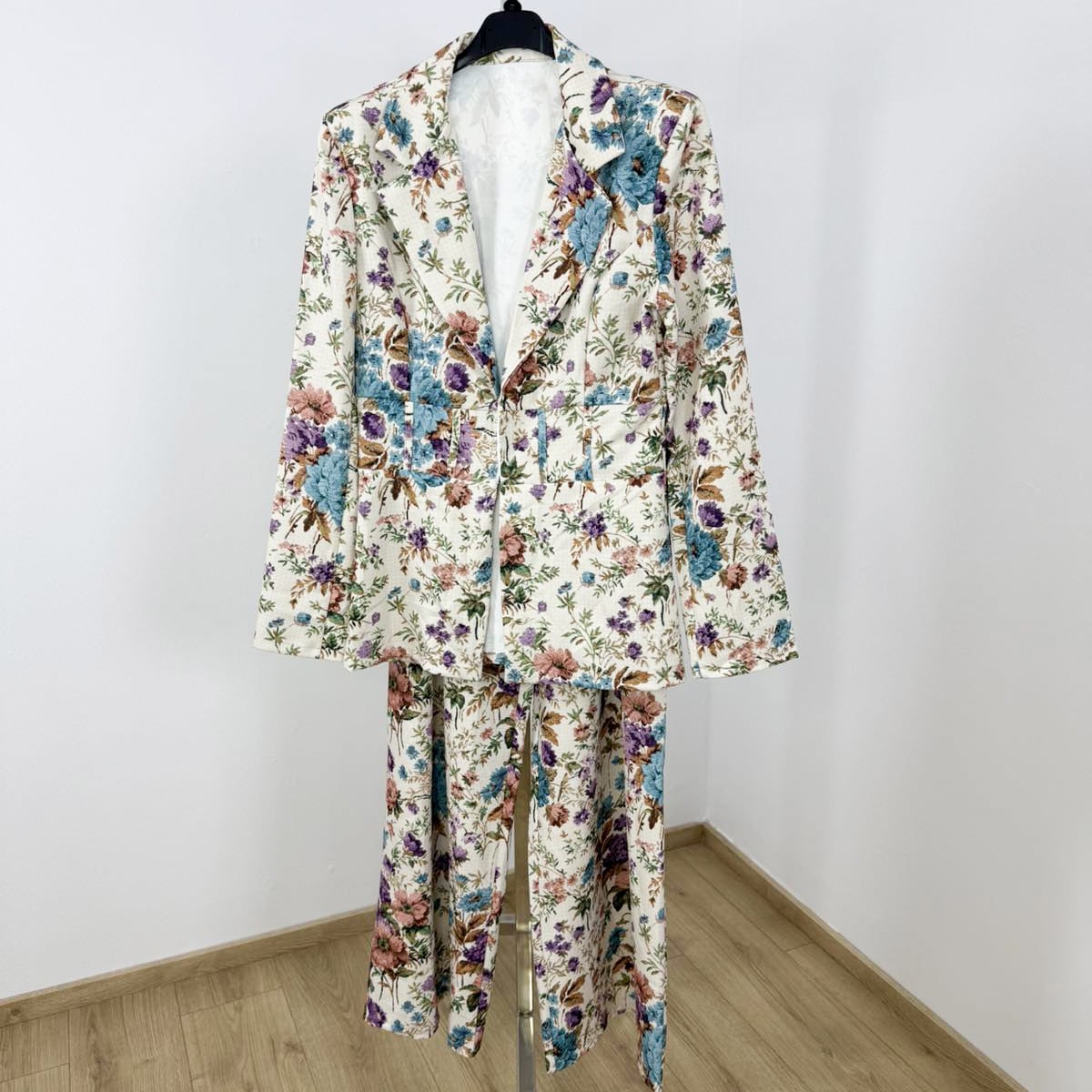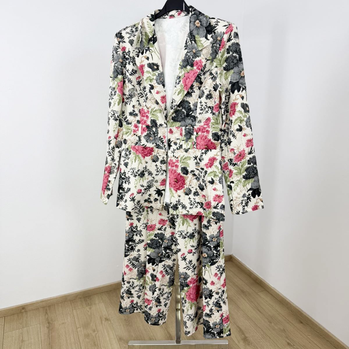The delicate floral prints in soft and vibrant tones add a romantic touch, while the tailored silhouette keeps the look polished and modern. Ideal for special occasions, events, or chic daytime outfits, this set offers both elegance and comfort in one standout look.