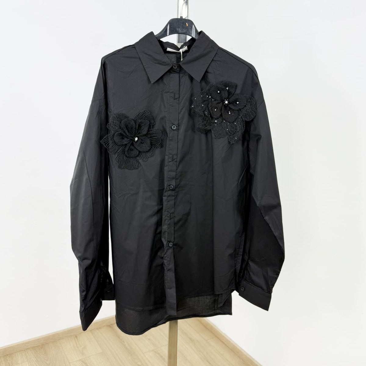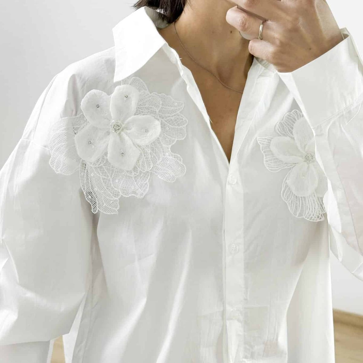 Elevate your summer style with this stunning long-sleeve sheer shirt, adorned with intricate floral appliqués and shimmering bead accents. Perfect for both day and evening looks, this shirt blends elegance with a modern twist.