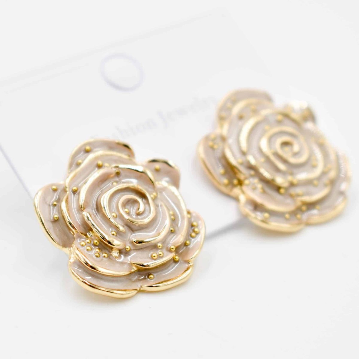 Elevate your everyday elegance with these Blossom Pearl-Gold Enamel Rose Stud Earrings, beautifully crafted in a delicate rose shape. Featuring soft pearlescent enamel petals outlined in polished gold and accented with tiny gold bead details, these earrings offer a timeless, feminine charm. Lightweight and versatile, they are perfect for casual looks, romantic outfits, or special occasions where subtle sophistication is key. A stunning accessory to enhance your style with graceful floral beauty.