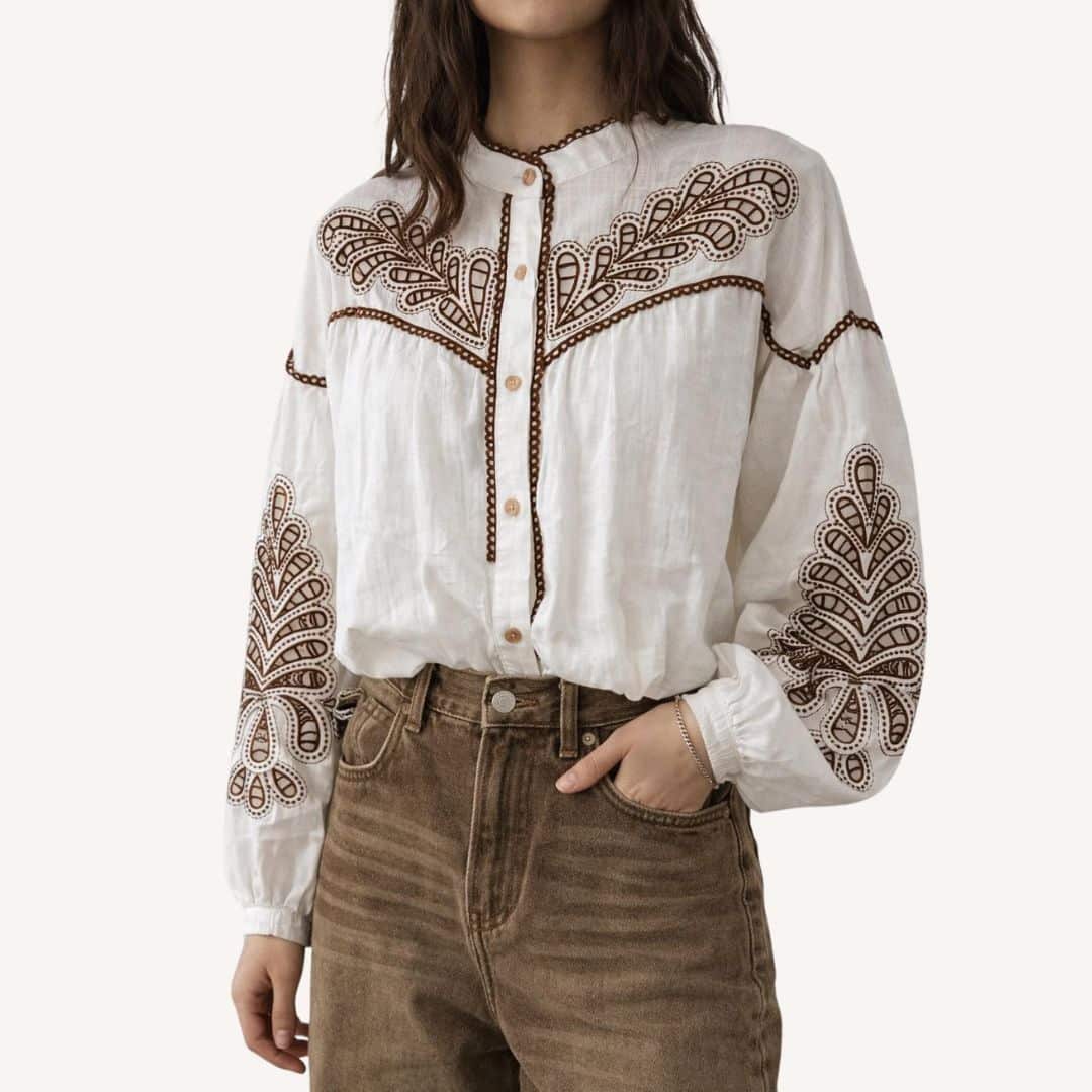 Embrace effortless elegance with the Bohemian Grace Embroidered Blouse, a timeless piece that blends romantic charm with artisanal detail. Crafted from lightweight, breathable fabric, this blouse features intricate embroidered patterns along the chest and sleeves, adding a refined boho-inspired touch.