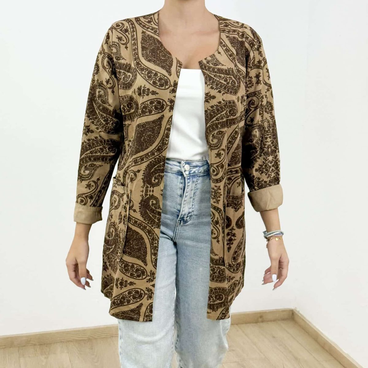Step into effortless elegance with this bohemian-inspired longline jacket featuring an intricate paisley print. Designed in neutral earthy tones, it’s perfect for layering over casual or chic outfits. Lightweight yet stylish, this jacket is a must-have for women who love modern sophistication with a timeless twist.