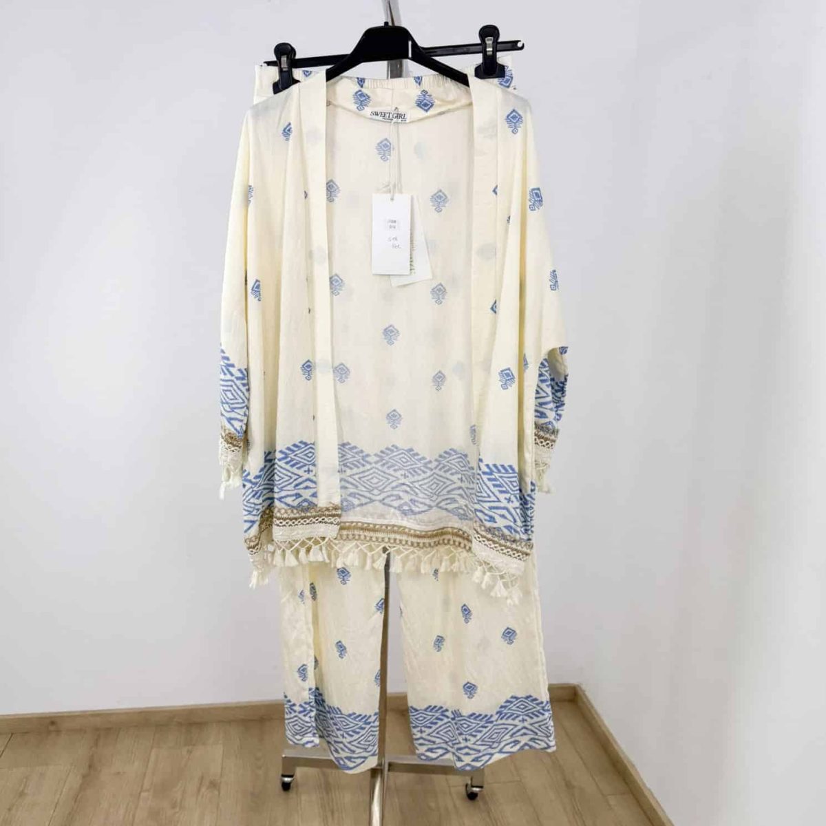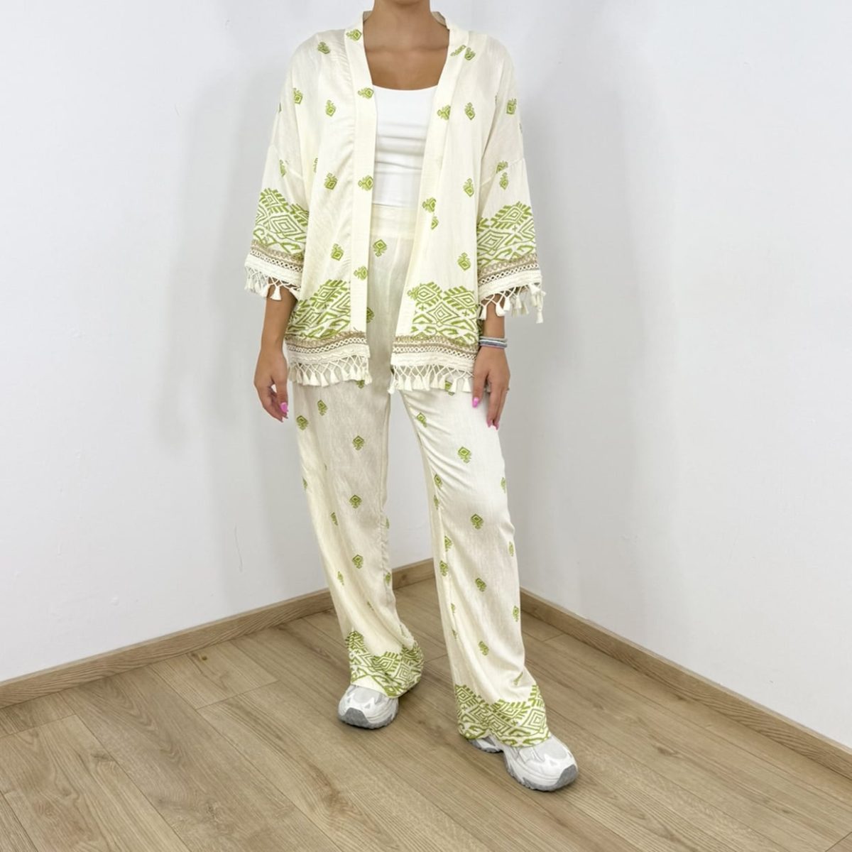 Bring effortless elegance to your summer wardrobe with this boho-inspired embroidered 2-piece set. Designed with lightweight fabric, relaxed wide-leg pants, and a matching kimono-style top with tassel details, this set is perfect for both casual outings and vacation looks. The ethnic embroidery adds a chic touch, while the airy fit ensures maximum comfort all day long.