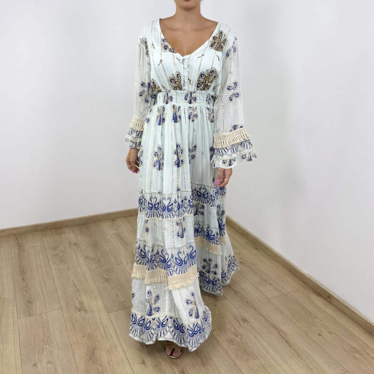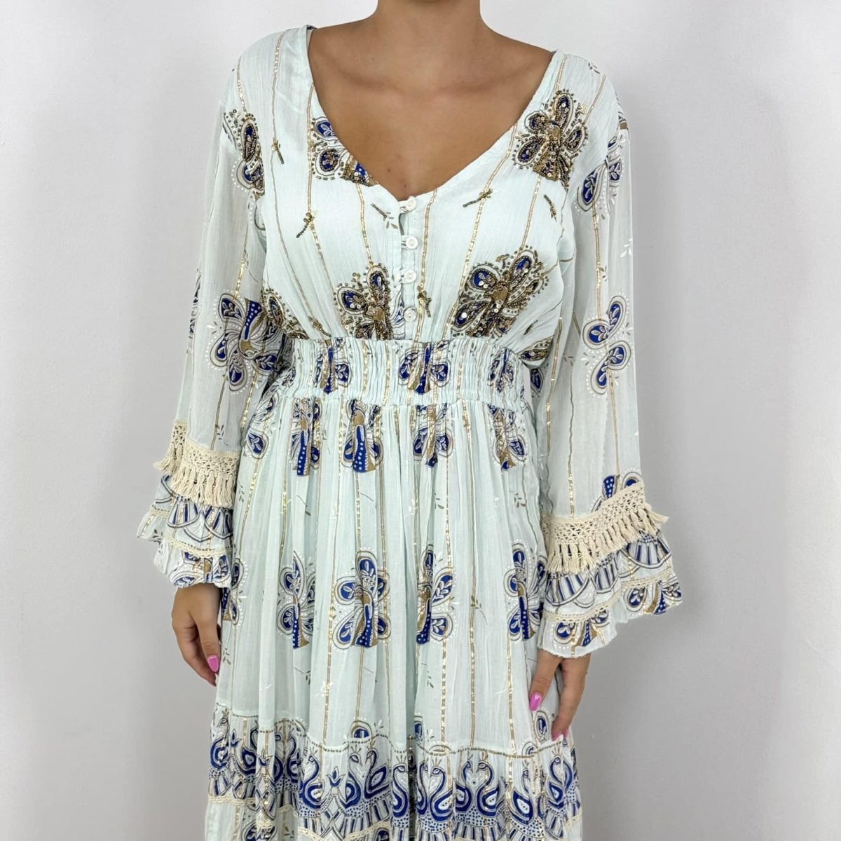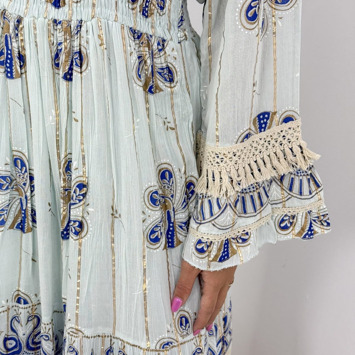 Step into effortless elegance with this boho-inspired maxi dress, perfect for summer days and nights. Designed with intricate patterns in blue and gold, delicate crochet lace details, and a flattering smocked waist, this dress combines comfort with sophistication. The lightweight fabric and flowy silhouette make it a must-have piece for women who love chic, feminine style.