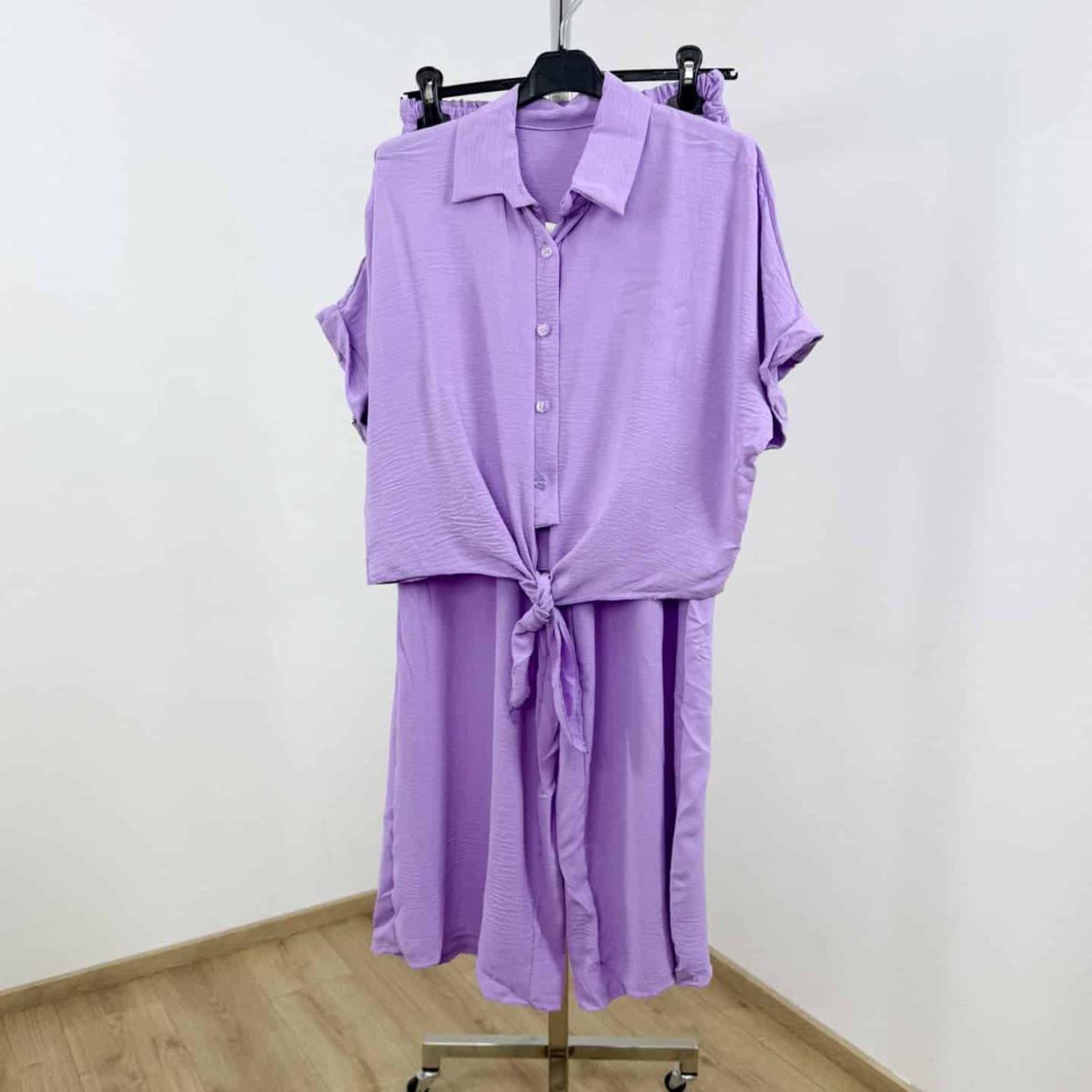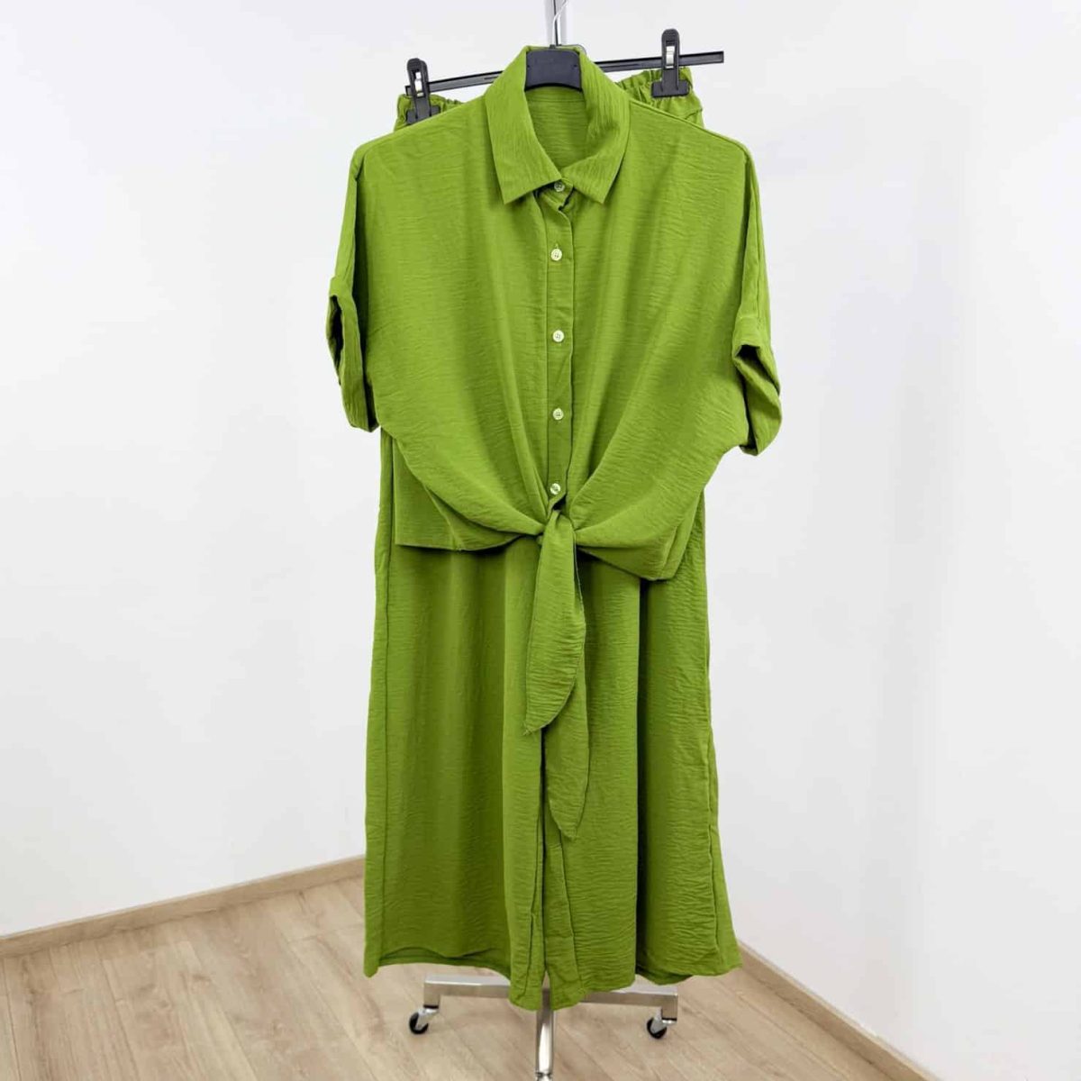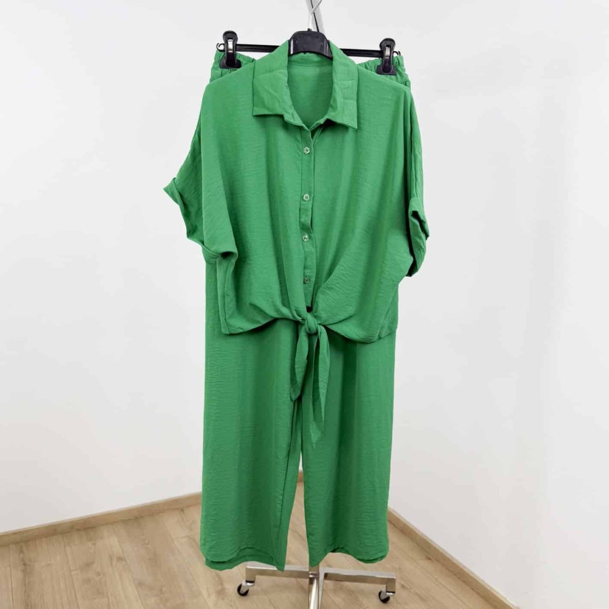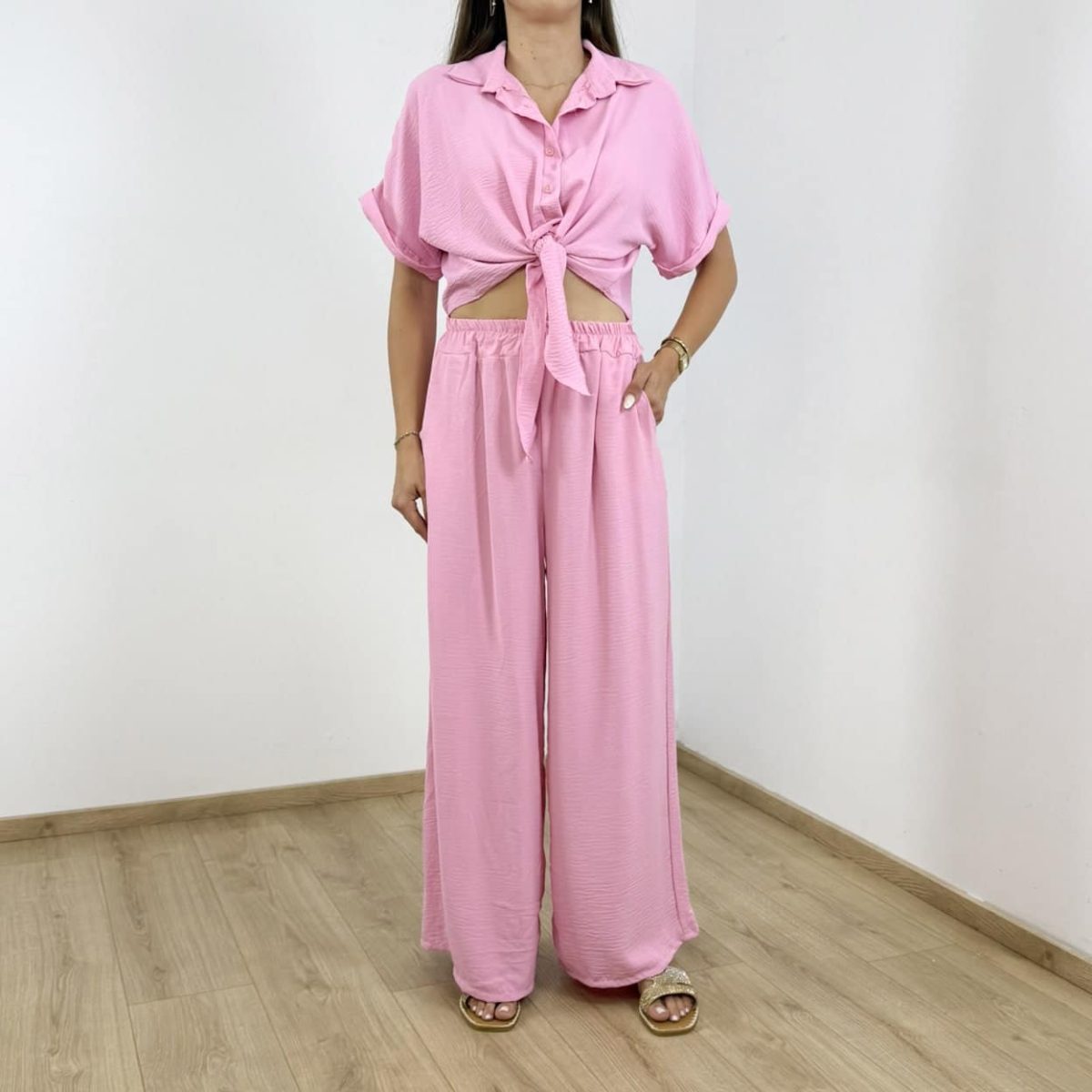 Embrace effortless summer elegance with this two-piece lightweight set, designed for comfort and chic style. Featuring a cropped, button-down tie-front shirt with rolled sleeves and high-waisted wide-leg trousers, this set combines a relaxed silhouette with vibrant solid colors.