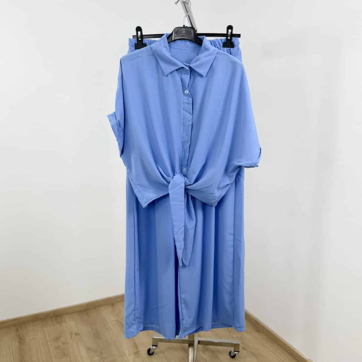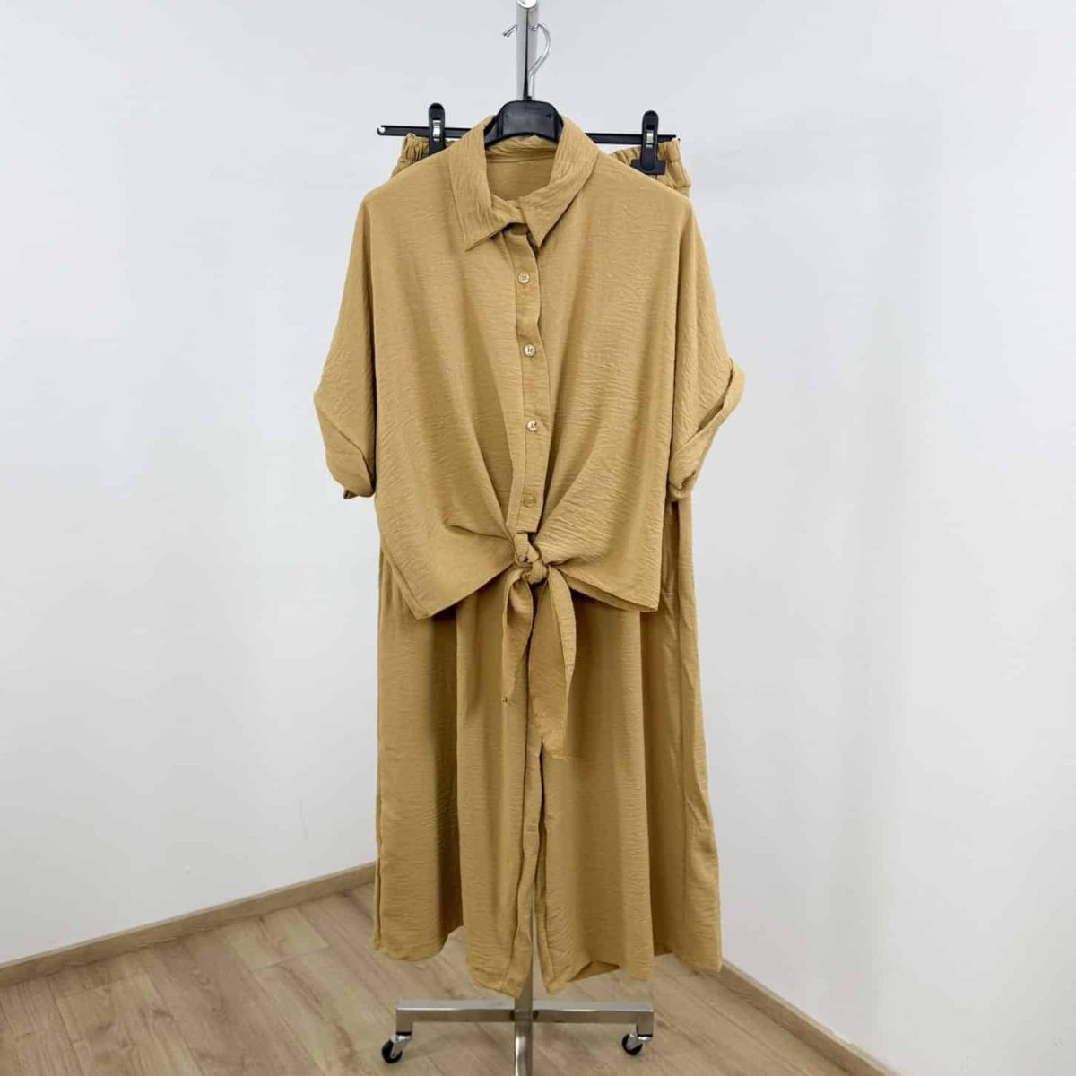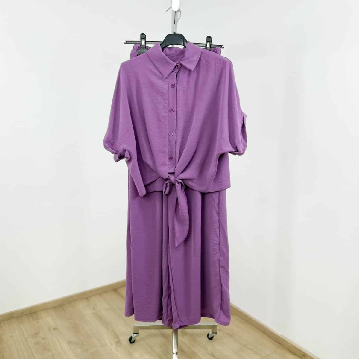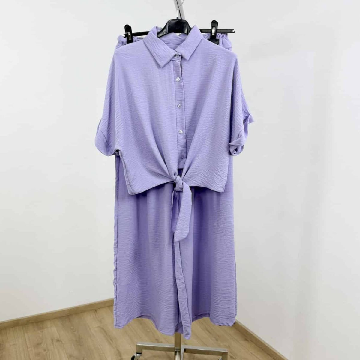 Embrace effortless summer elegance with this two-piece lightweight set, designed for comfort and chic style. Featuring a cropped, button-down tie-front shirt with rolled sleeves and high-waisted wide-leg trousers, this set combines a relaxed silhouette with vibrant solid colors.