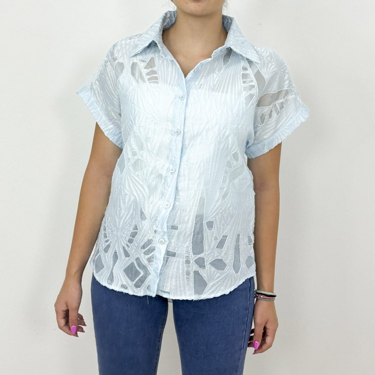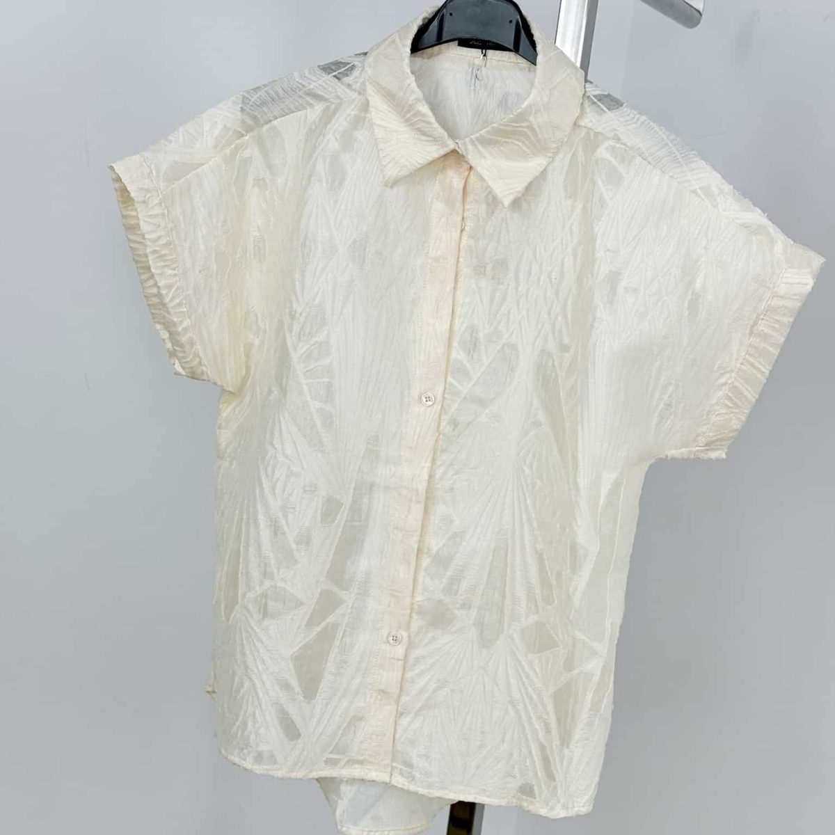 Elevate your summer style with this Breezy Textured Sheer Button-Up Shirt — a lightweight and airy piece designed for effortless elegance. Featuring a unique textured pattern with semi-sheer detailing, this short-sleeve shirt brings a fresh, contemporary vibe to your wardrobe.