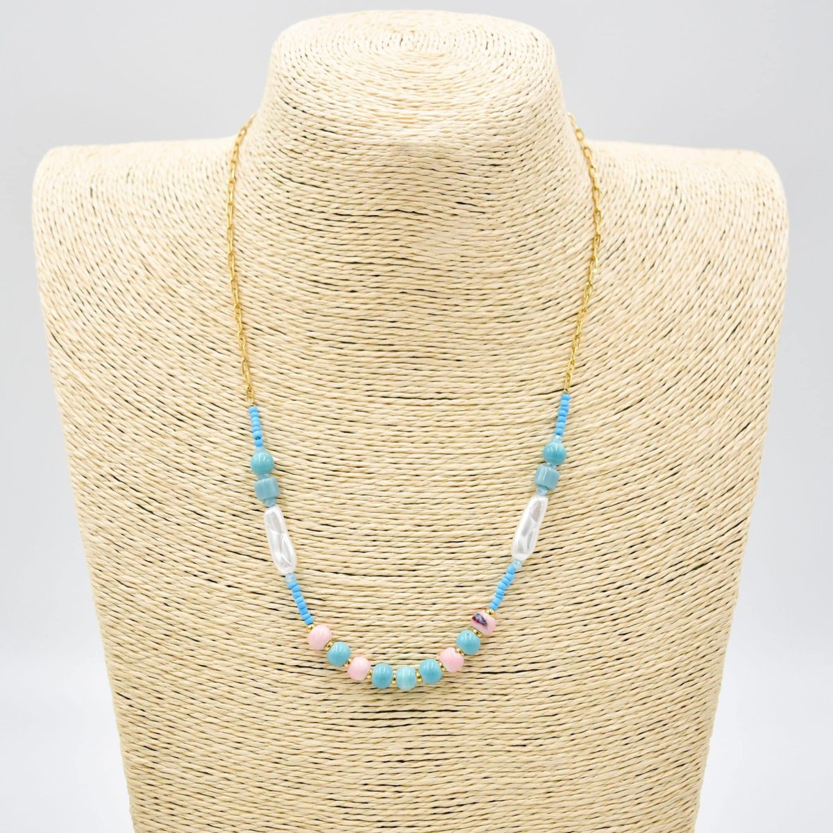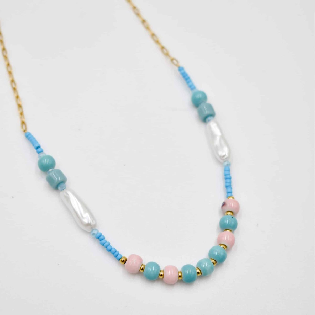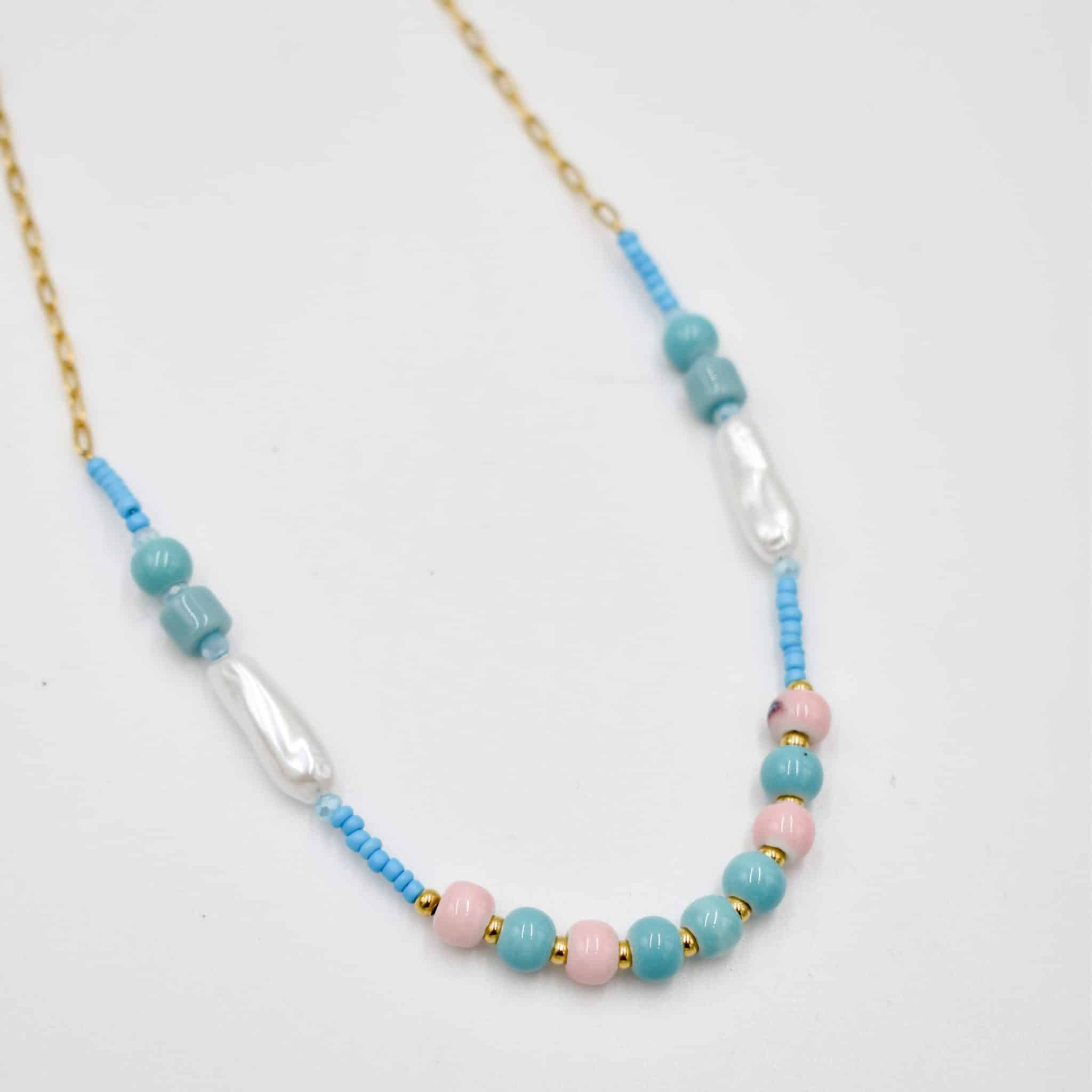 Playful and colorful, this beaded necklace features a charming mix of baby pink, aqua, and gold beads for a sweet summer statement.