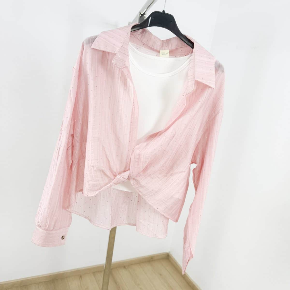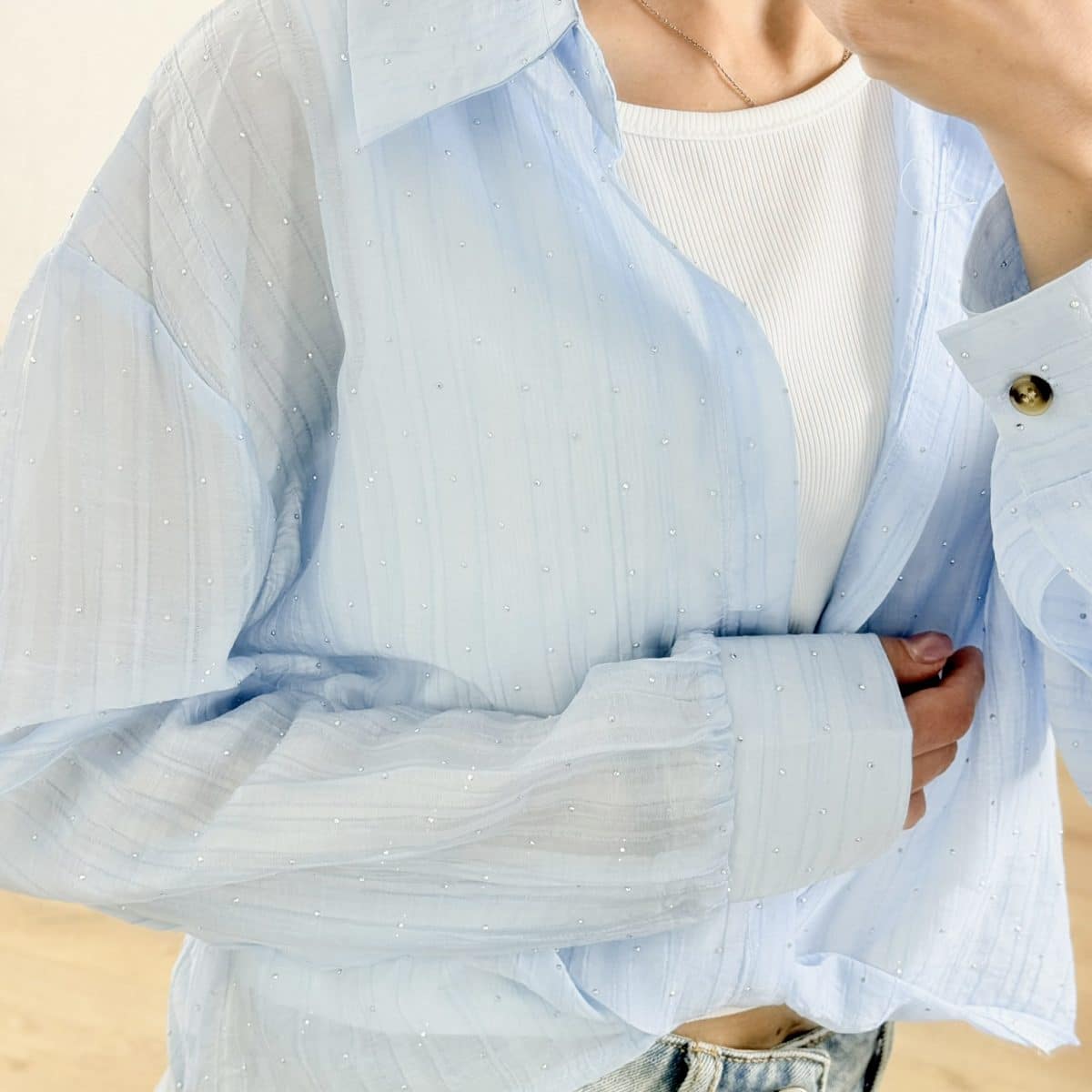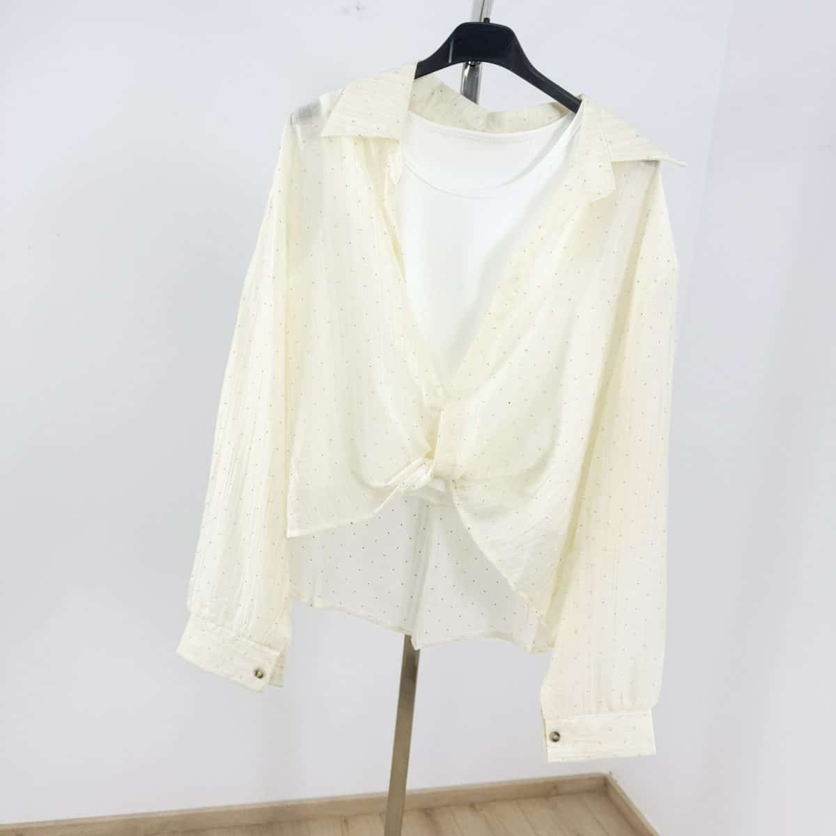 Light, airy, and effortlessly feminine — the Celestia Sheer Sparkle Tie-Front Shirt is your go-to layering piece for elevated everyday styling. Designed in a soft semi-sheer fabric with delicate micro-stud embellishments, this shirt adds a subtle shimmer that catches the light beautifully.