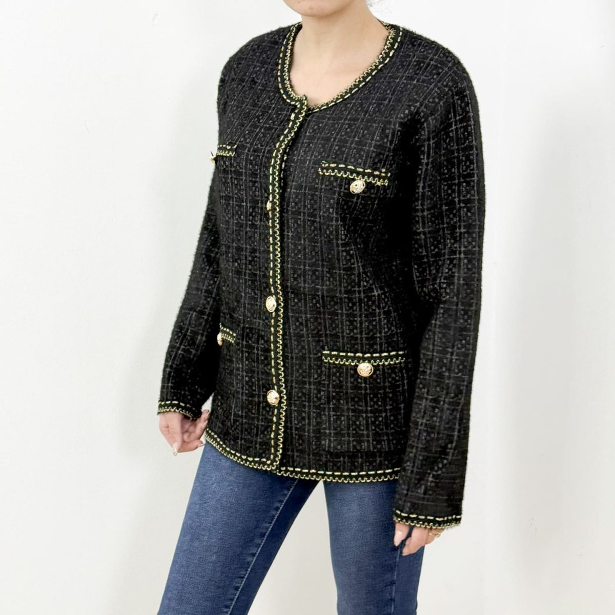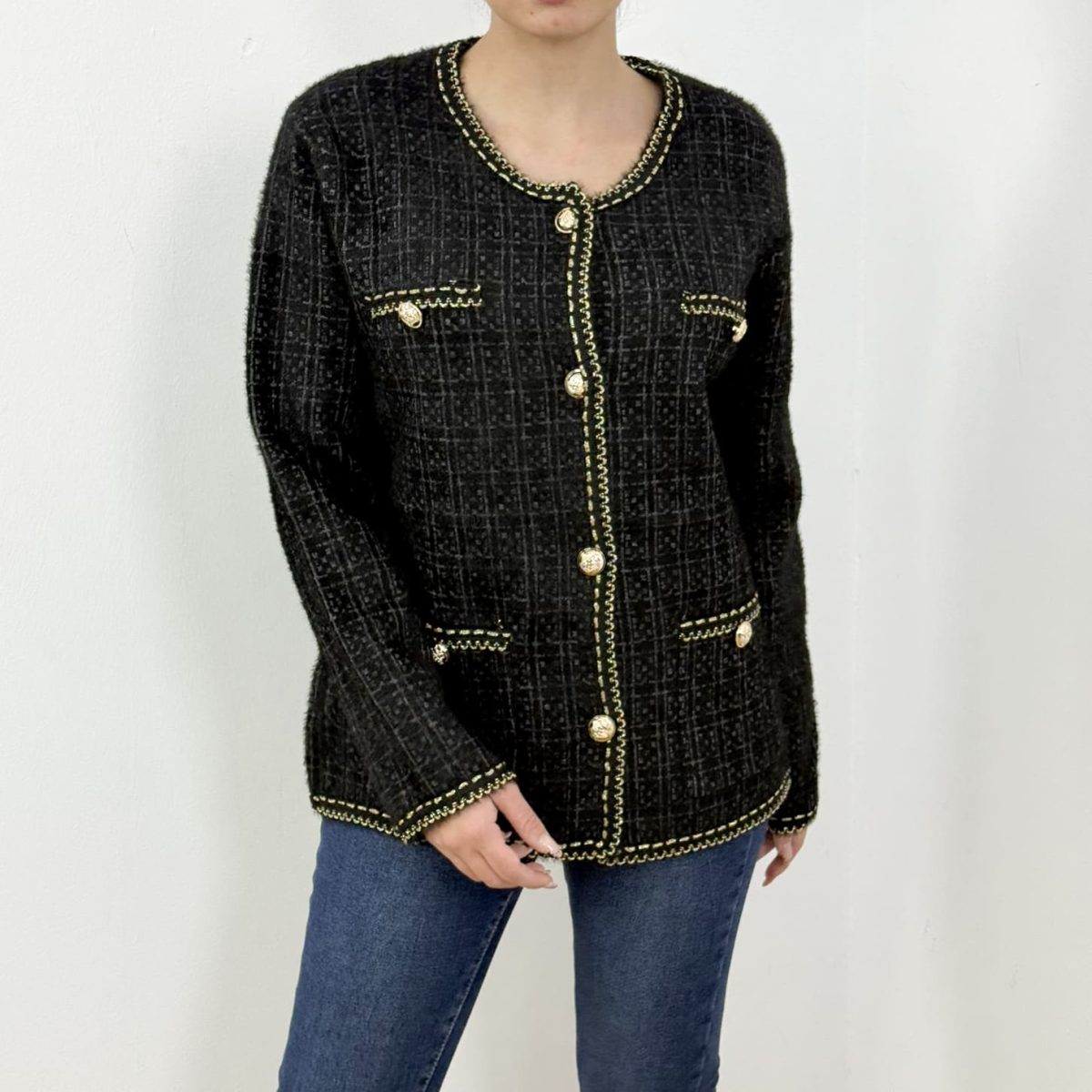 Add timeless elegance to your wardrobe with this tweed-inspired cardigan, detailed with luxurious gold embossed buttons and contrast woven trimming. Designed with a refined check pattern, front pockets, and a tailored silhouette, it blends classic sophistication with everyday comfort. Perfect for pairing with jeans, trousers, or skirts, this versatile piece elevates both casual and office-ready outfits effortlessly.