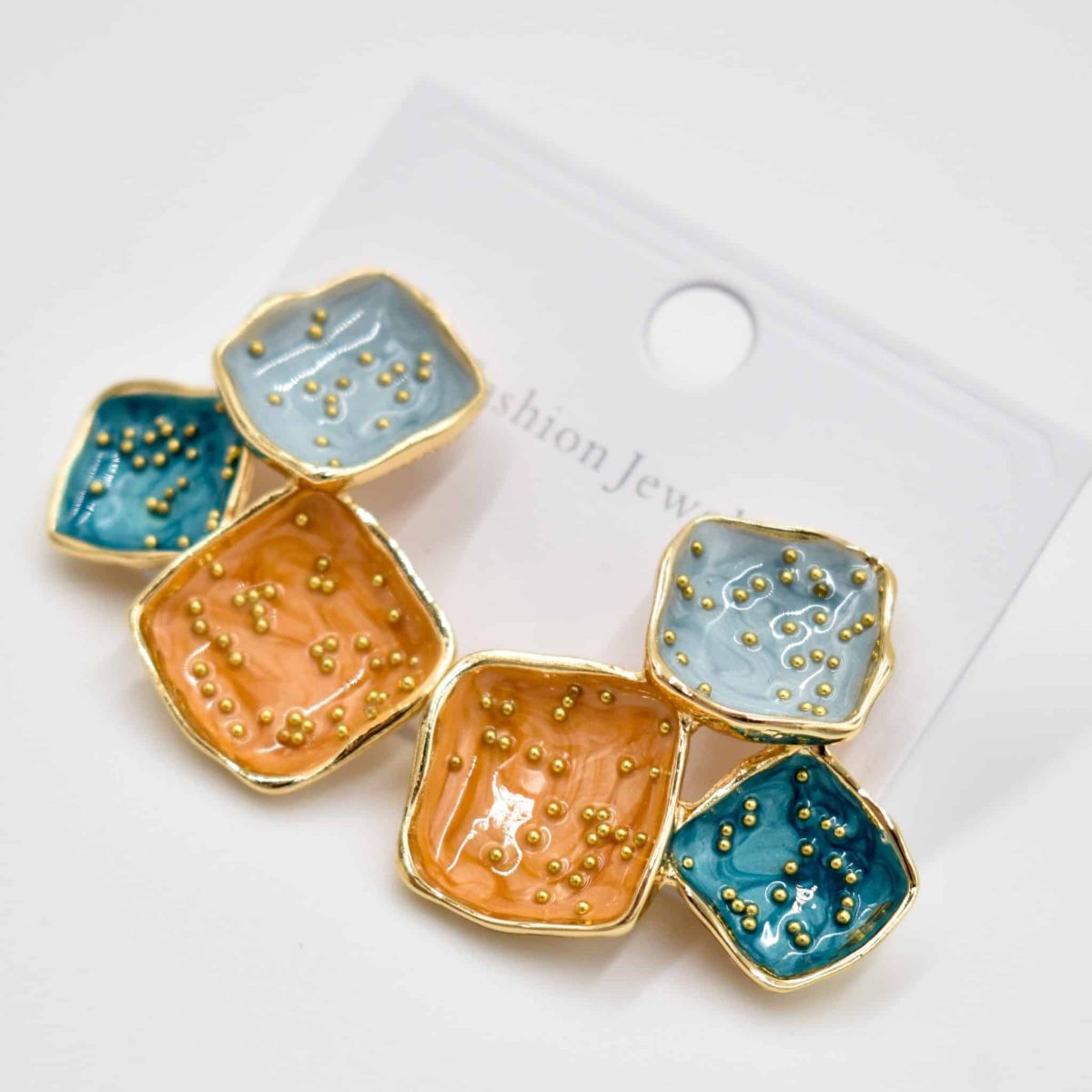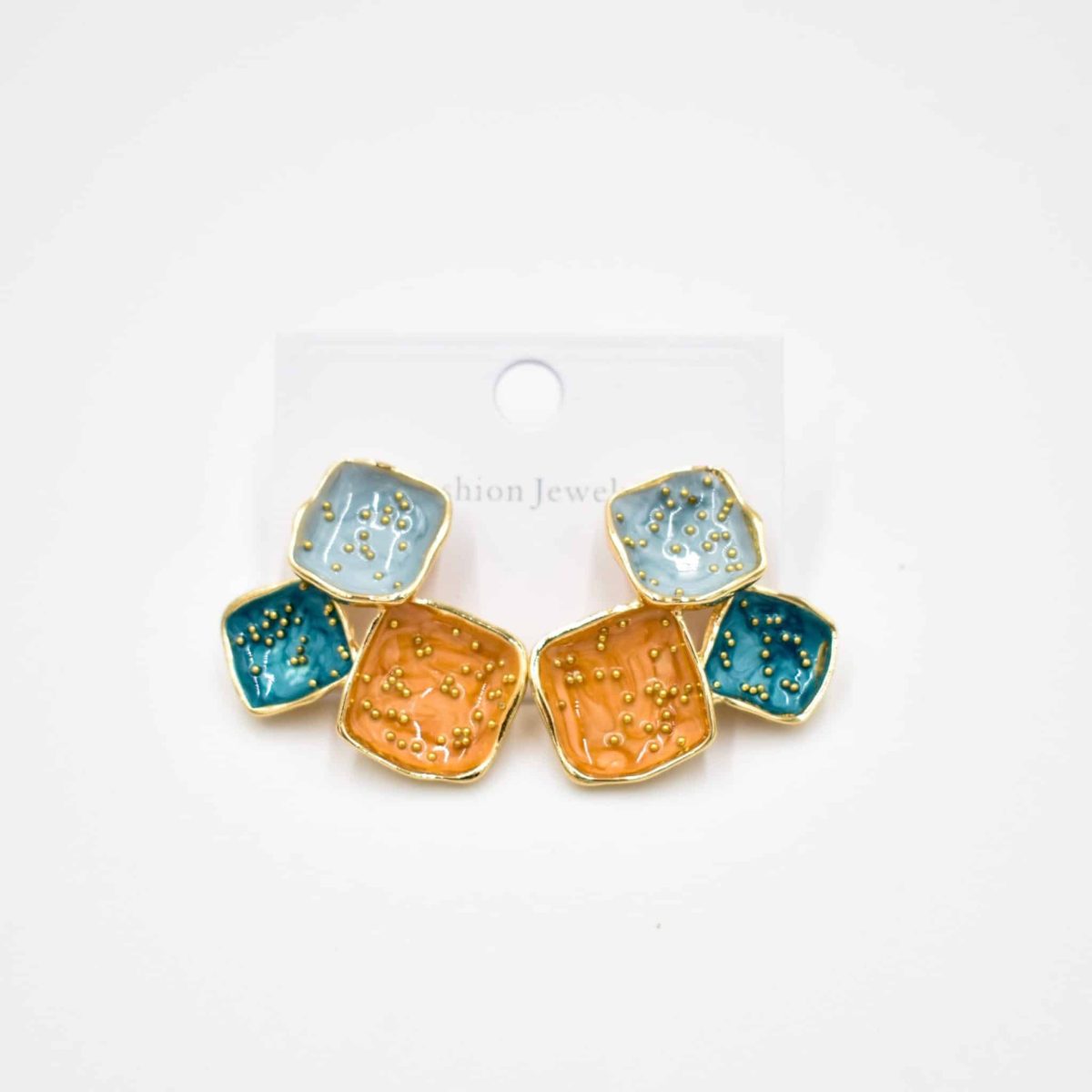 Make a bold statement with these ColorSplash Geometric Stud Earrings, featuring an artistic mix of orange, blue, and teal enamel squares adorned with delicate gold bead accents. Their modern asymmetrical design adds a vibrant, abstract flair perfect for elevating any look—whether casual or chic. Lightweight and eye-catching, they’re your go-to for standout style.