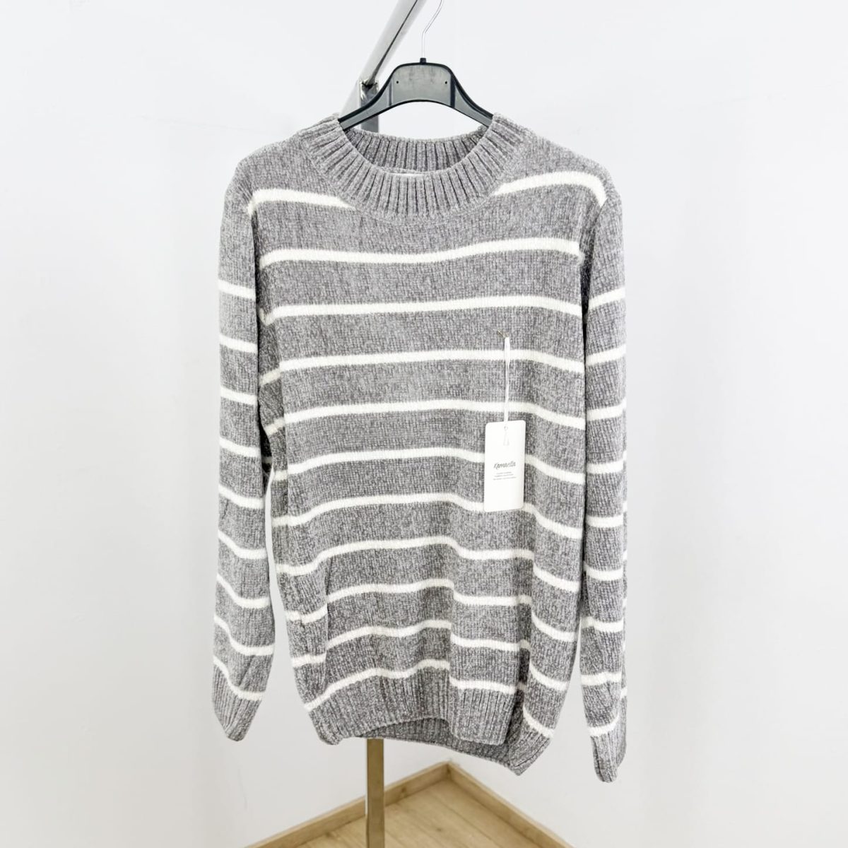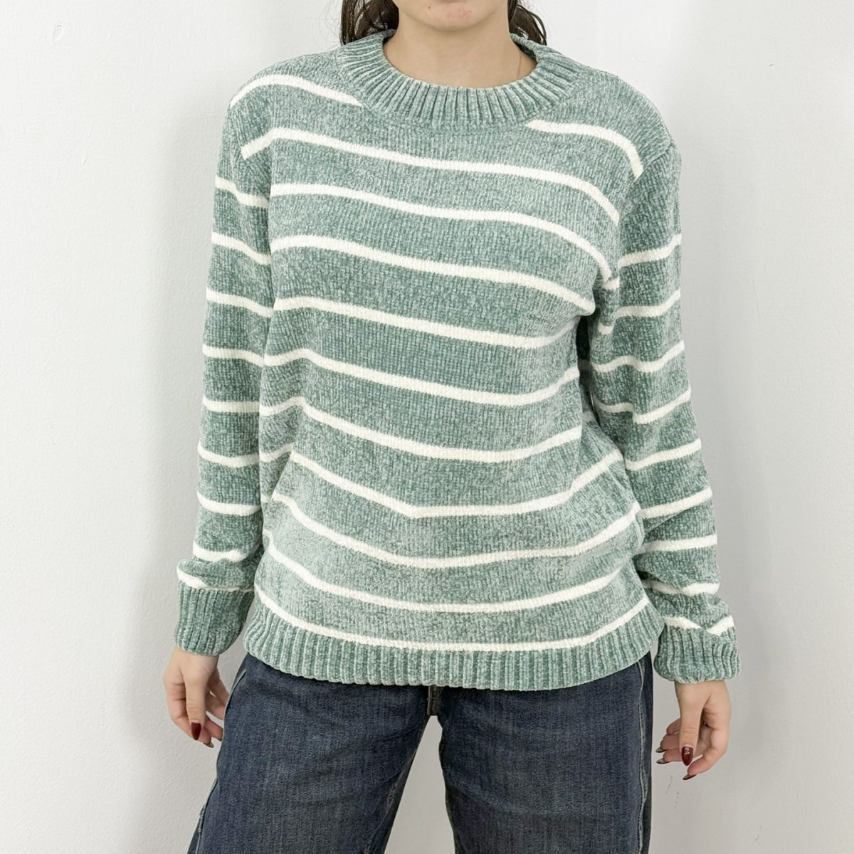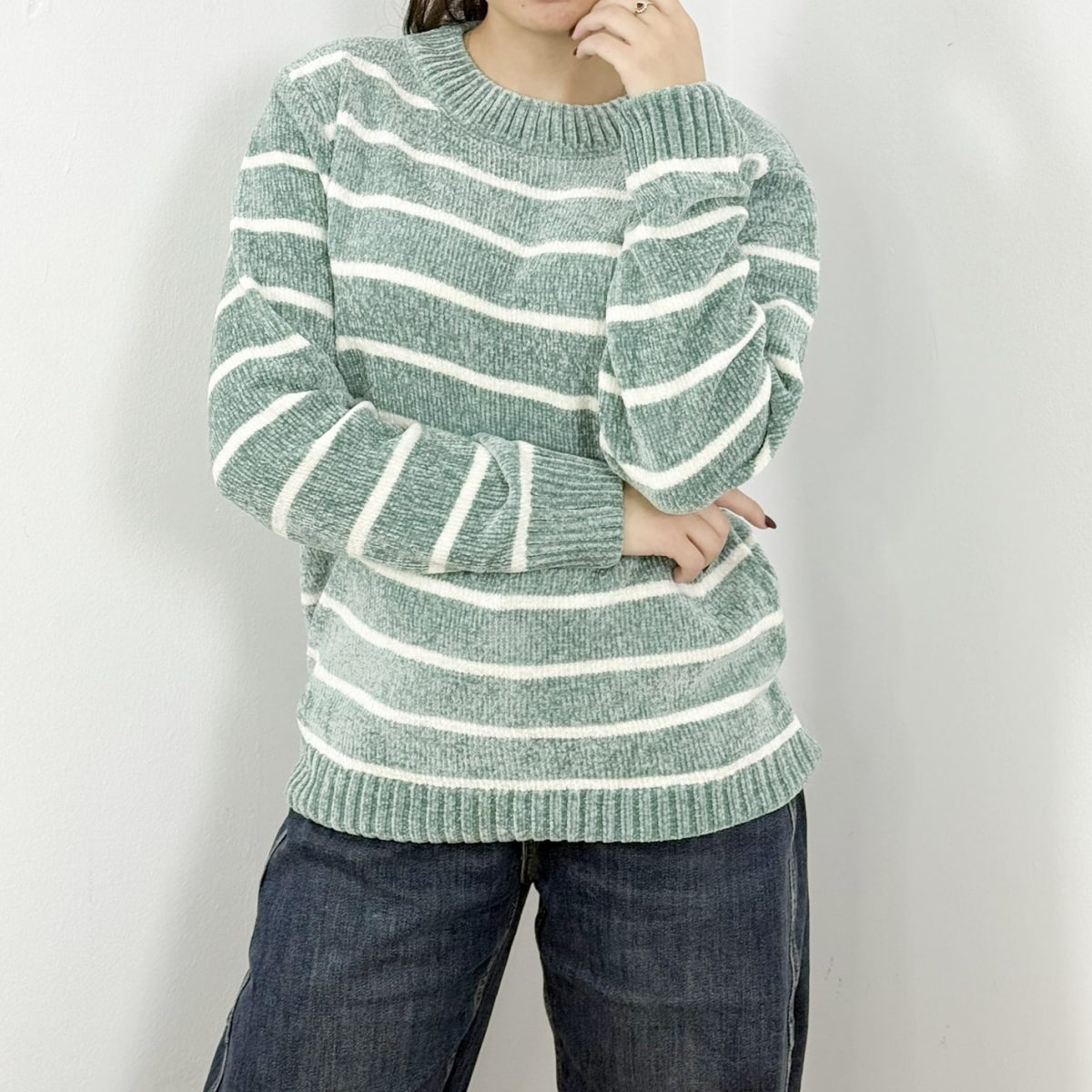 Wrap yourself in comfort with this ultra-soft chenille striped sweater in a calming seafoam green shade. Featuring a classic crew neckline, relaxed fit, and horizontal cream stripes, it delivers the perfect balance of warmth and effortless style. Ideal for everyday wear, it pairs beautifully with denim for a cozy yet polished look.
