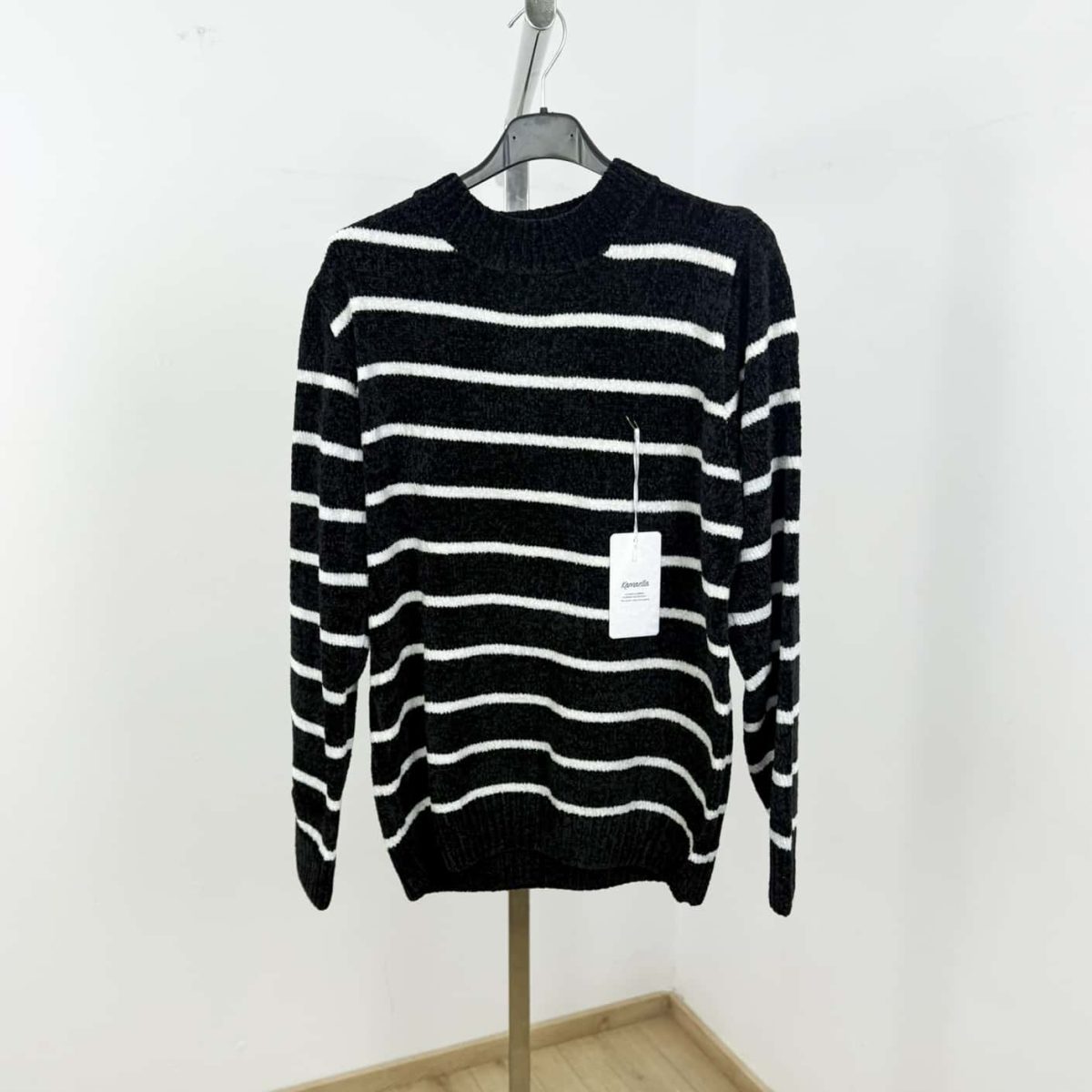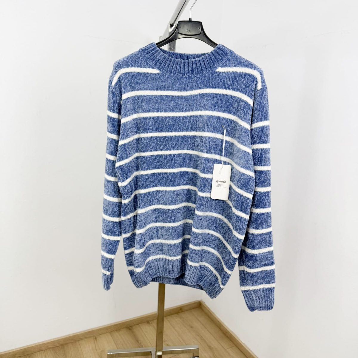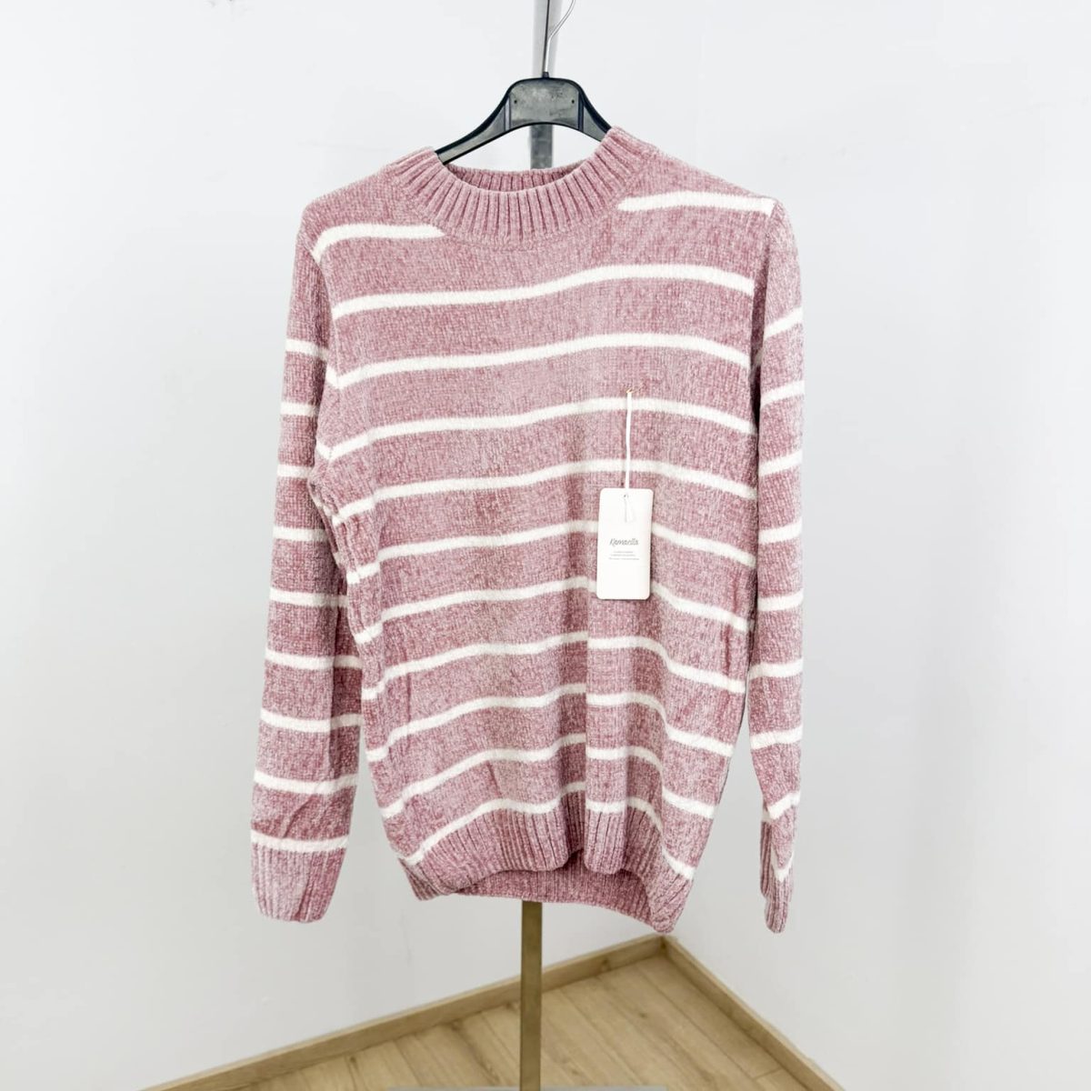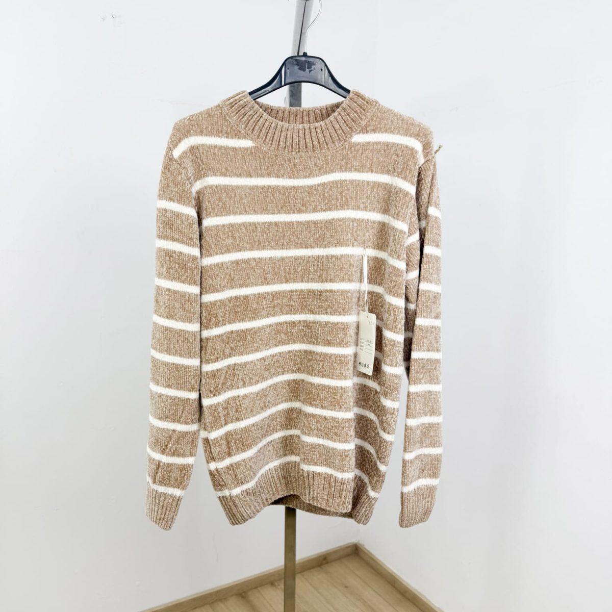 Wrap yourself in comfort with this ultra-soft chenille striped sweater in a calming seafoam green shade. Featuring a classic crew neckline, relaxed fit, and horizontal cream stripes, it delivers the perfect balance of warmth and effortless style. Ideal for everyday wear, it pairs beautifully with denim for a cozy yet polished look.