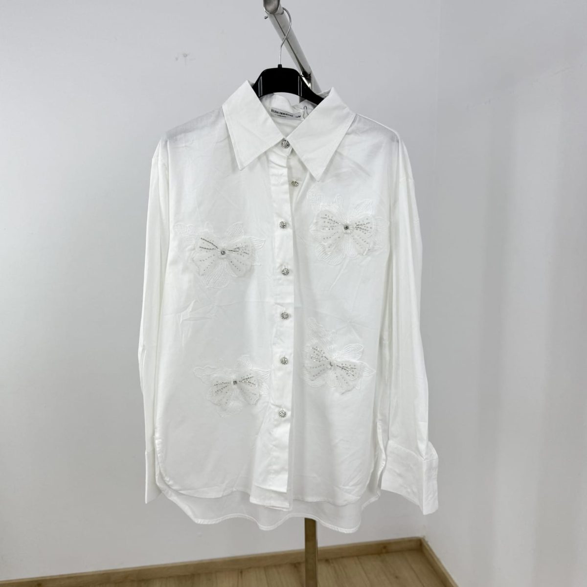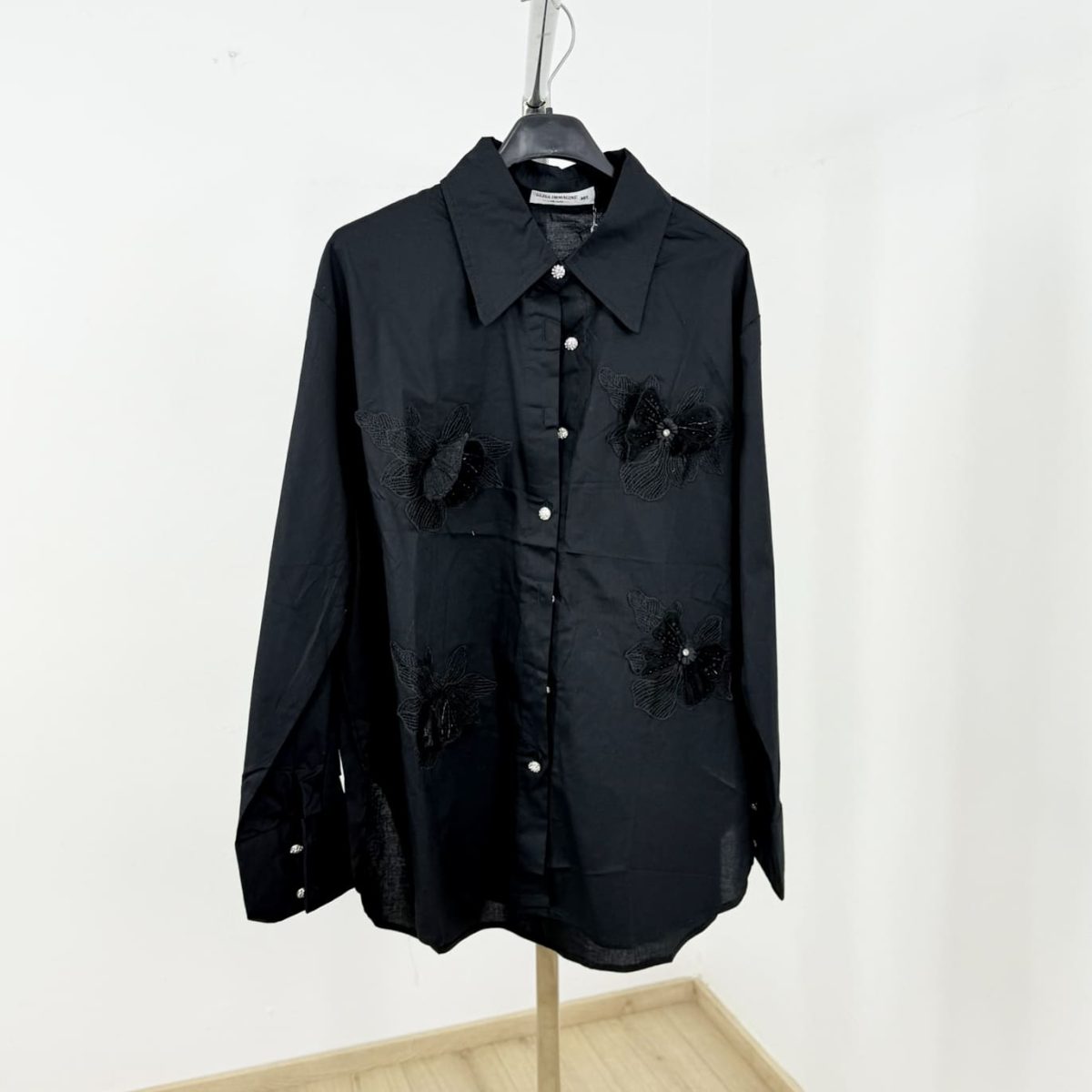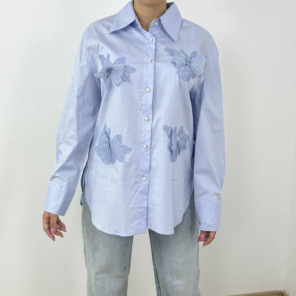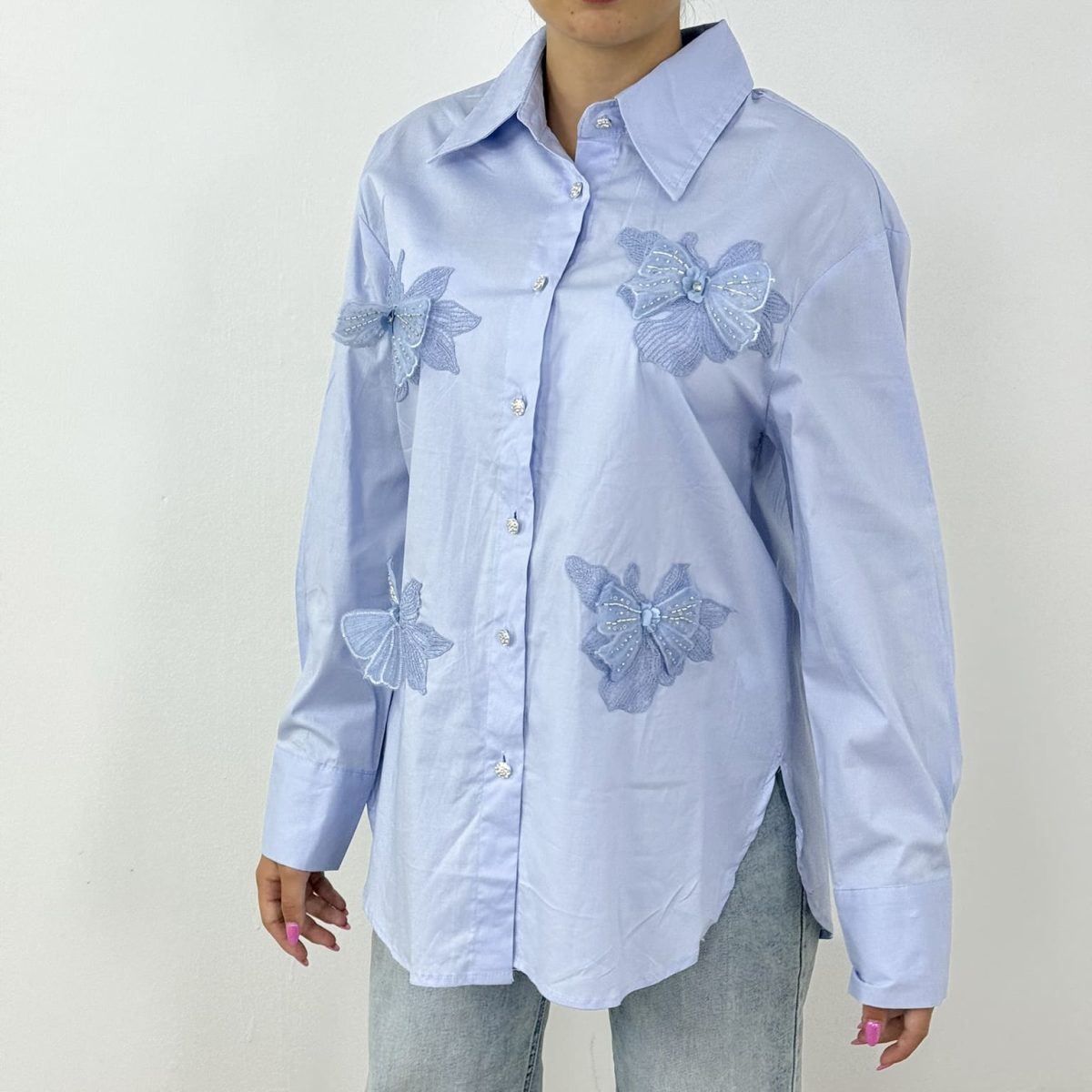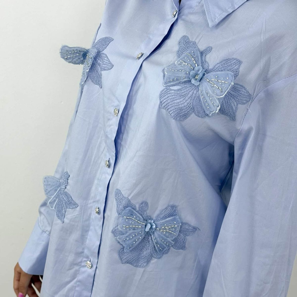 A chic long-sleeve shirt designed with delicate 3D floral embroidery and sparkling crystal buttons that add a refined touch to your everyday wardrobe. Perfect for women seeking elegance with comfort, this shirt pairs easily with jeans, trousers, or skirts for versatile styling.