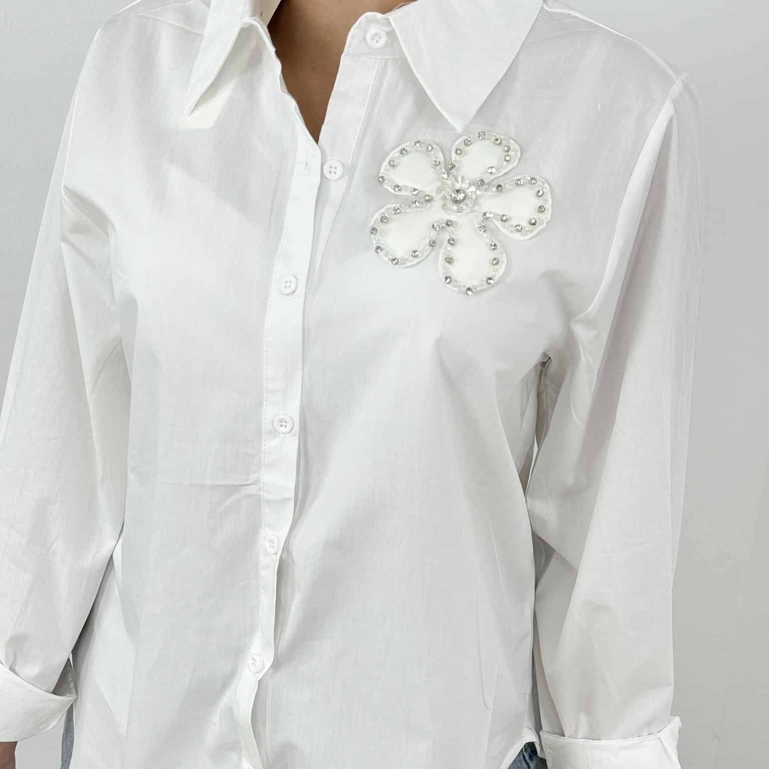 Elevate your everyday style with this chic oversized shirt, featuring a stunning crystal-embellished floral motif for a touch of sparkle. Designed in crisp cotton fabric, this shirt is the perfect blend of modern elegance and effortless comfort. Available in classic black and white, it’s a versatile piece you can wear for both casual and semi-formal occasions.