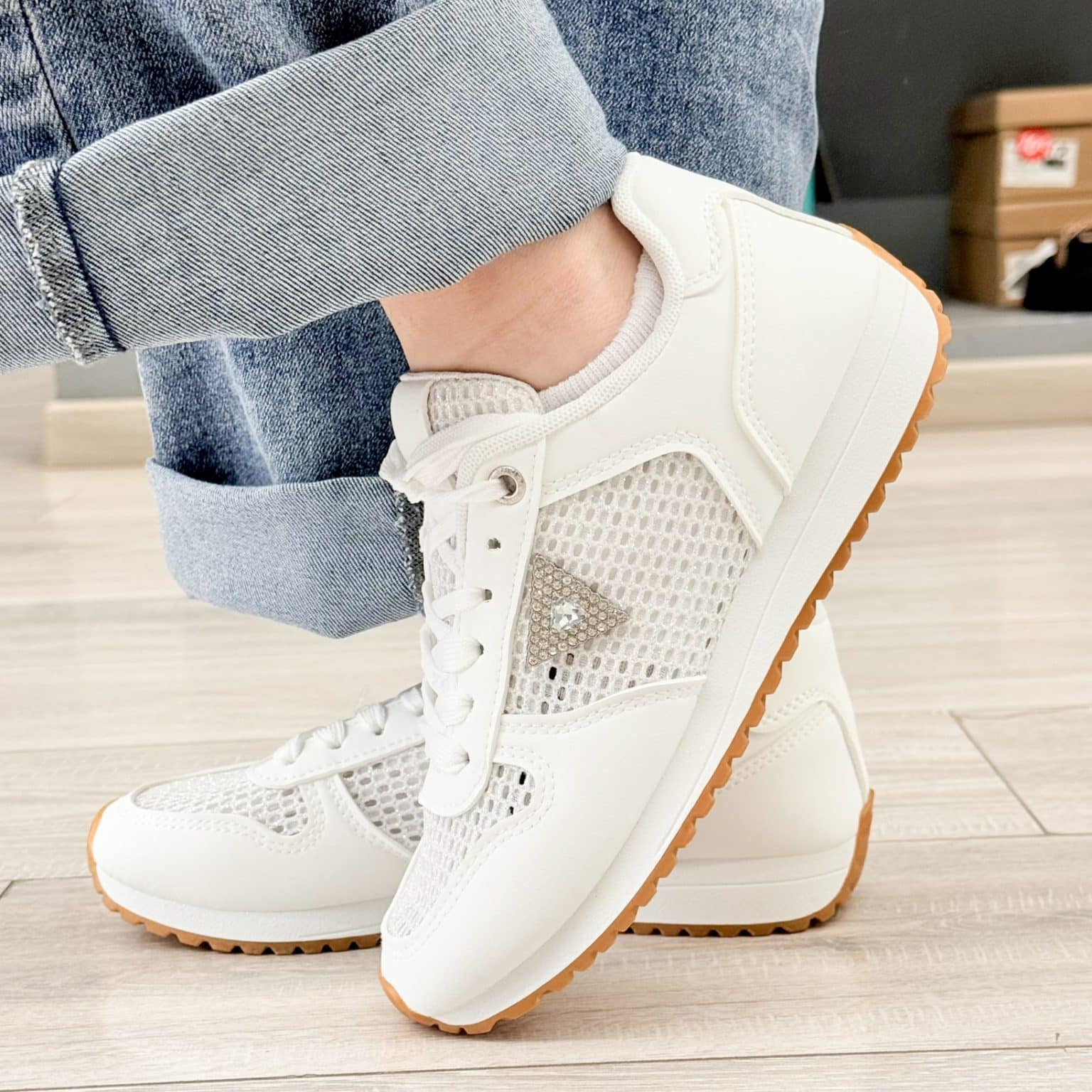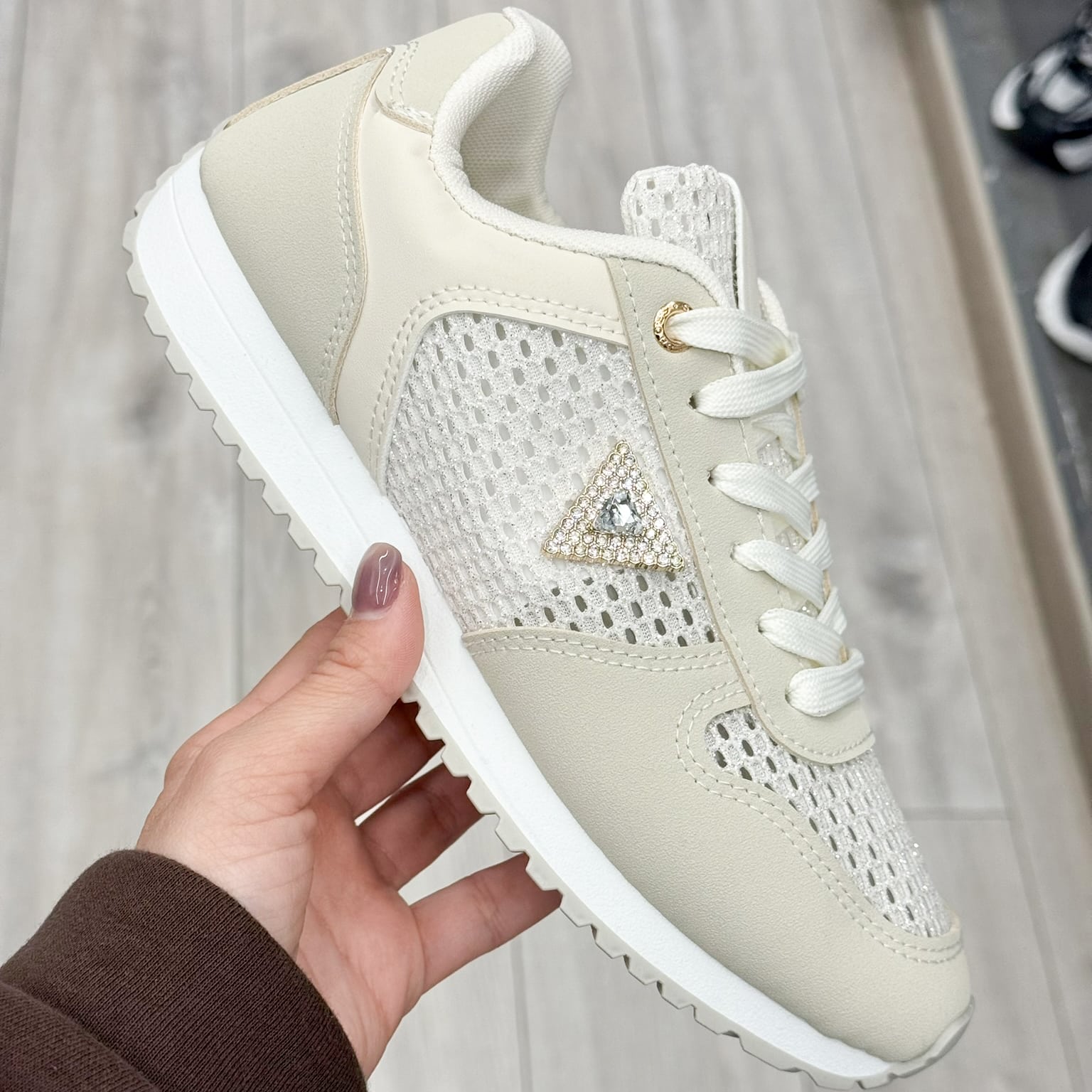 The delicate crystal triangle embellishment adds a refined glam detail without overpowering the clean design. Finished with a slim, cushioned sole and textured rubber outsole for grip, these sneakers combine sporty comfort with modern femininity.