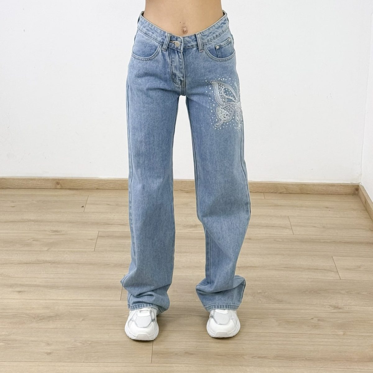 Make a statement with these dazzling mom jeans featuring a stunning crystal-studded butterfly design on the front thigh. Crafted from premium light-wash denim, these jeans combine a classic high-waisted fit with a modern straight-leg silhouette. The delicate rhinestone embellishment adds a touch of glam while keeping your outfit effortlessly cool. Perfect for casual days, nights out, or whenever you want your denim to shine.