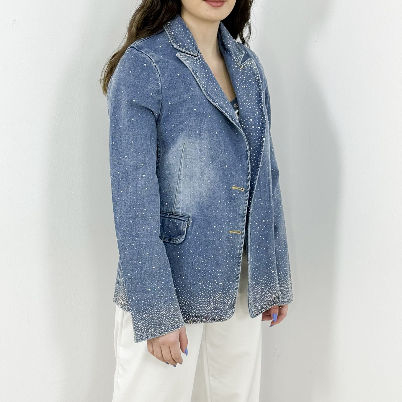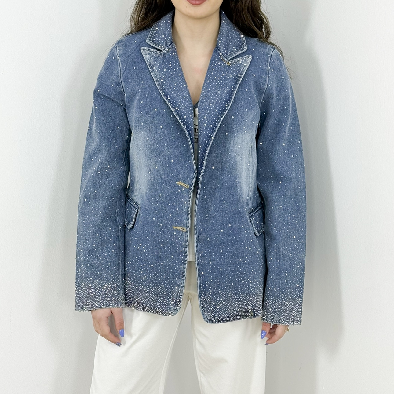 The scattered rhinestones gradually intensify toward the hem and sleeves, adding dimension and a glamorous finish while maintaining a chic, wearable balance. Crafted from high-quality denim with a soft inner feel, this blazer combines comfort with standout elegance.