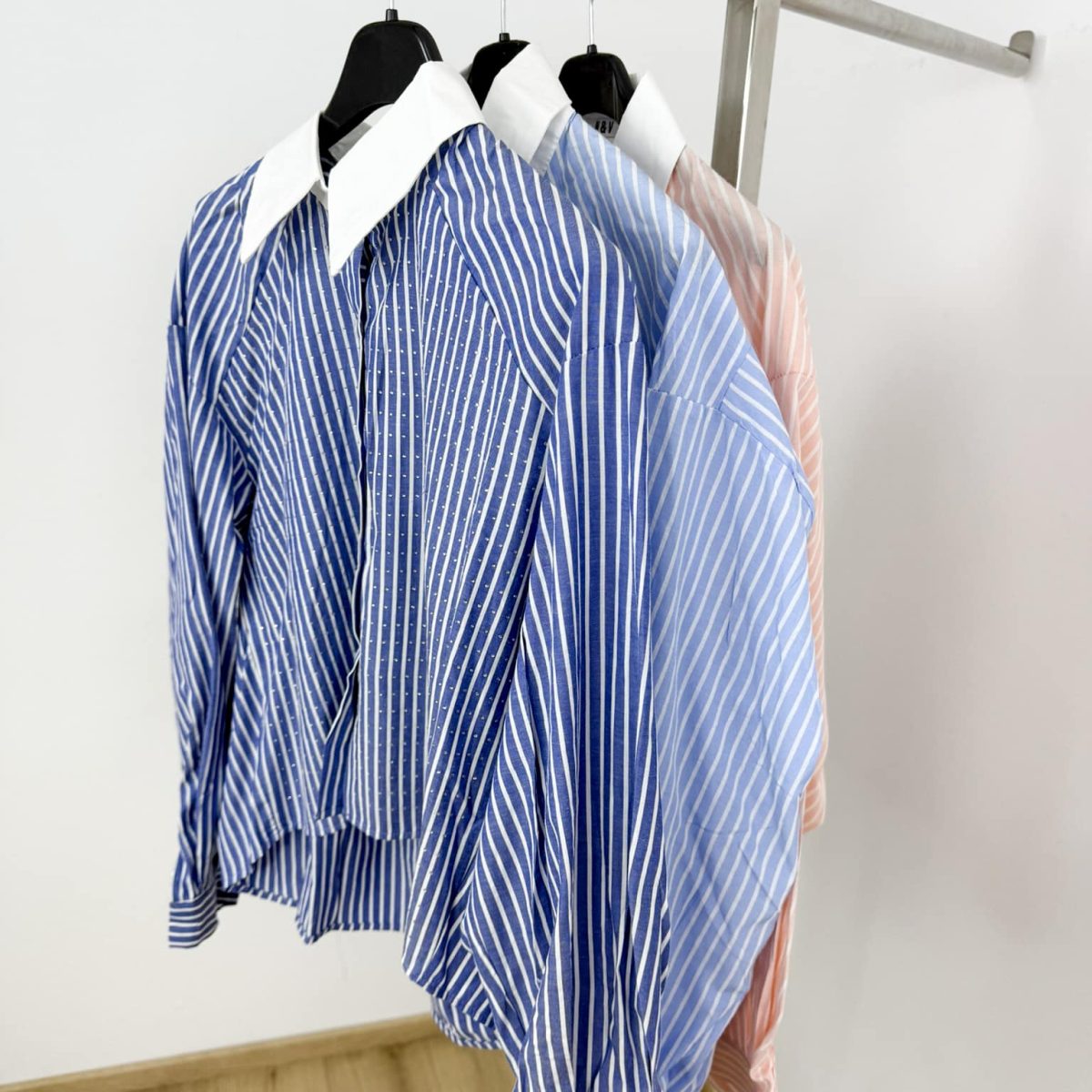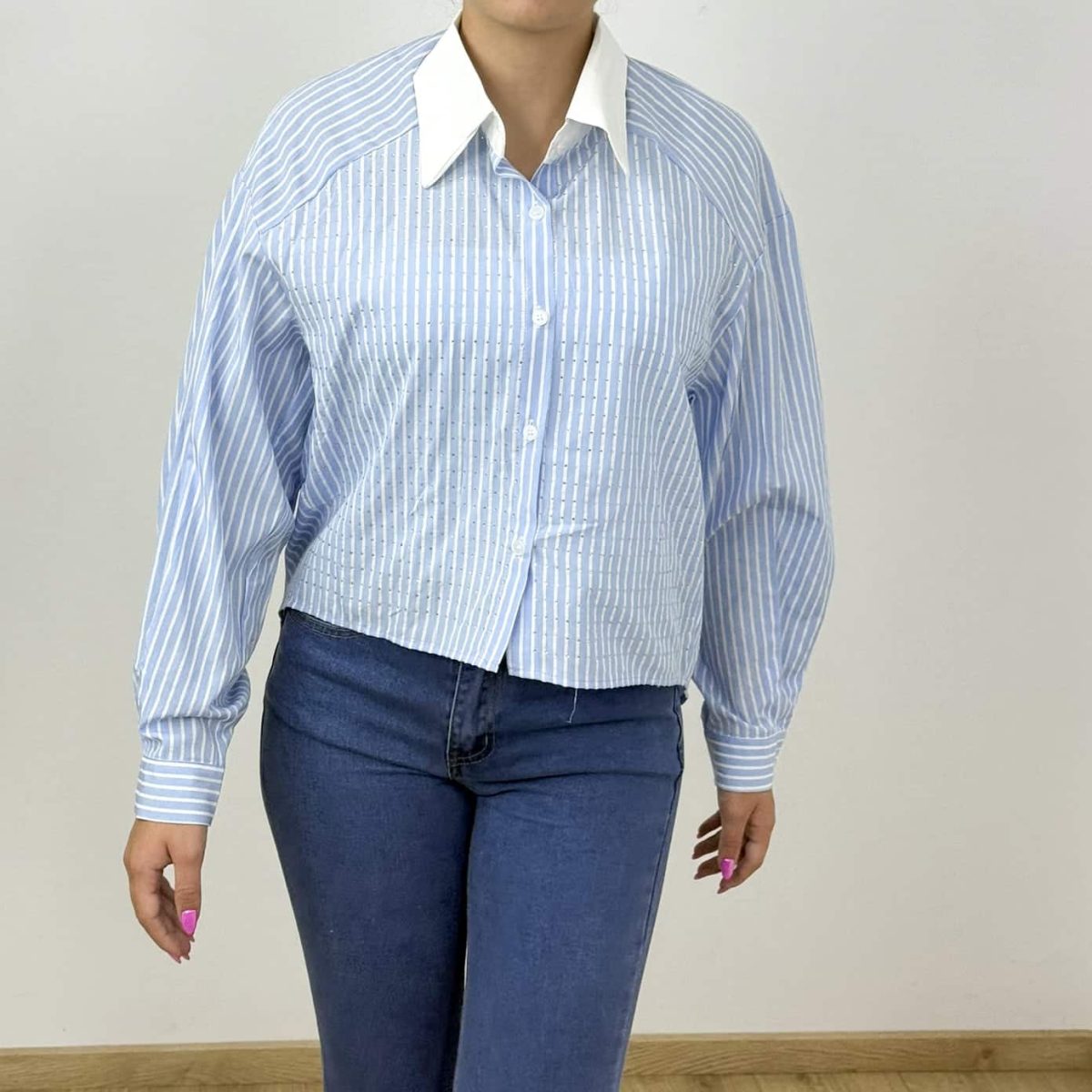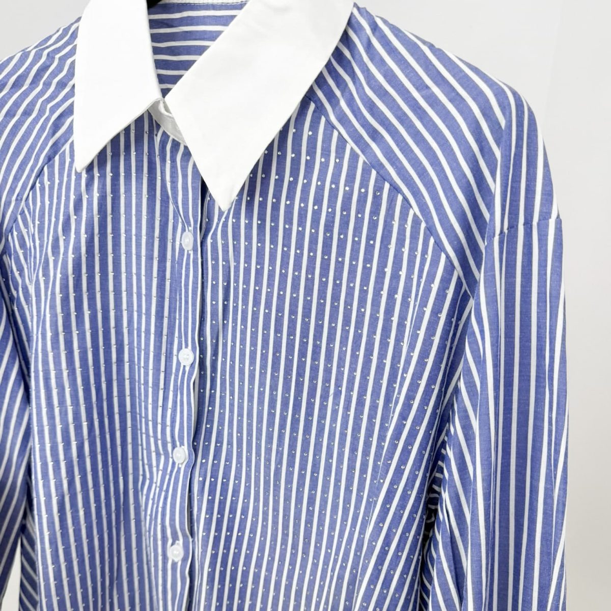 Elevate your everyday look with this modern and chic striped shirt, designed with a striking contrast white collar and subtle crystal embellishments for a touch of sparkle. The relaxed fit and breathable fabric make it perfect for warm-weather styling, while the vertical stripe pattern elongates the silhouette. Available in fresh summer shades to match your mood.