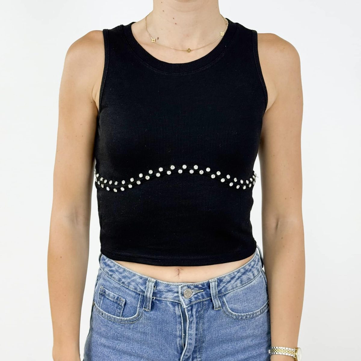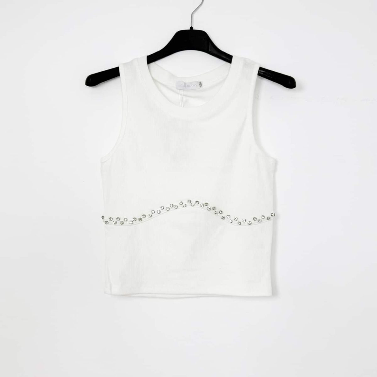 Add a touch of sparkle to your casual wardrobe with our Crystal Wave Ribbed Crop Top. Designed for modern women who love understated glam, this top features a flattering fitted cut and an elegant wavy line of rhinestones across the bust. Available in classic black and fresh white, it’s the perfect blend of comfort and style for summer days and nights.