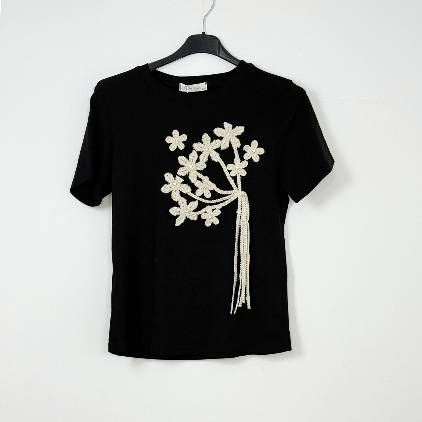 Add a touch of elegance to your everyday summer wardrobe with this beautifully detailed t-shirt featuring delicate lace floral appliqué with rhinestone centers. This short-sleeve top combines comfort with feminine charm, making it ideal for daytime looks or casual evening outings.