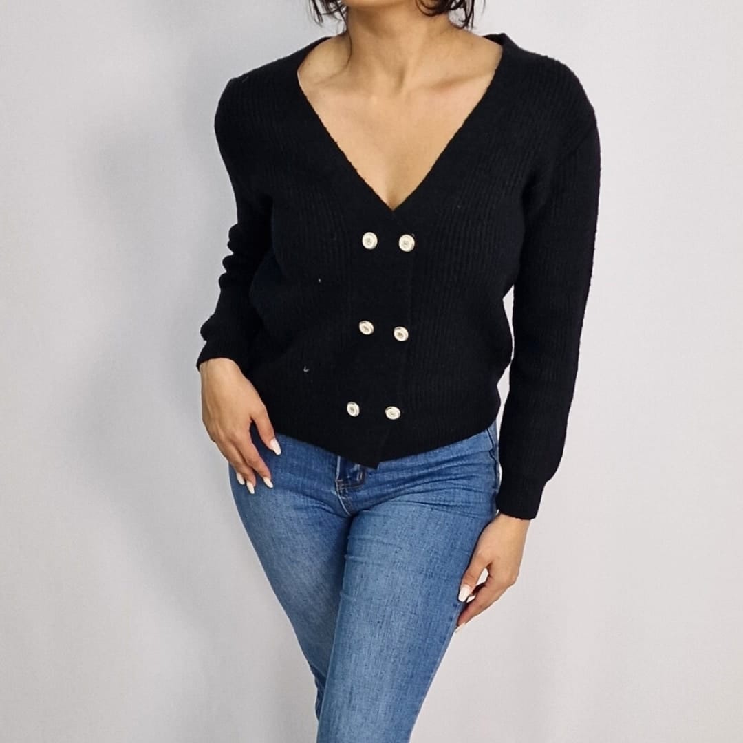 Elevate your casual wardrobe with this chic double-breasted cardigan. Designed with a deep V-neckline and textured knit finish, it features elegant button detailing that adds a refined touch. Perfect for layering over your favorite jeans or dresses, this cardigan offers a cozy fit without compromising on style. Available in a variety of colors to suit every mood and outfit.