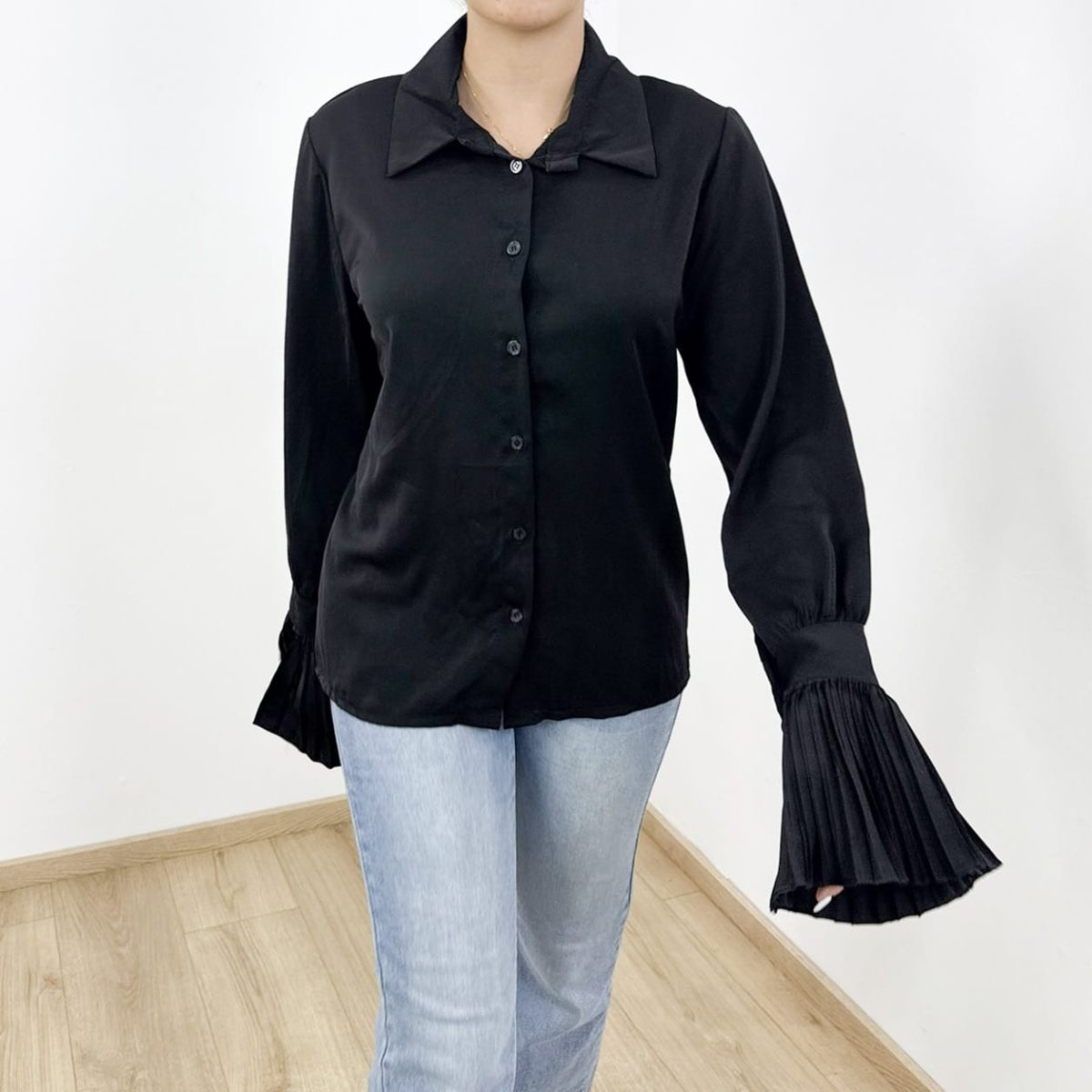 Elegant Black Shirt with Pleated Cuff Detail