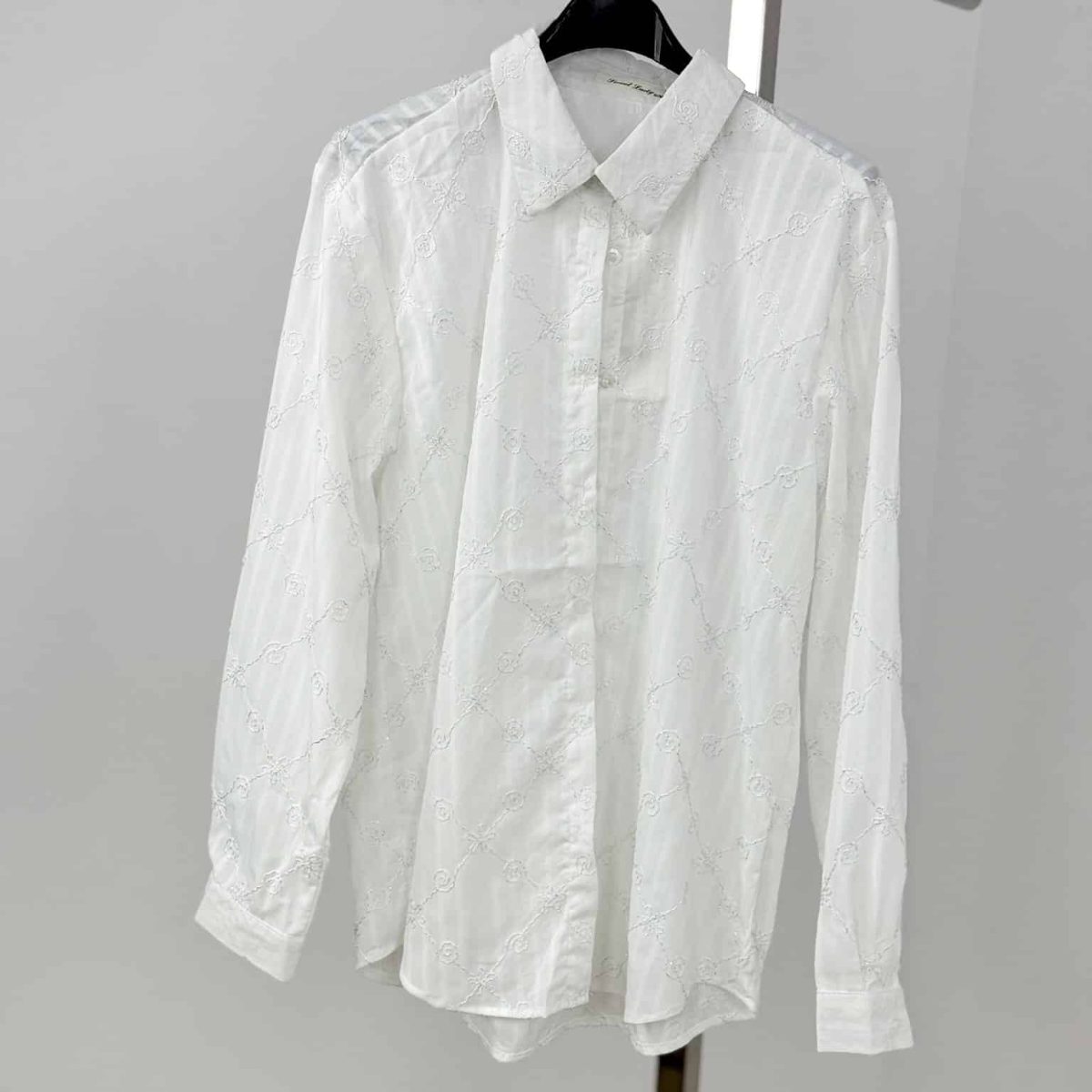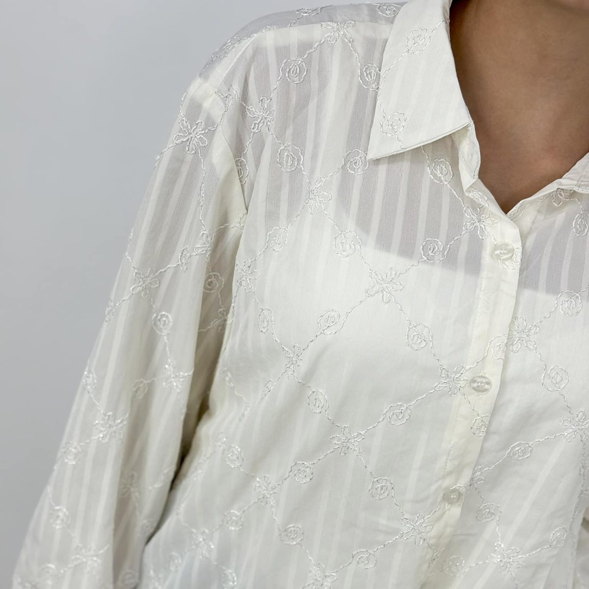 Upgrade your summer wardrobe with this elegant sheer embroidered shirt, designed for women who love a blend of sophistication and comfort. The delicate floral embroidery and subtle stripe texture create a timeless yet modern look, perfect for casual outings, office chic, or evening elegance.
