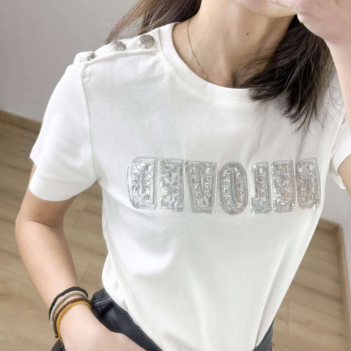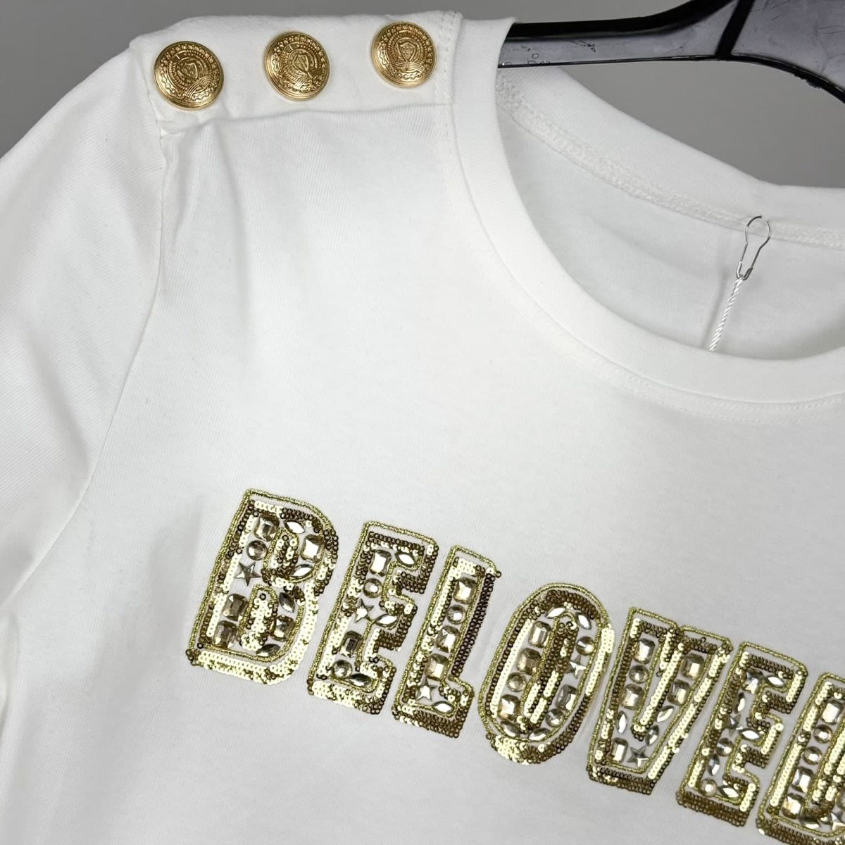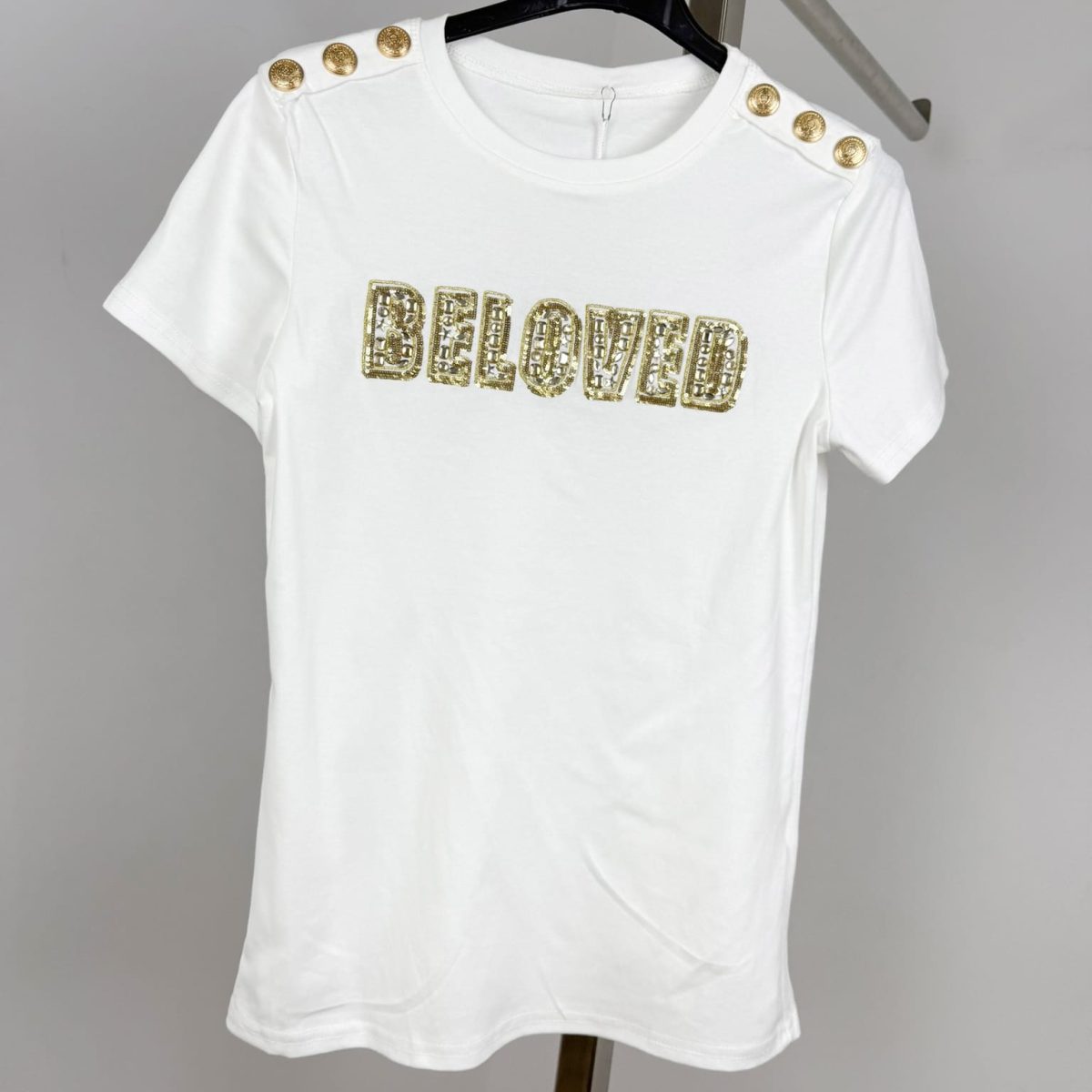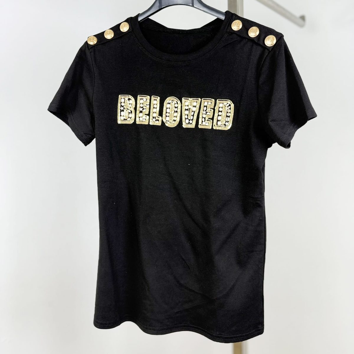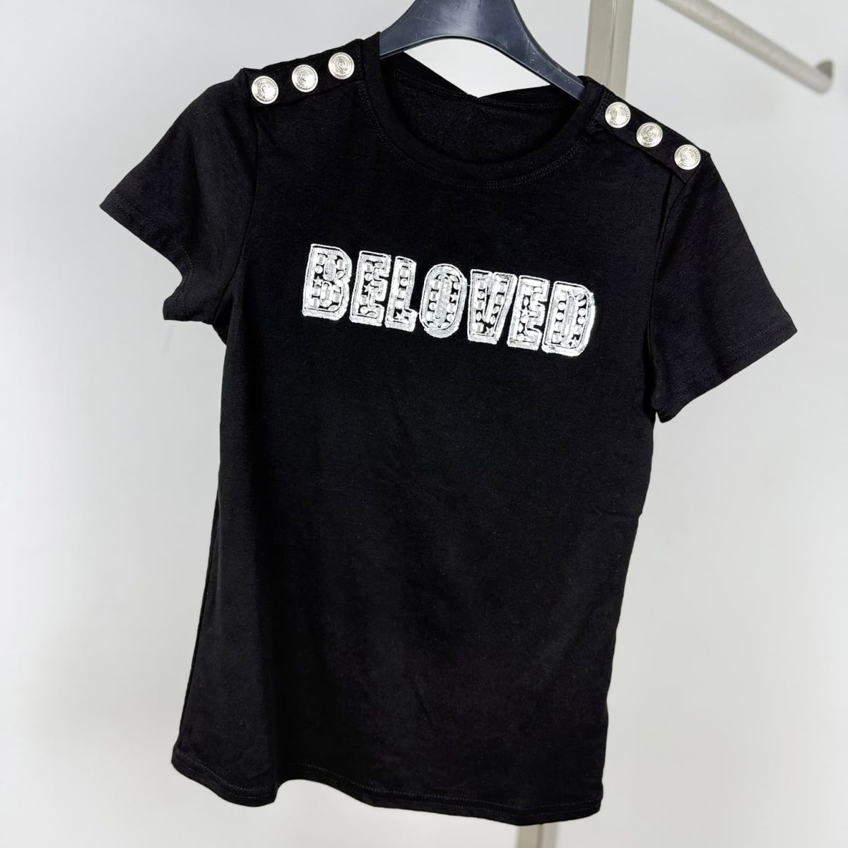 Make a statement with the Embellished “Beloved” Shoulder Button T-Shirt, a perfect blend of elegance and edgy fashion. Featuring a bold sequined “Beloved” lettering with intricate detailing, this t-shirt is designed for those who love a touch of glamour. The decorative gold or silver buttons on the shoulders add a chic military-inspired accent, making it a standout piece. Crafted from premium soft fabric, it offers comfort with a flattering fit. Available in classic black and white, this stylish tee is perfect for elevating your everyday wardrobe.