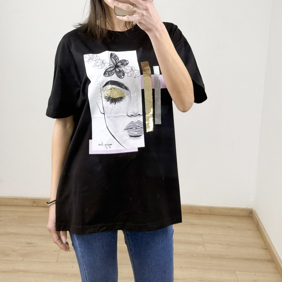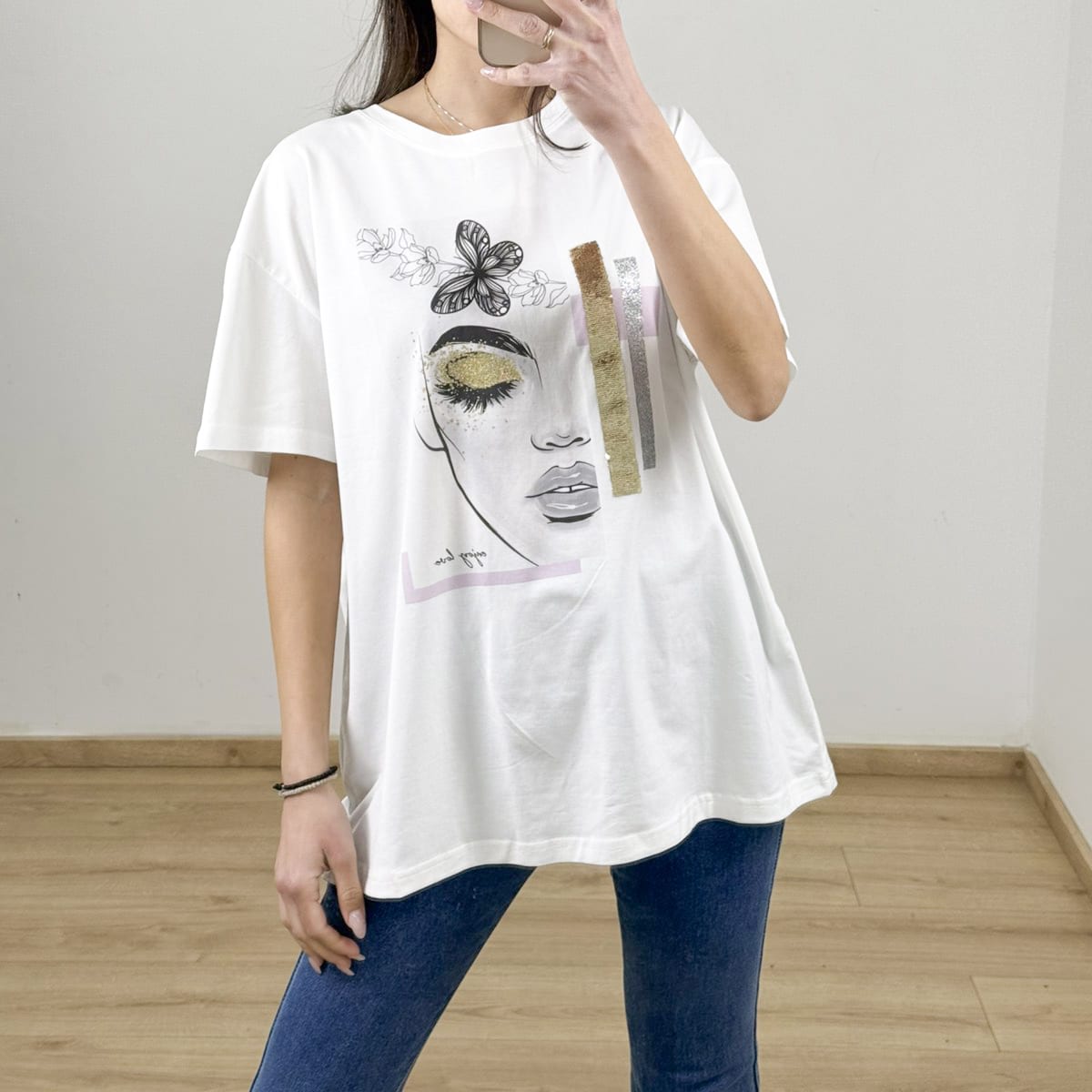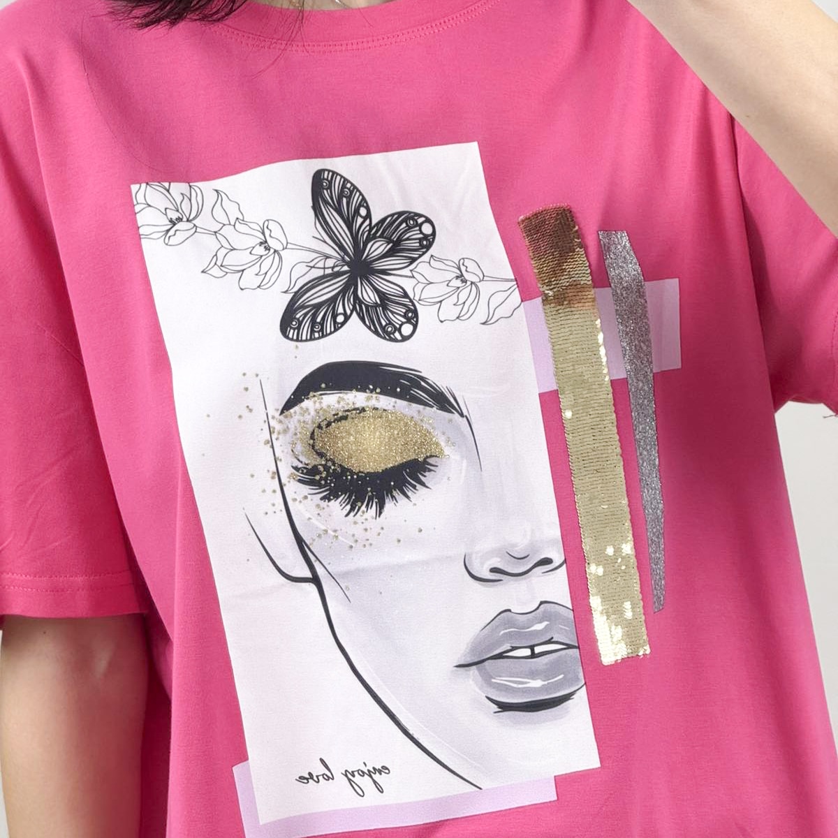 Make a bold statement with this eye-catching oversized tee featuring a stunning artistic face print, adorned with glitter accents and sequin embellishments for a touch of glam. The soft fabric ensures all-day comfort, while the relaxed fit makes it perfect for casual styling. Available in black, white, and pink for versatile styling options.