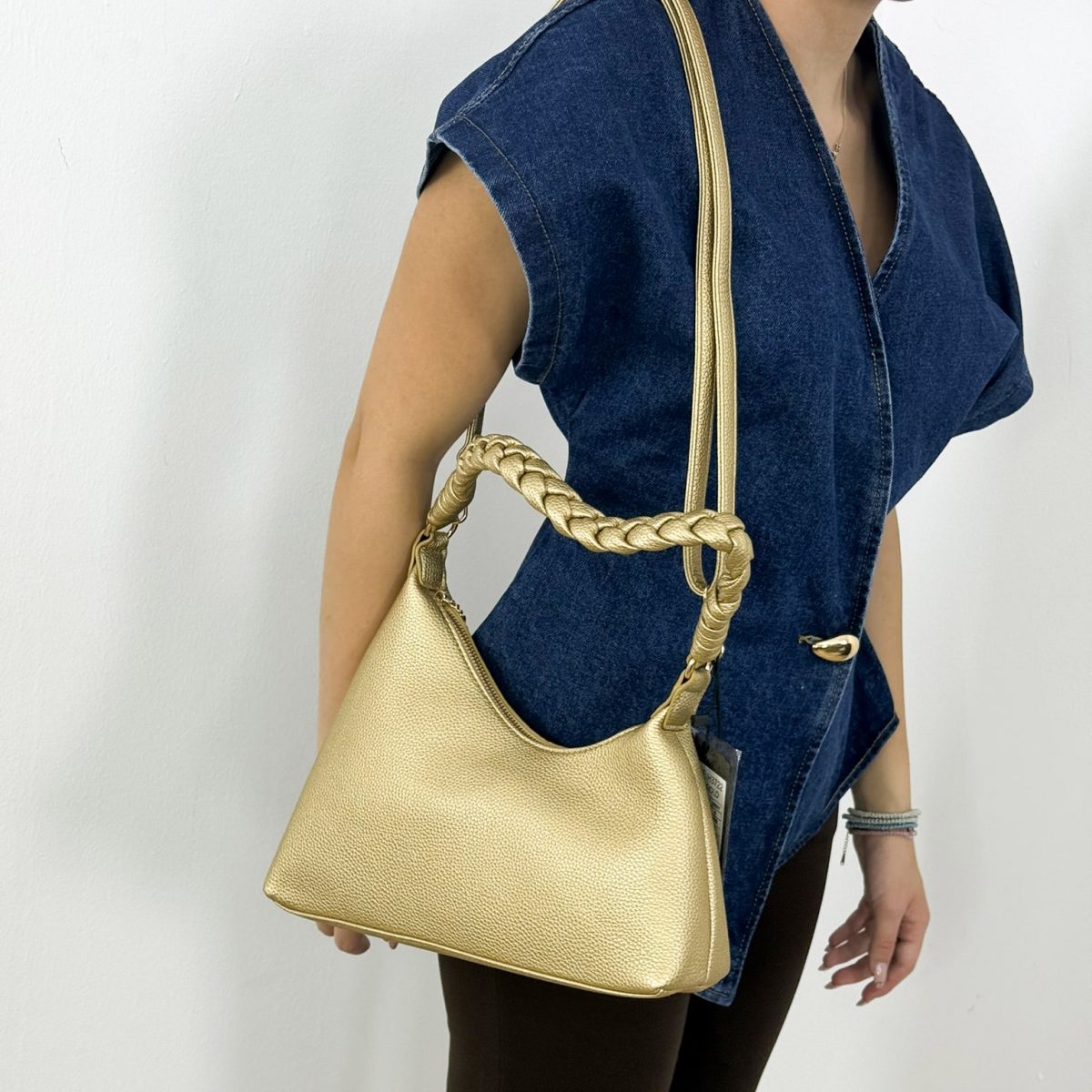 Turn heads with this Gold Braided-Handle Textured Shoulder Bag — a statement piece that blends elegance with modern flair. Crafted from premium faux leather with a soft pebble-textured finish, it features a beautifully braided top handle that adds a luxurious, handcrafted touch. The spacious interior and additional long strap offer versatile styling, whether worn on the shoulder or crossbody. Perfect for day-to-night outfits, special occasions, or adding a glamorous twist to your everyday look.