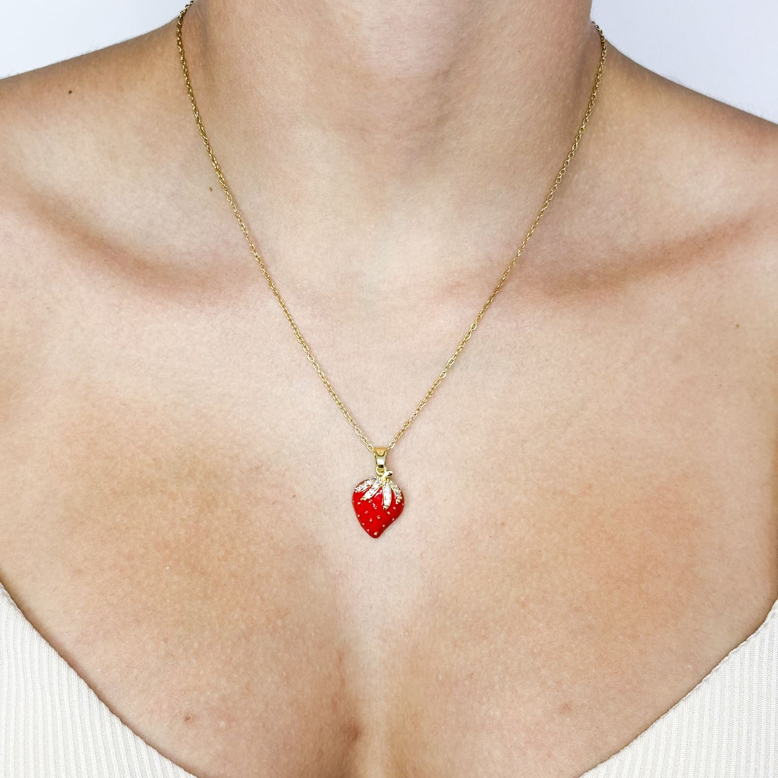 Add a playful yet elegant touch to your summer look with this stunning golden necklace featuring a glossy red berry-shaped pendant accented with delicate crystal details. The fine gold-tone chain perfectly complements the vivid enamel finish of the charm, offering a whimsical yet polished vibe that’s ideal for warm-weather outfits.