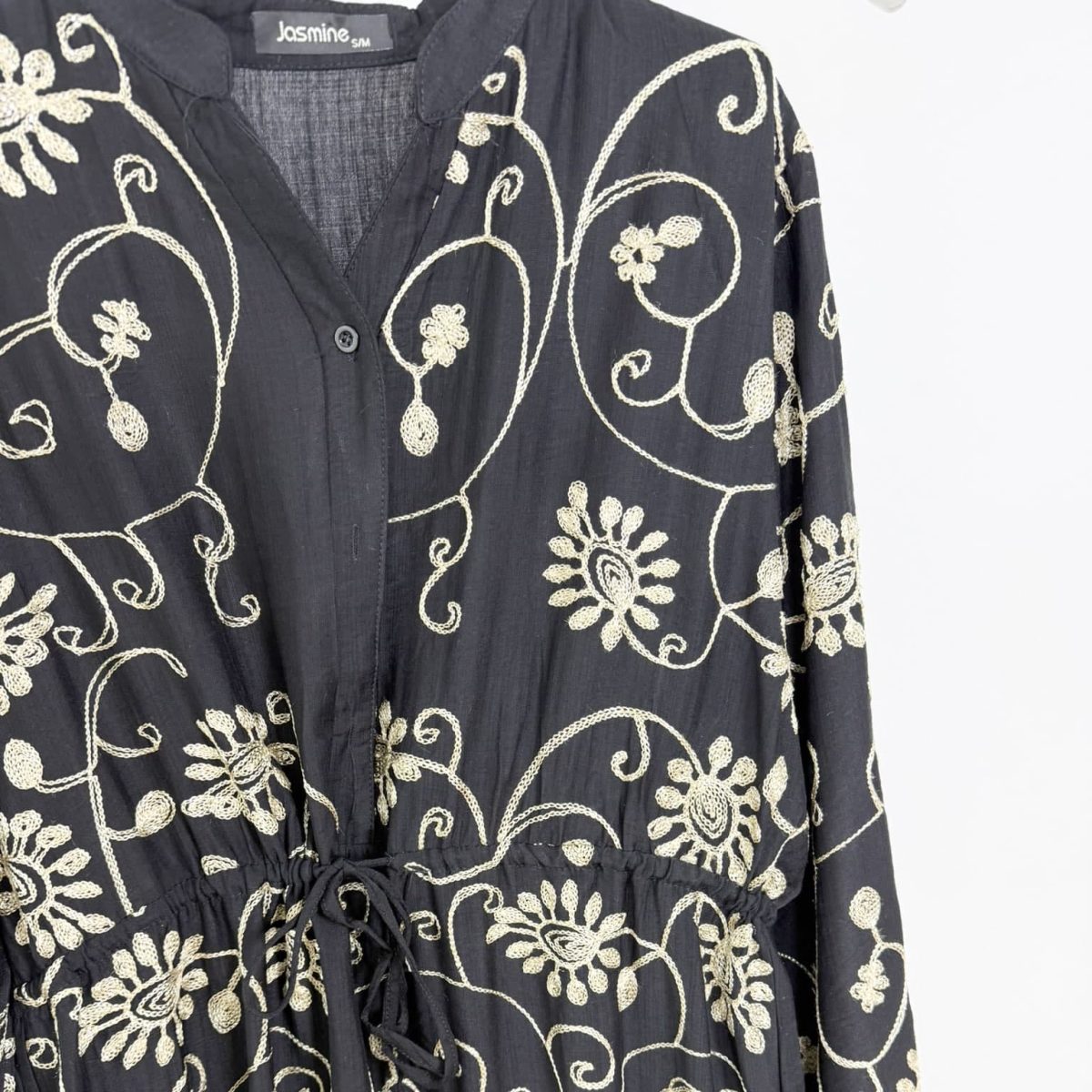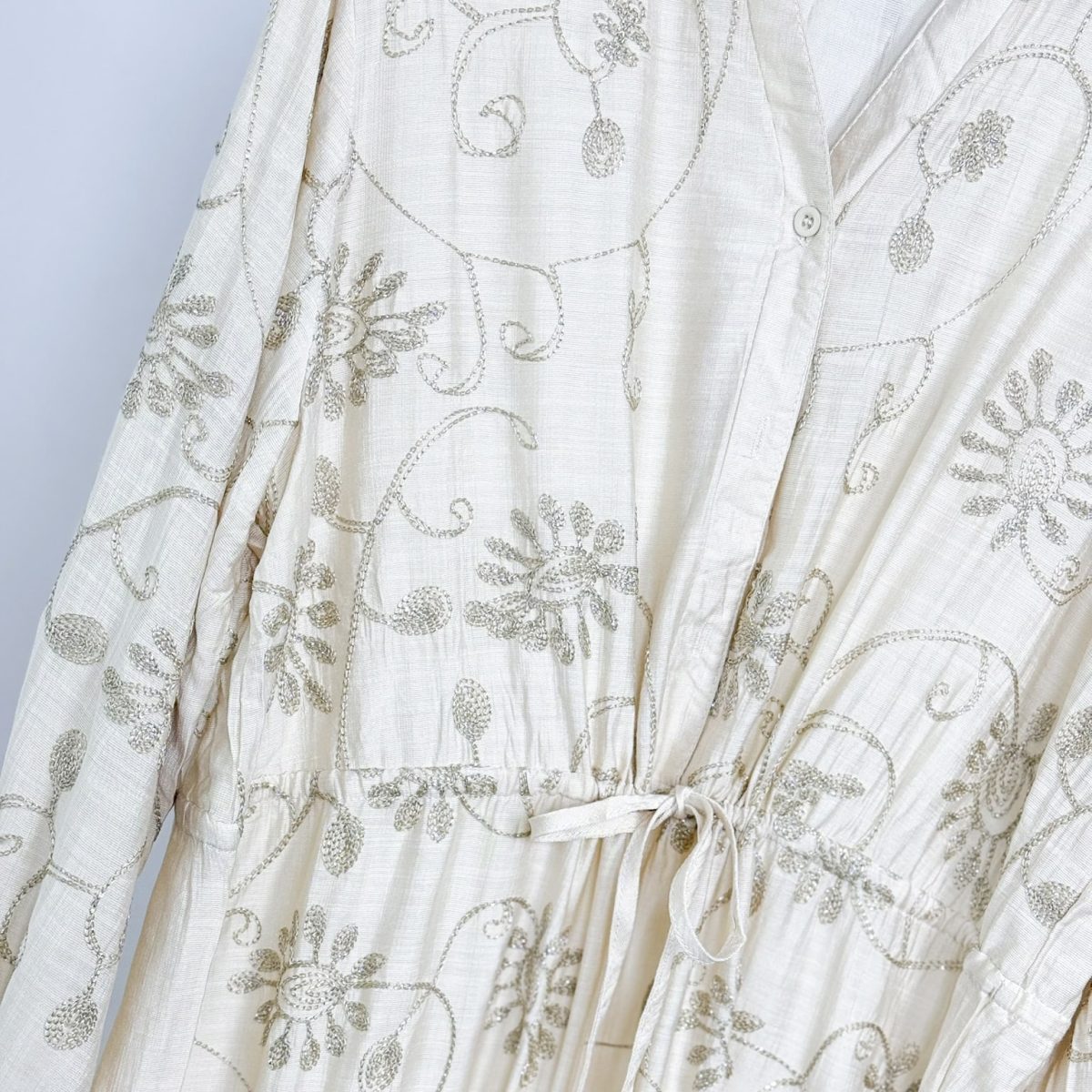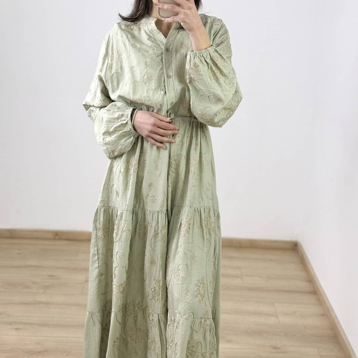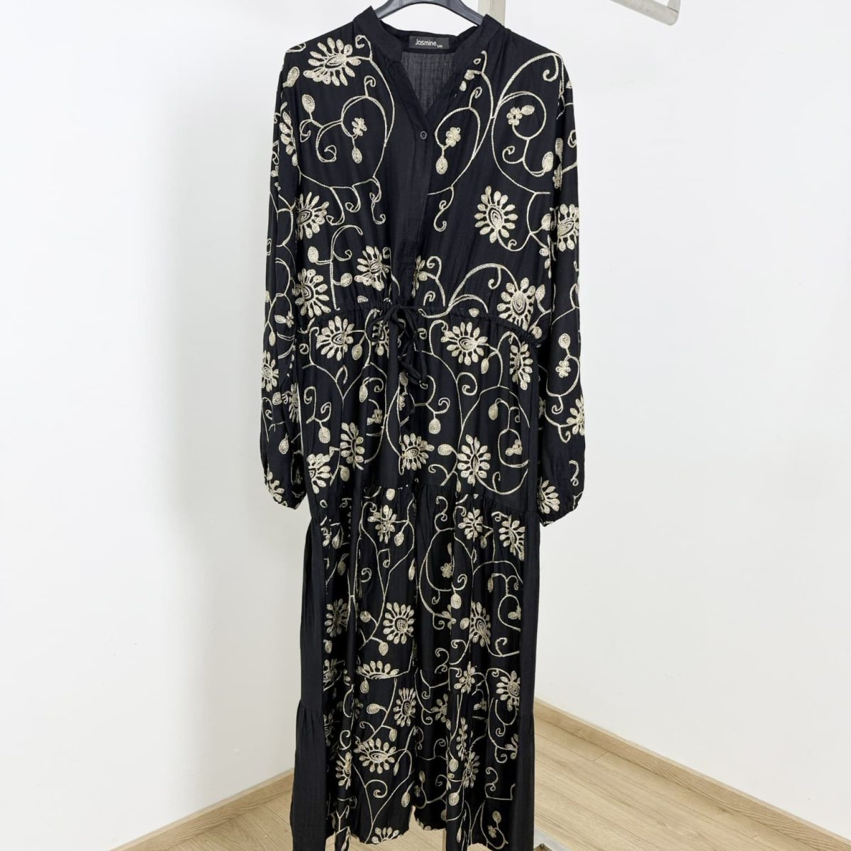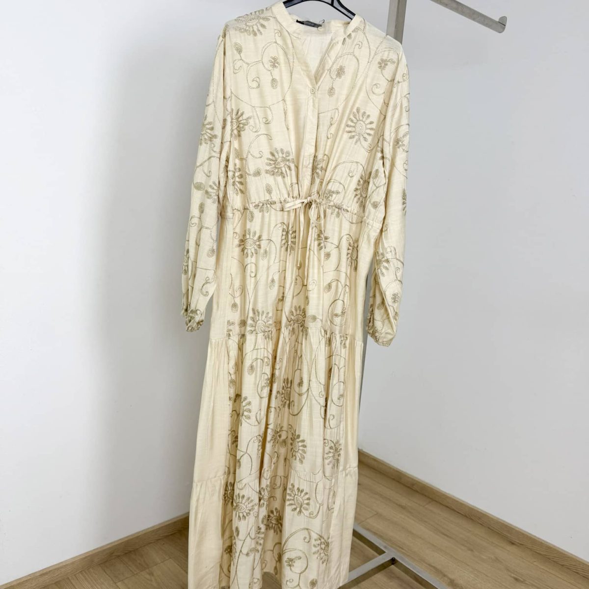 This elegant maxi dress features intricate floral embroidery with a shimmering golden thread, adding a touch of sophistication to its flowing, tiered silhouette. Designed with a soft V-neckline, long sleeves, and a drawstring waist for a customizable fit, this dress blends comfort with timeless charm. Perfect for special occasions or everyday elegance. Available in sage green, black, and ivory.