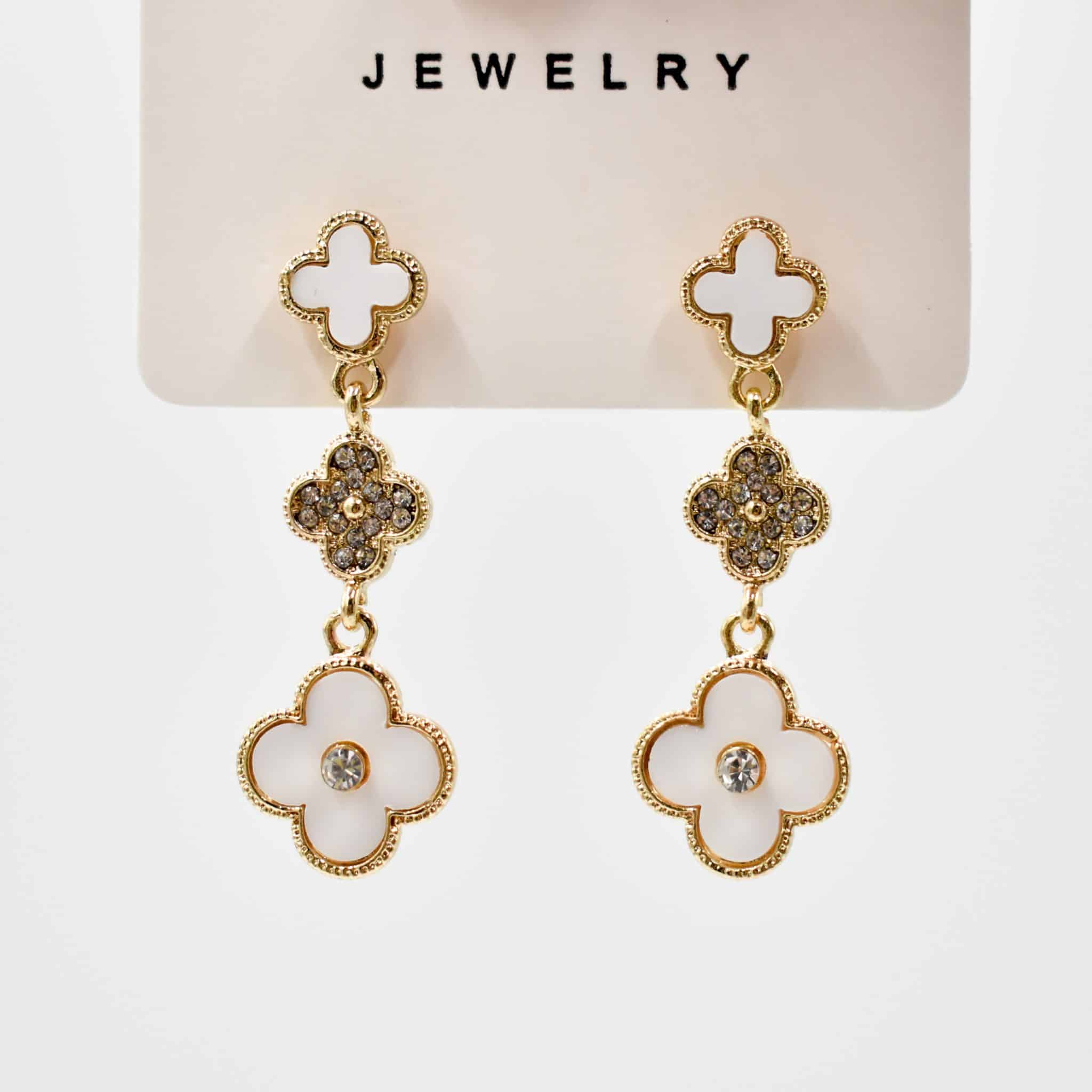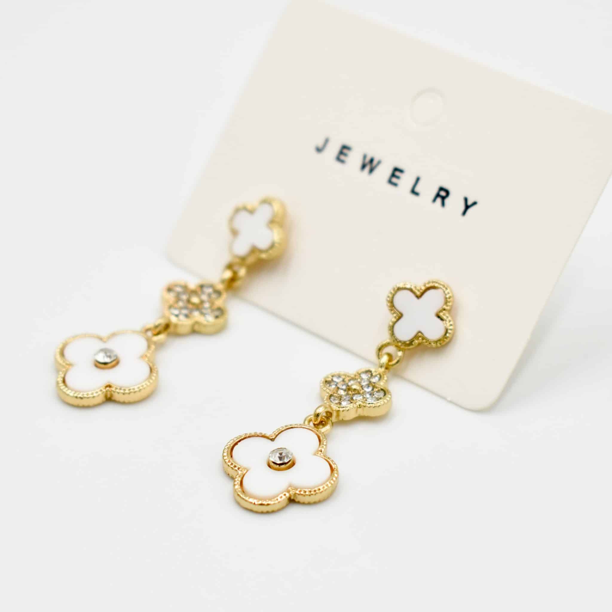 Add a touch of elegance and charm with the Golden Clover Drop Earrings — a refined design featuring triple clover motifs in glossy white enamel and sparkling crystal embellishments. Set in a polished gold-tone finish, these lightweight earrings offer a delicate yet eye-catching drop silhouette perfect for both daytime flair and evening sophistication. A chic blend of feminine grace and classic style.