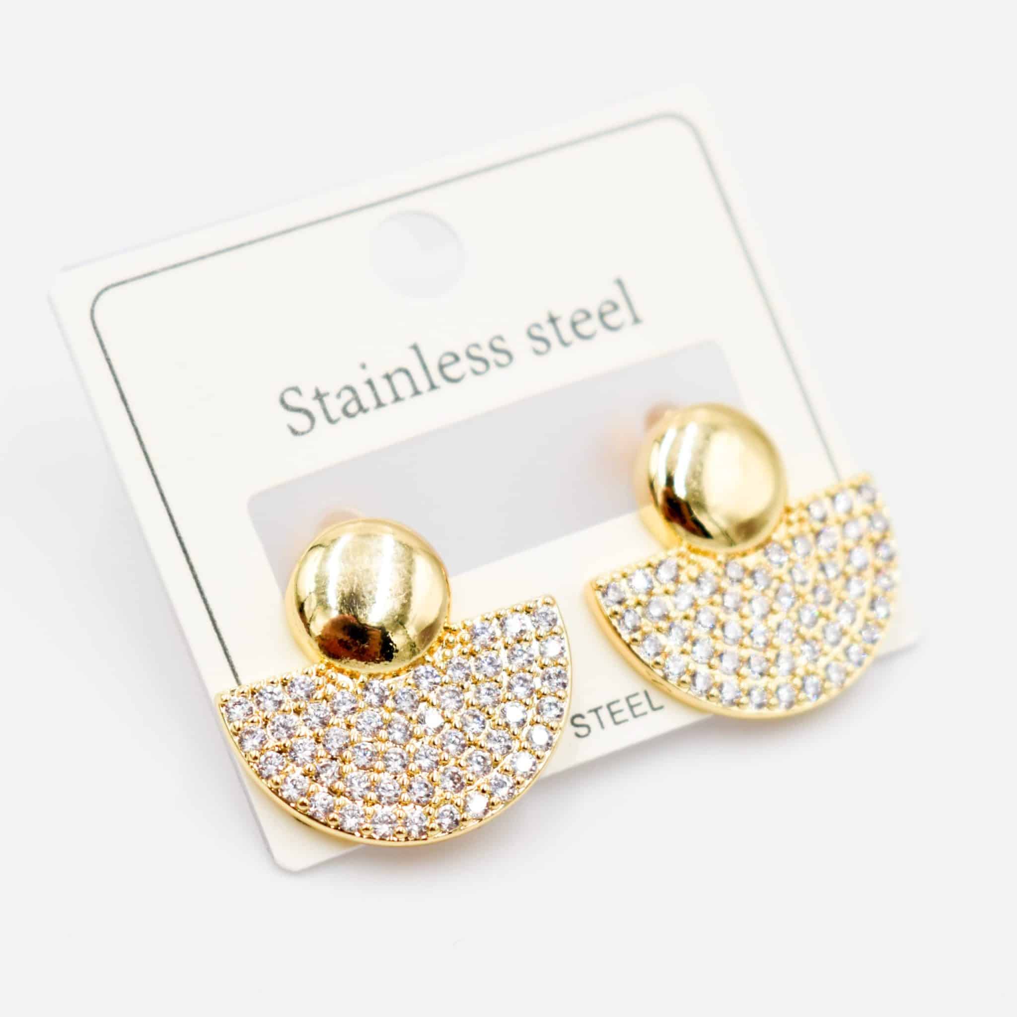 Add instant glamour to your summer look with these radiant Golden Halo Crystal Fan Earrings. Their bold semi-circle silhouette, encrusted with shimmering crystals, is balanced by a sleek polished dome top for a luxurious modern touch.