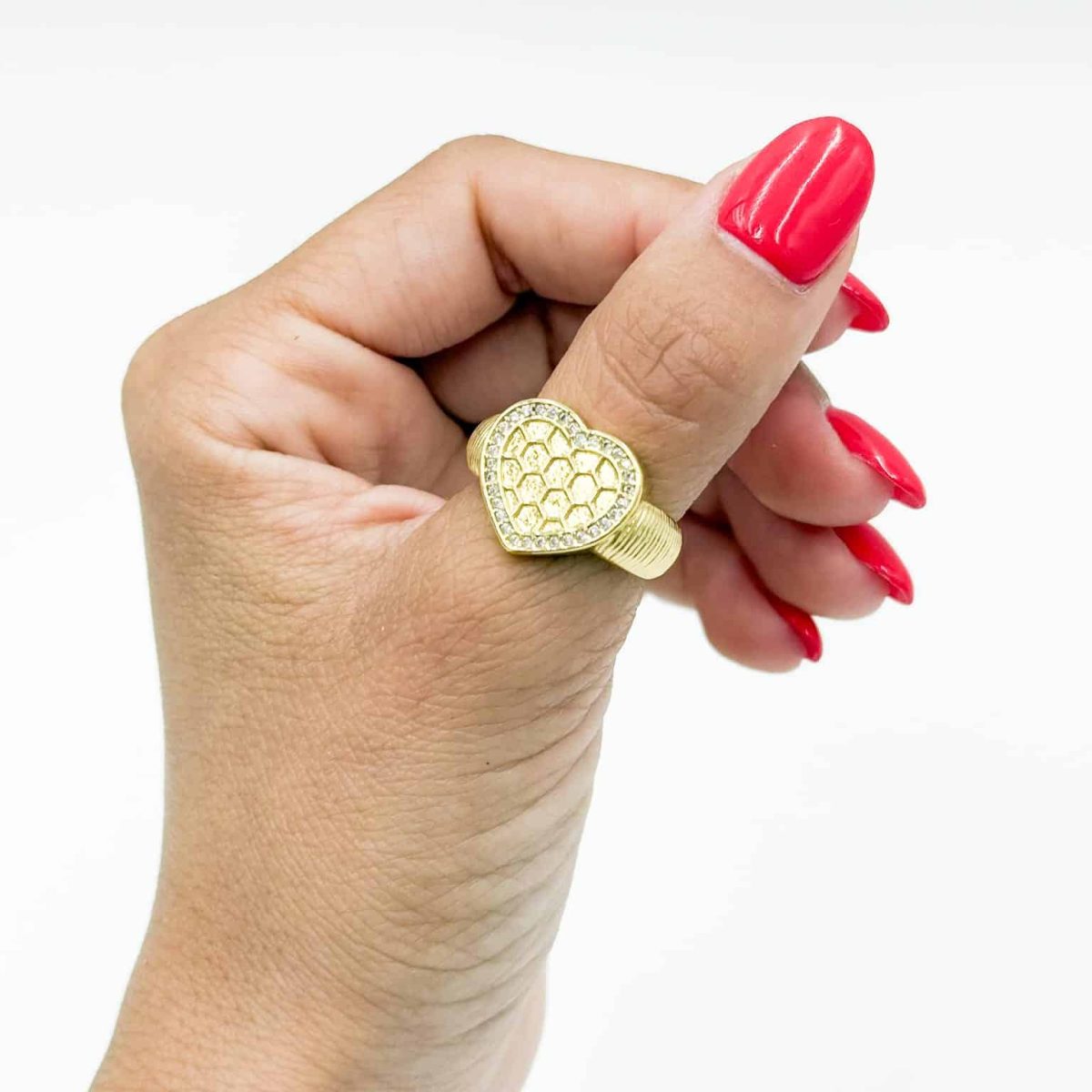 Make a bold yet romantic statement with the Golden Honeycomb Heart Statement Ring — a unique blend of charm and sophistication. Featuring a heart-shaped design with a textured honeycomb pattern, surrounded by shimmering crystals, this ring is the perfect mix of trendy and timeless.