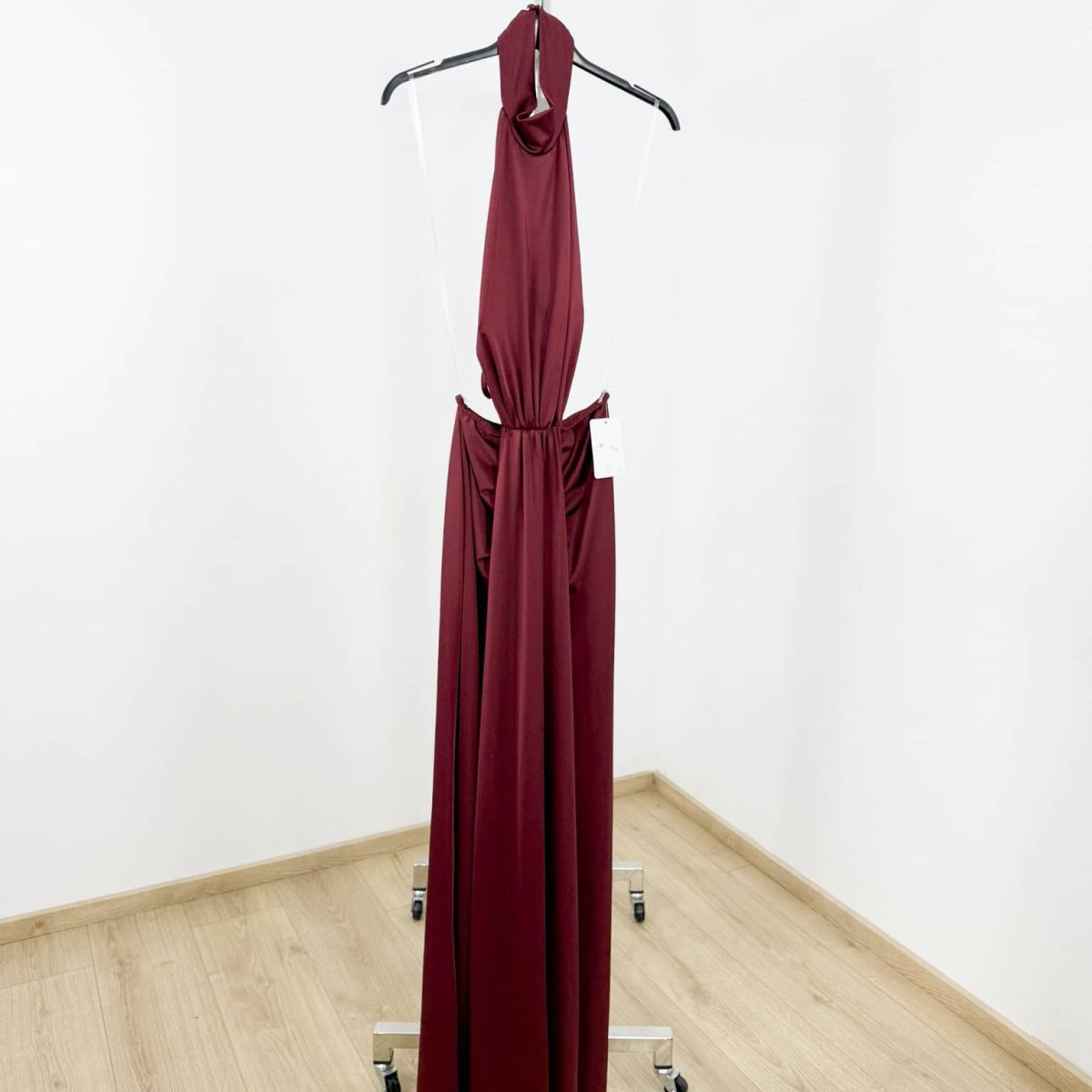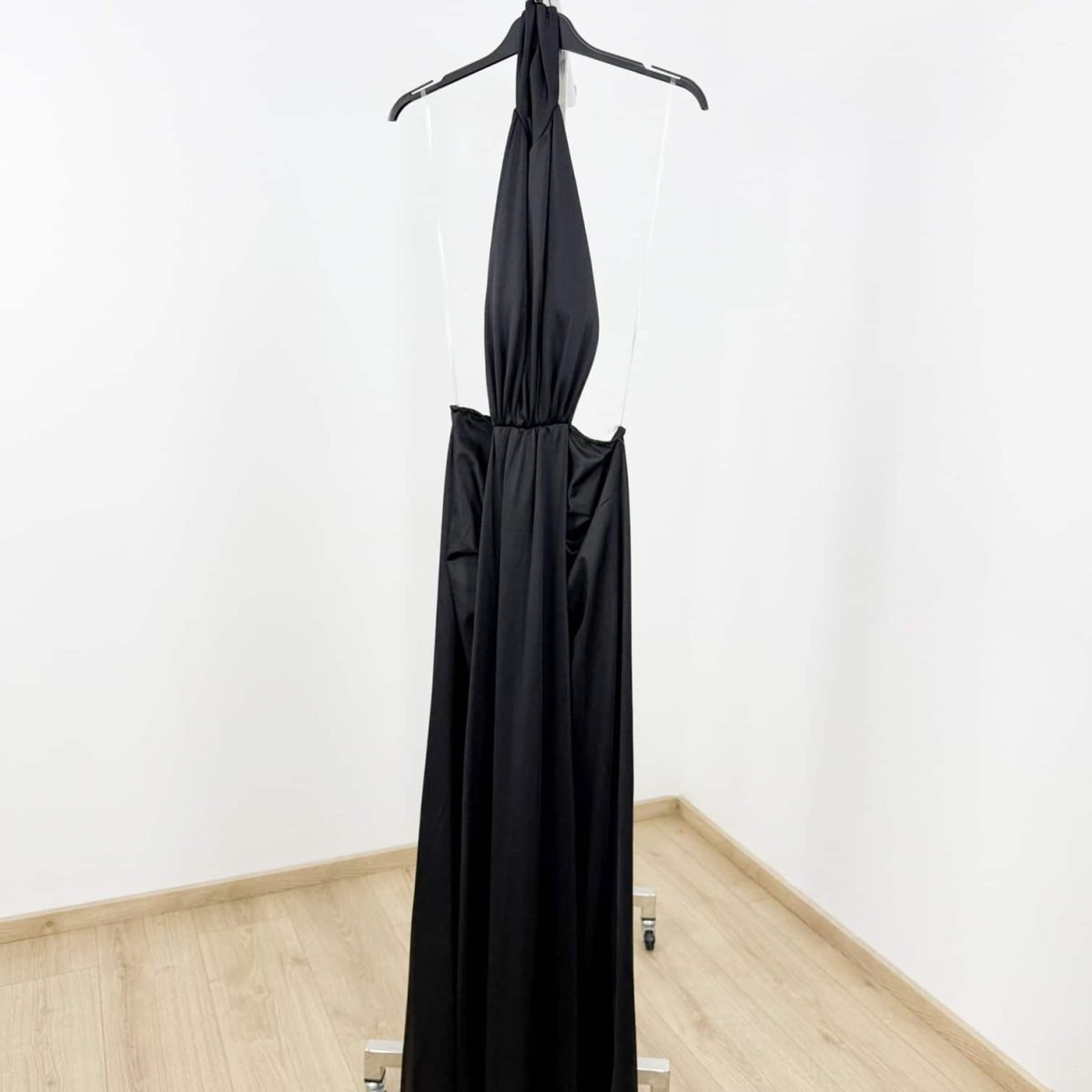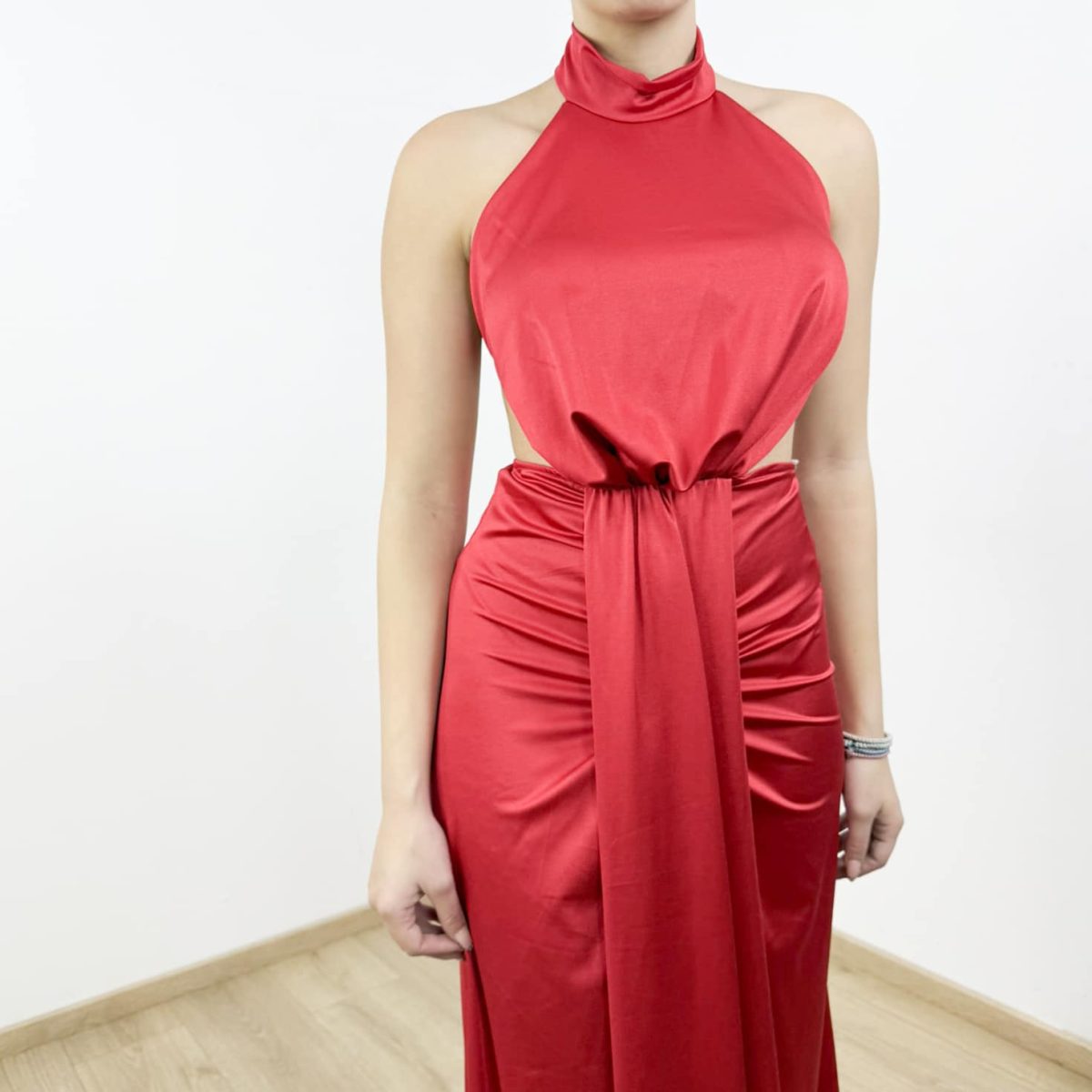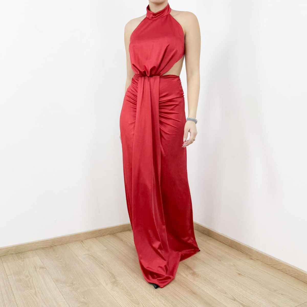 Elegant and striking, this maxi dress is designed to create a refined statement silhouette. Featuring a halter neck with a high neckline, it beautifully frames the shoulders and neckline. The open side cut-out adds a modern, feminine touch, while the draped waist detail enhances the figure and creates a flattering flow through the skirt. The long, fluid length offers graceful movement, making this dress ideal for evening events, formal occasions, and special celebrations.