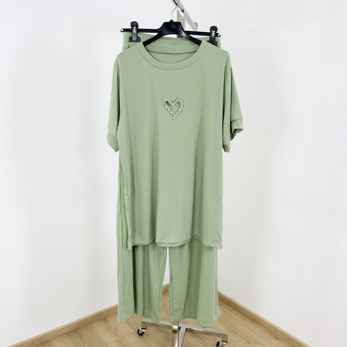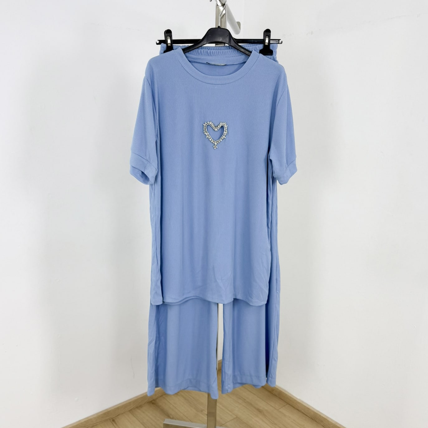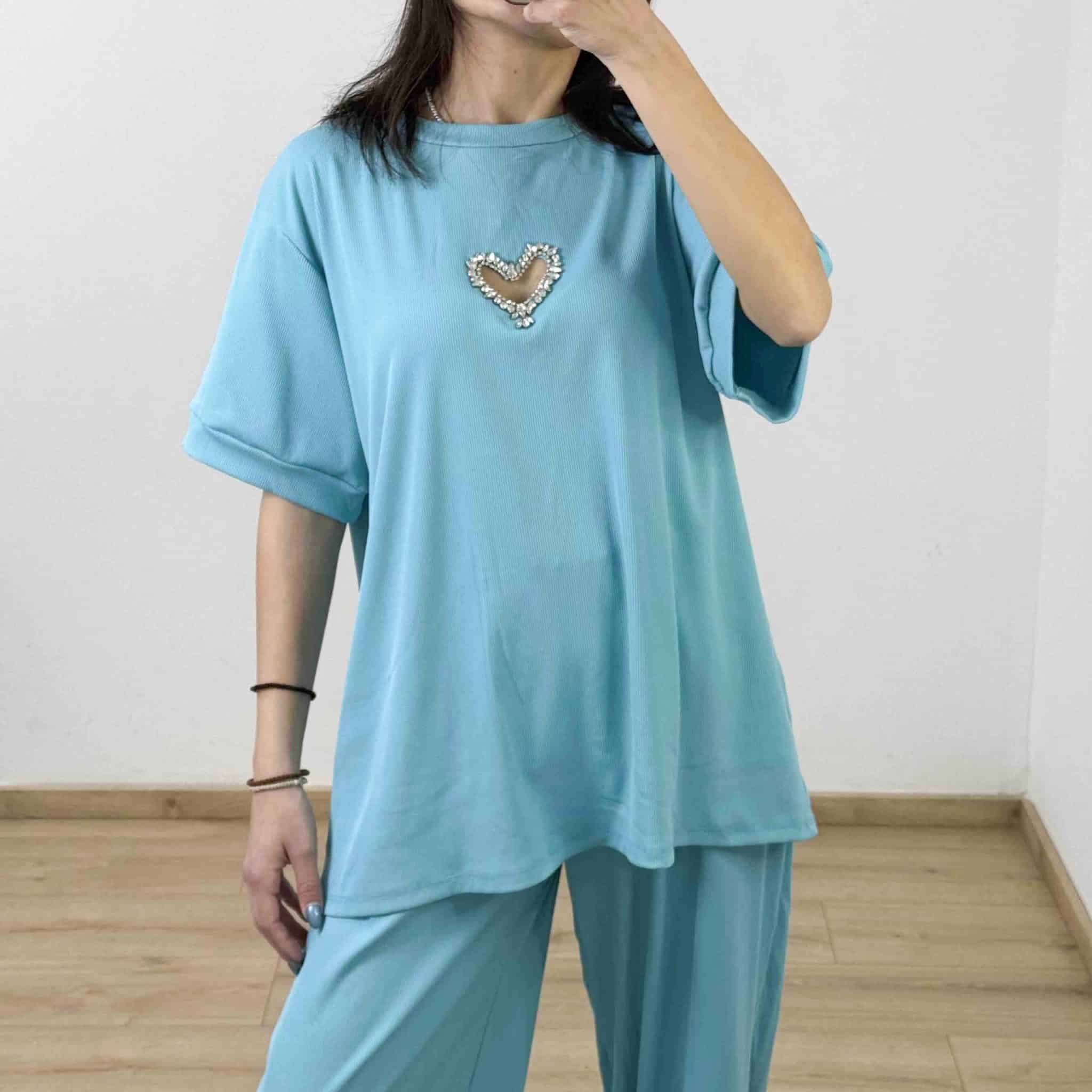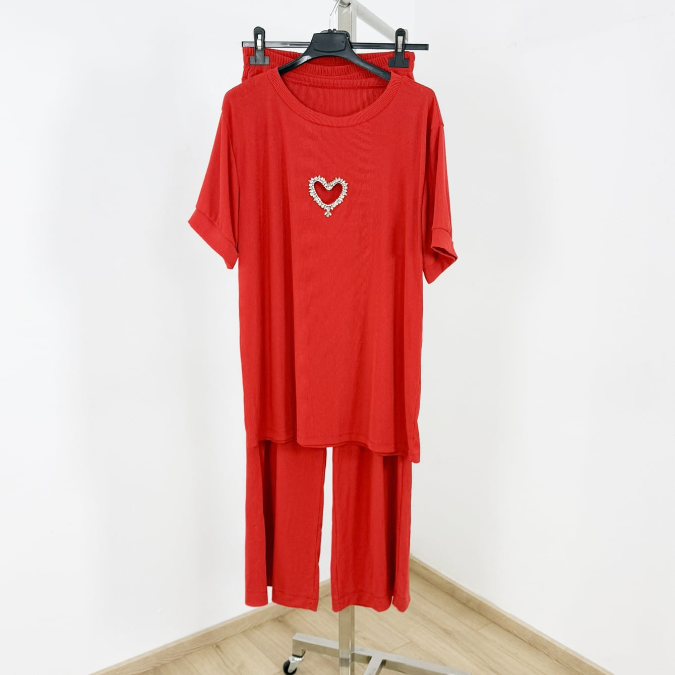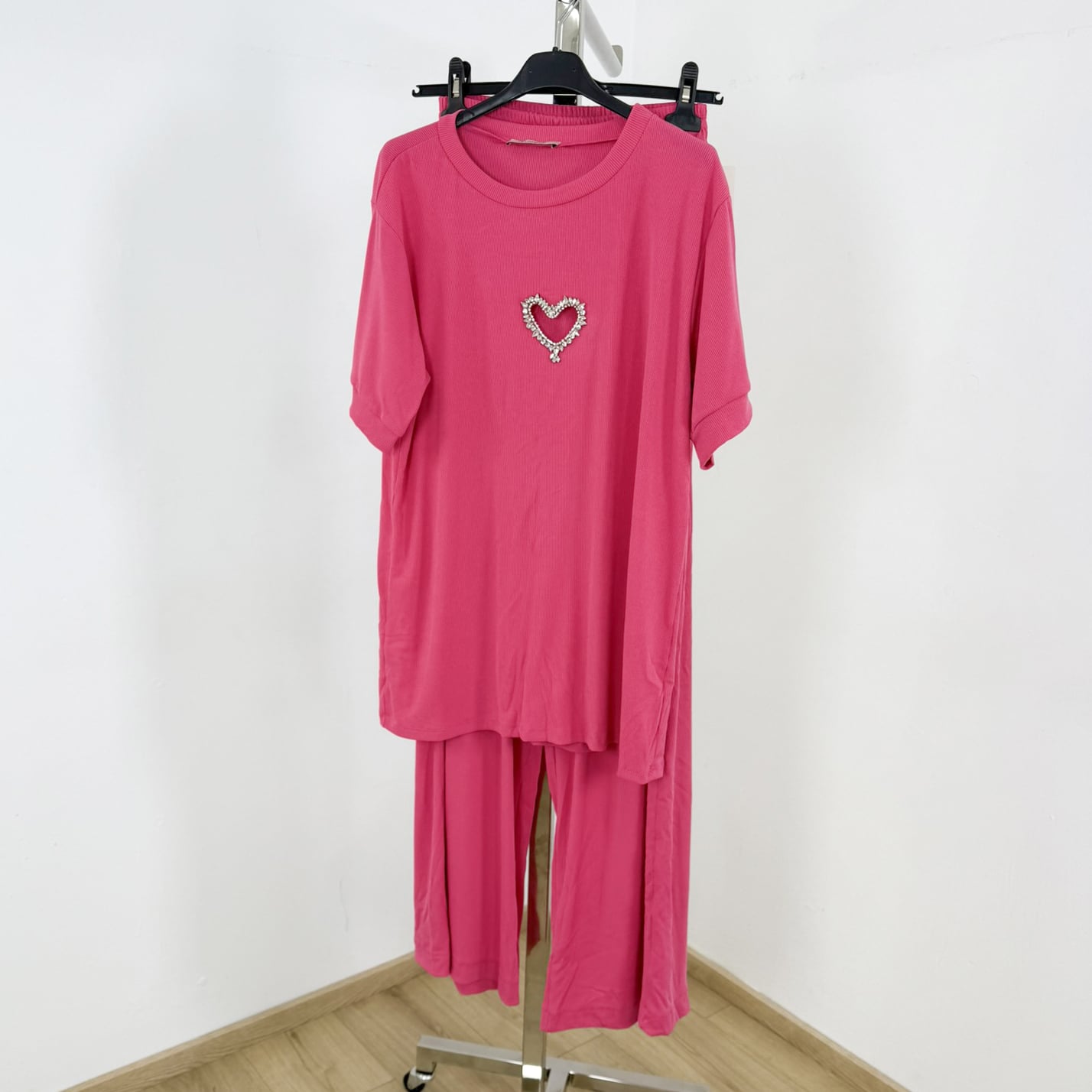 Stay cute and comfy in this heart patch oversized loungewear set, available in a range of soft, pastel and bold colors. Featuring a relaxed-fit T-shirt with sparkling rhinestone heart detail and wide-leg matching pants, this set is perfect for lounging at home, casual outings, or travel days. Chic, cozy, and effortlessly stylish.
