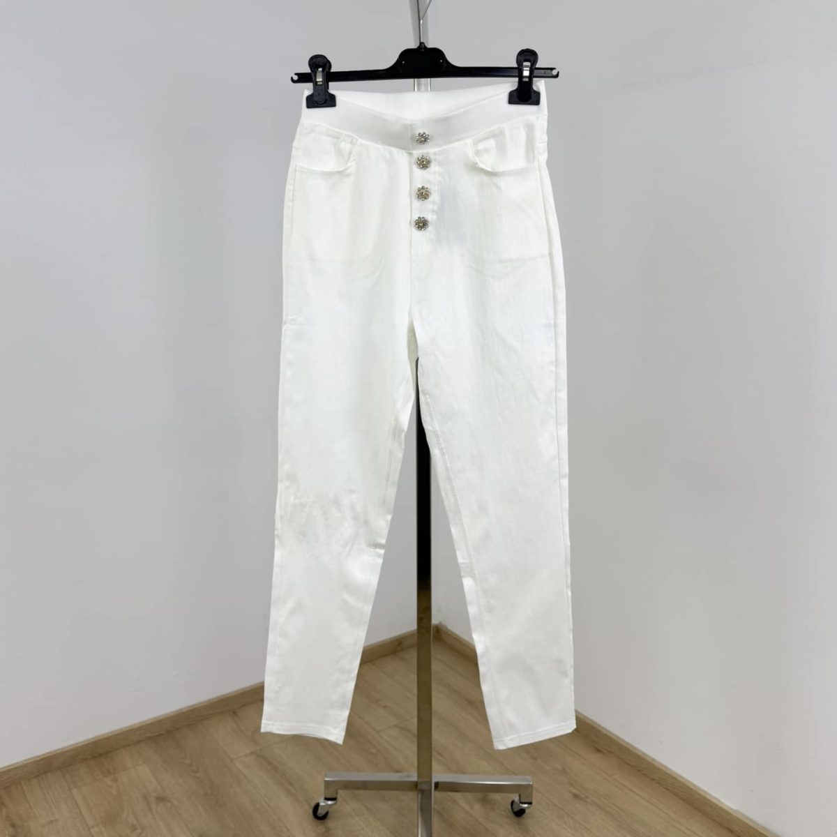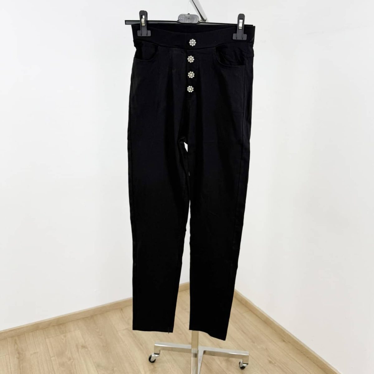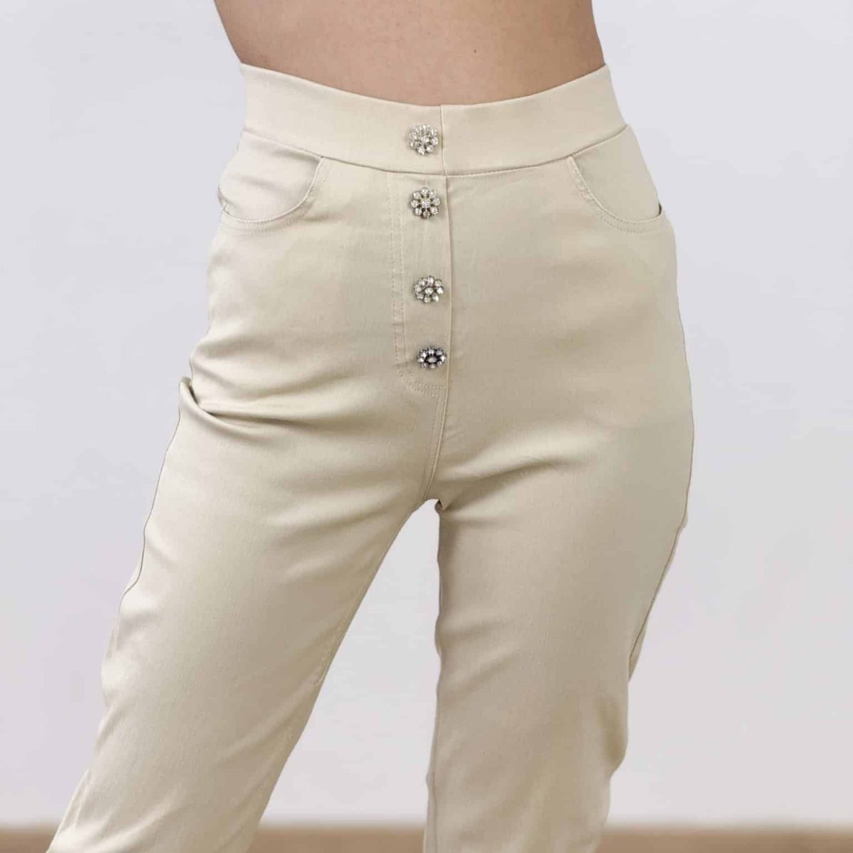 High-Waisted Slim Fit Pants with Crystal Button Detail