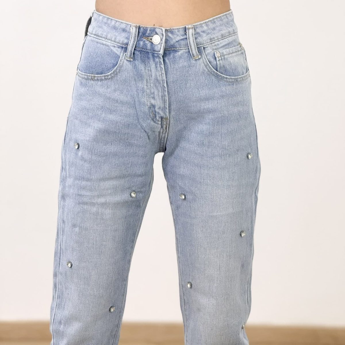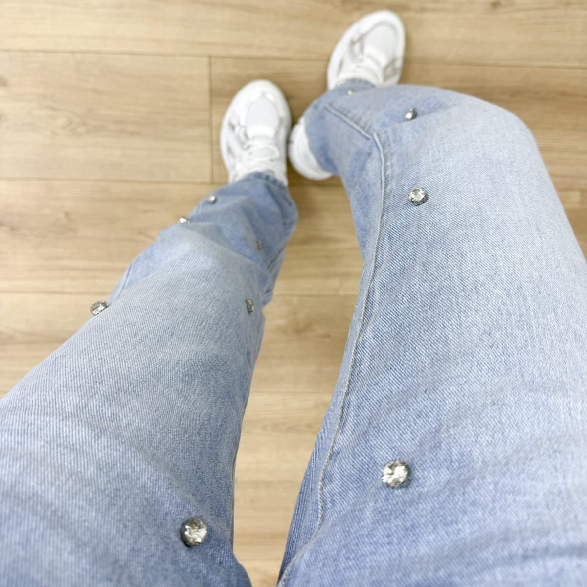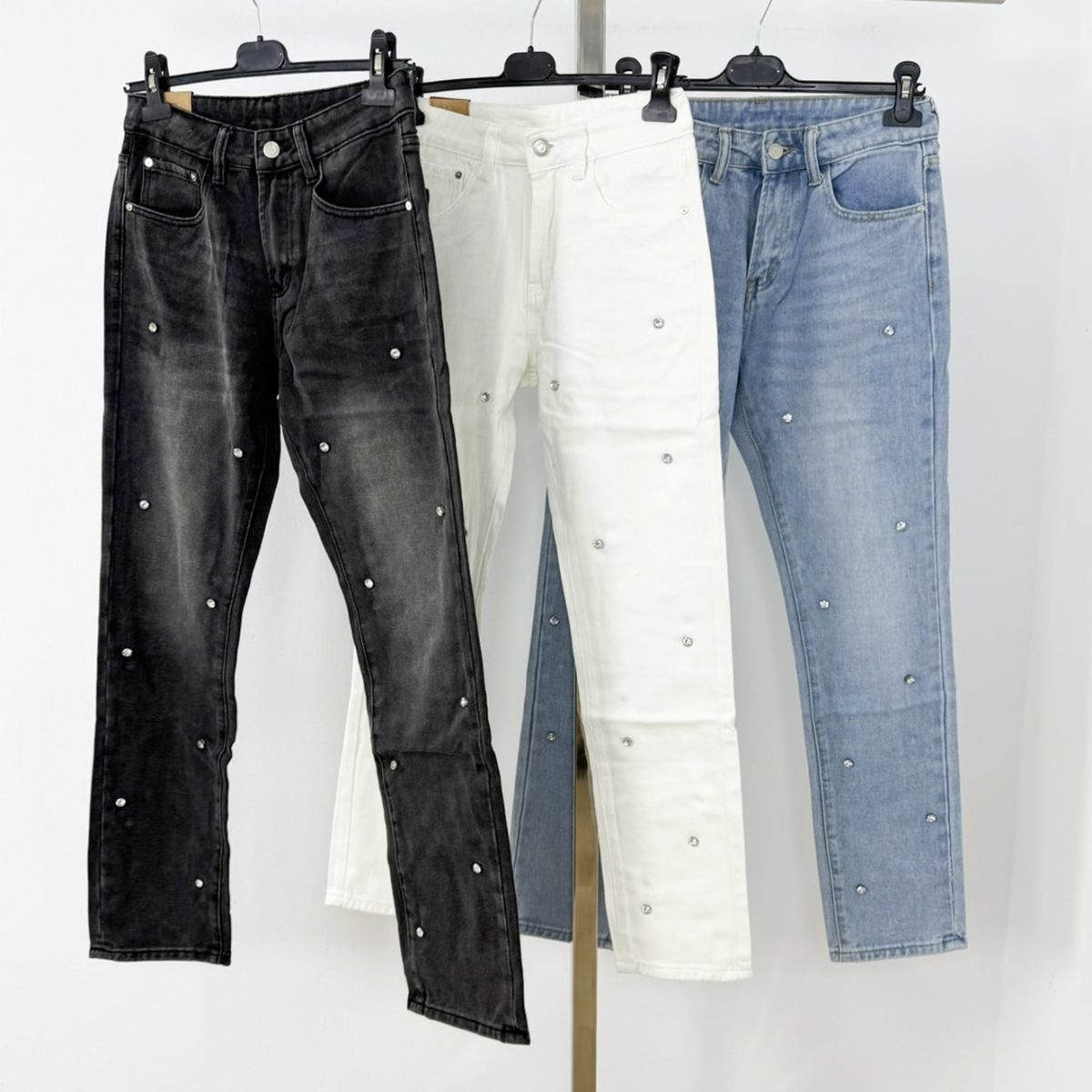 Add a sparkling twist to your everyday denim with these high-waisted straight jeans, embellished with rhinestone accents for a touch of glam. Available in light blue, black, and white washes, they offer a flattering fit and elevate any casual outfit.
