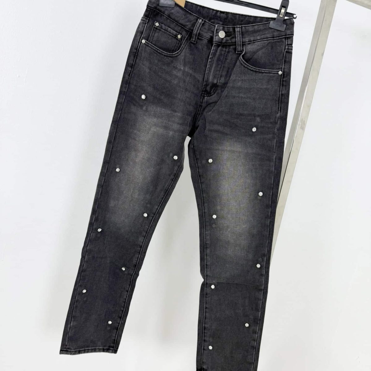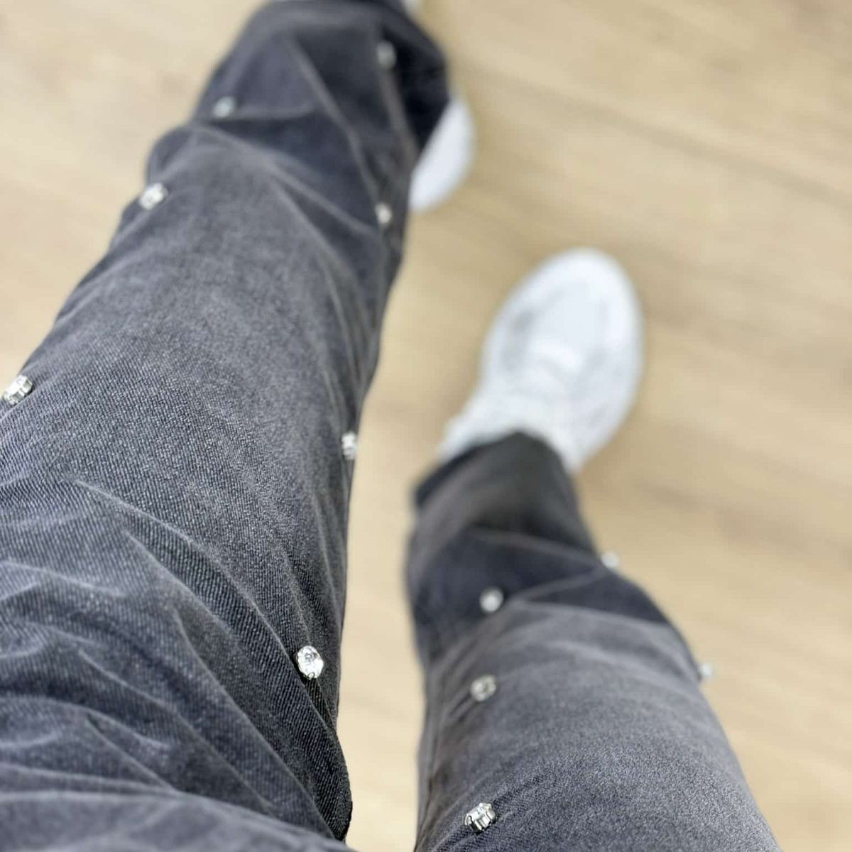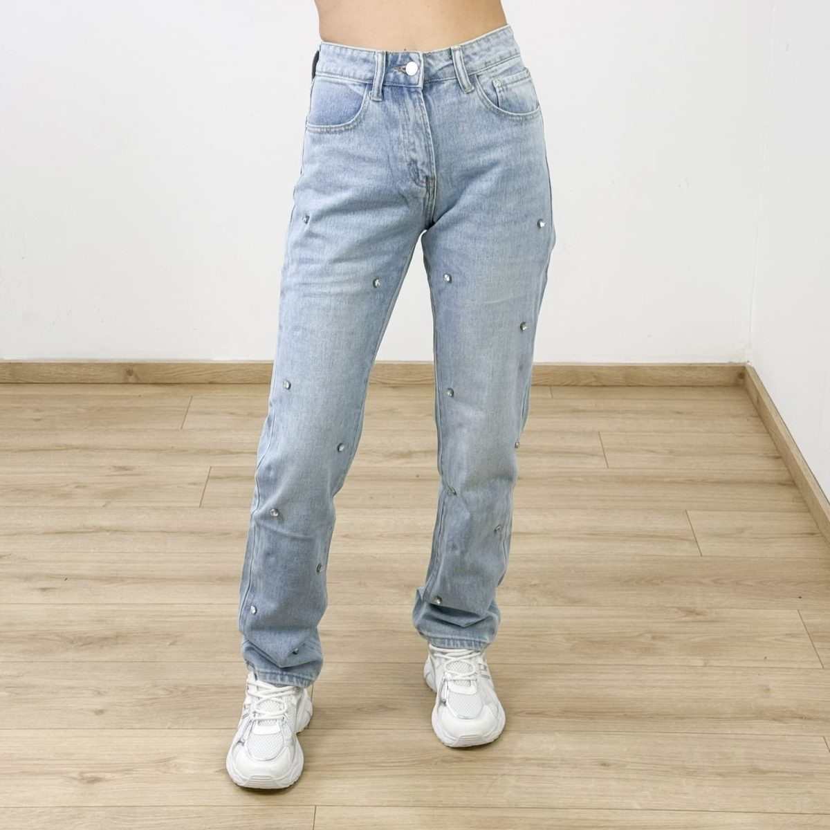 Add a sparkling twist to your everyday denim with these high-waisted straight jeans, embellished with rhinestone accents for a touch of glam. Available in light blue, black, and white washes, they offer a flattering fit and elevate any casual outfit.